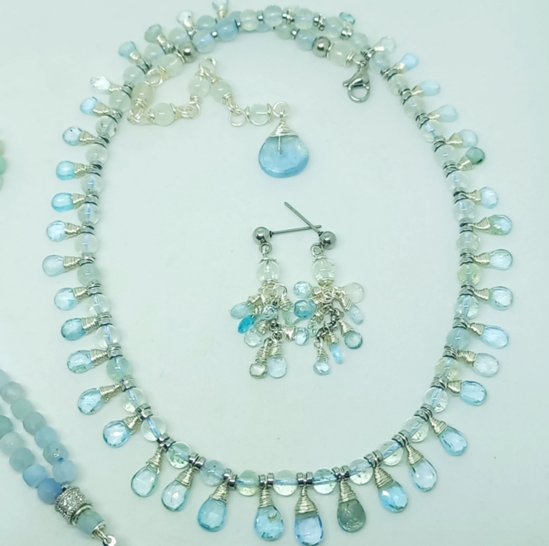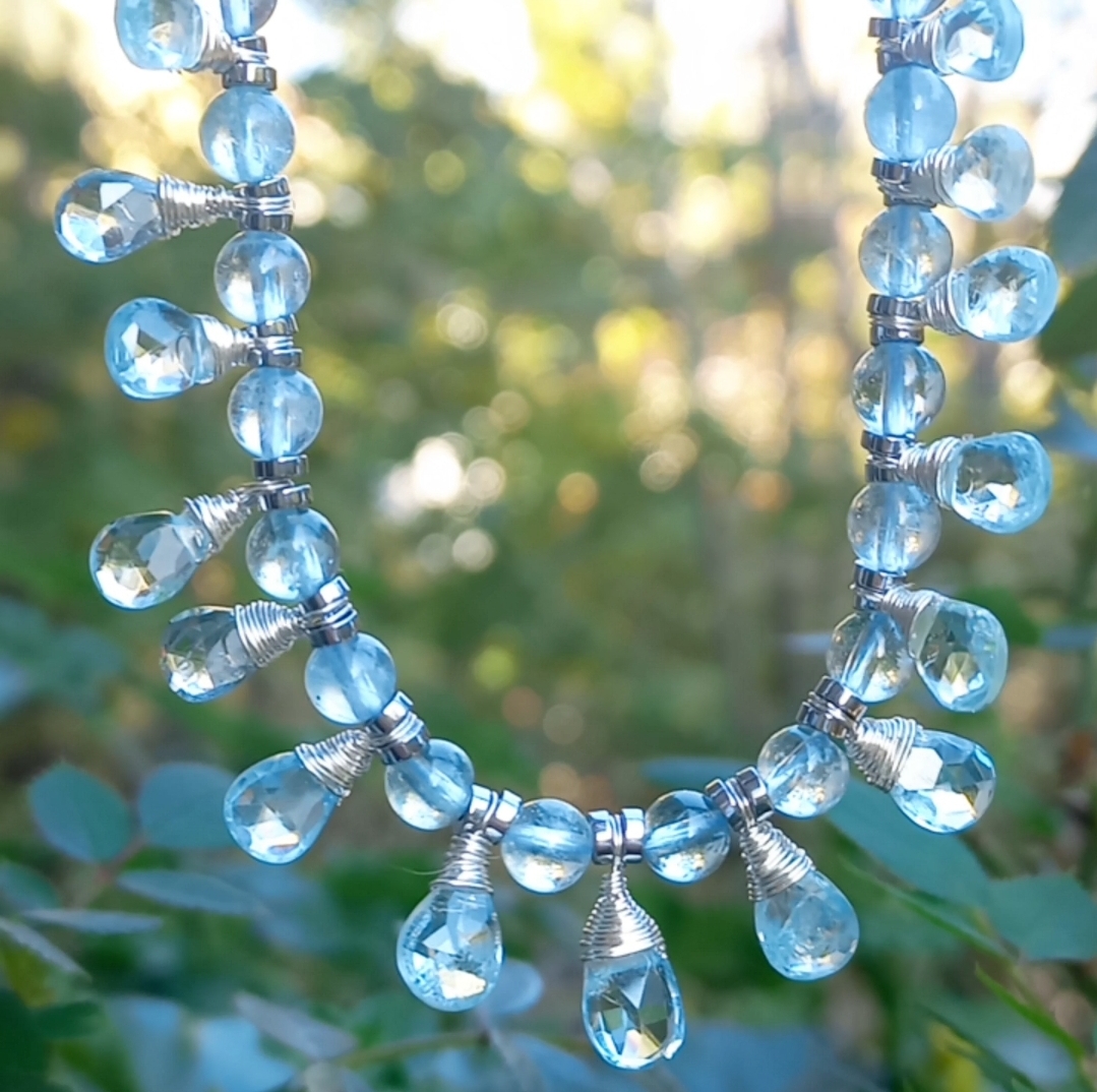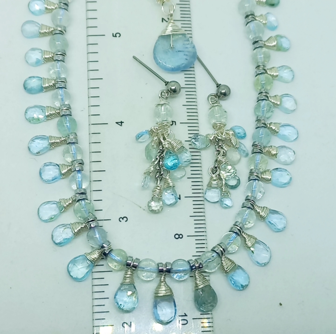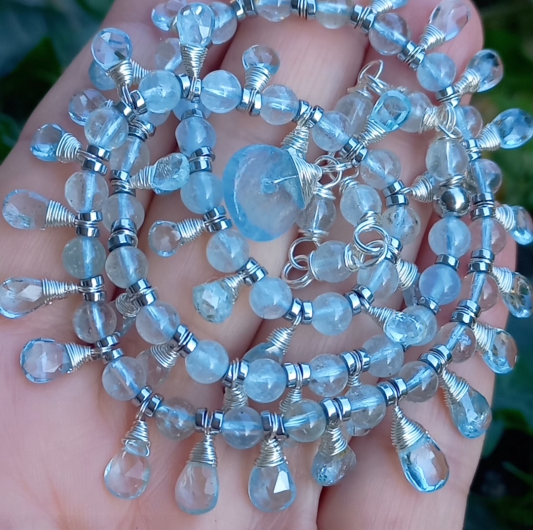 Faset kesimli damla Akuamarin taşlar; beş milim ebatlı Akuamarin, Hematit taşlar ile beraber çalışılarak, çelik aparat ve gümüş kaplama materyaller ile 45 cm uzunluğunda tasarlanmış EL YAPIMI kolye.