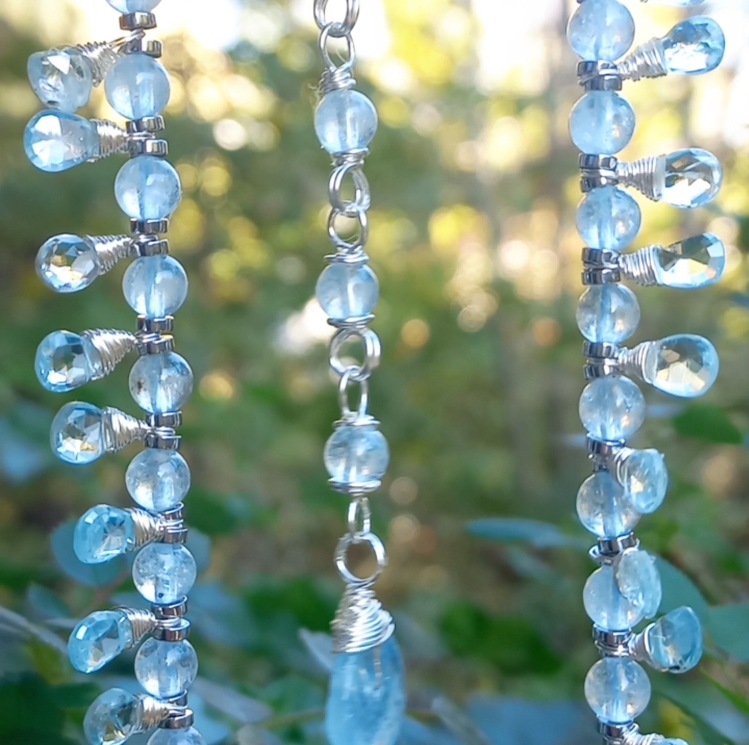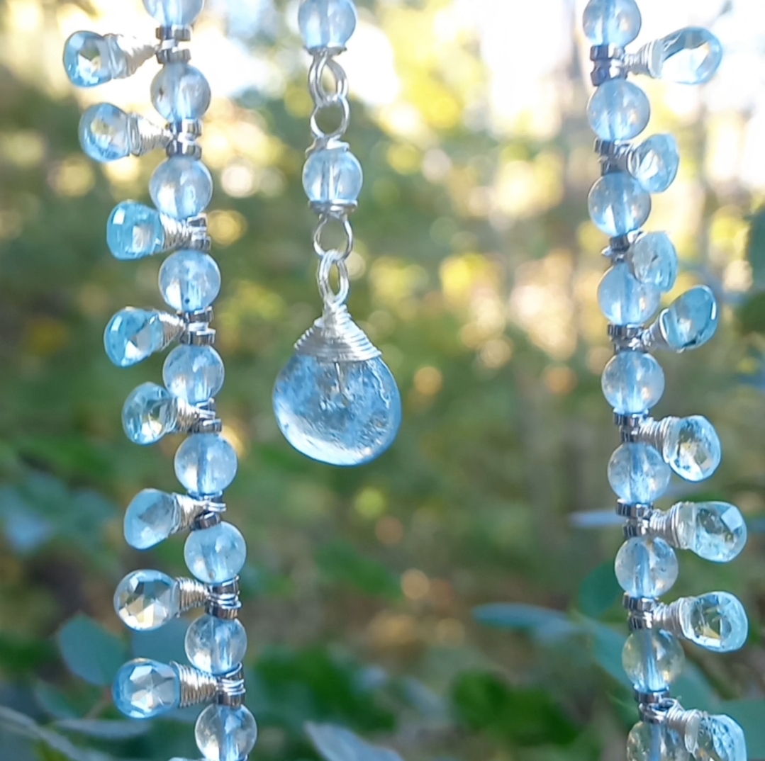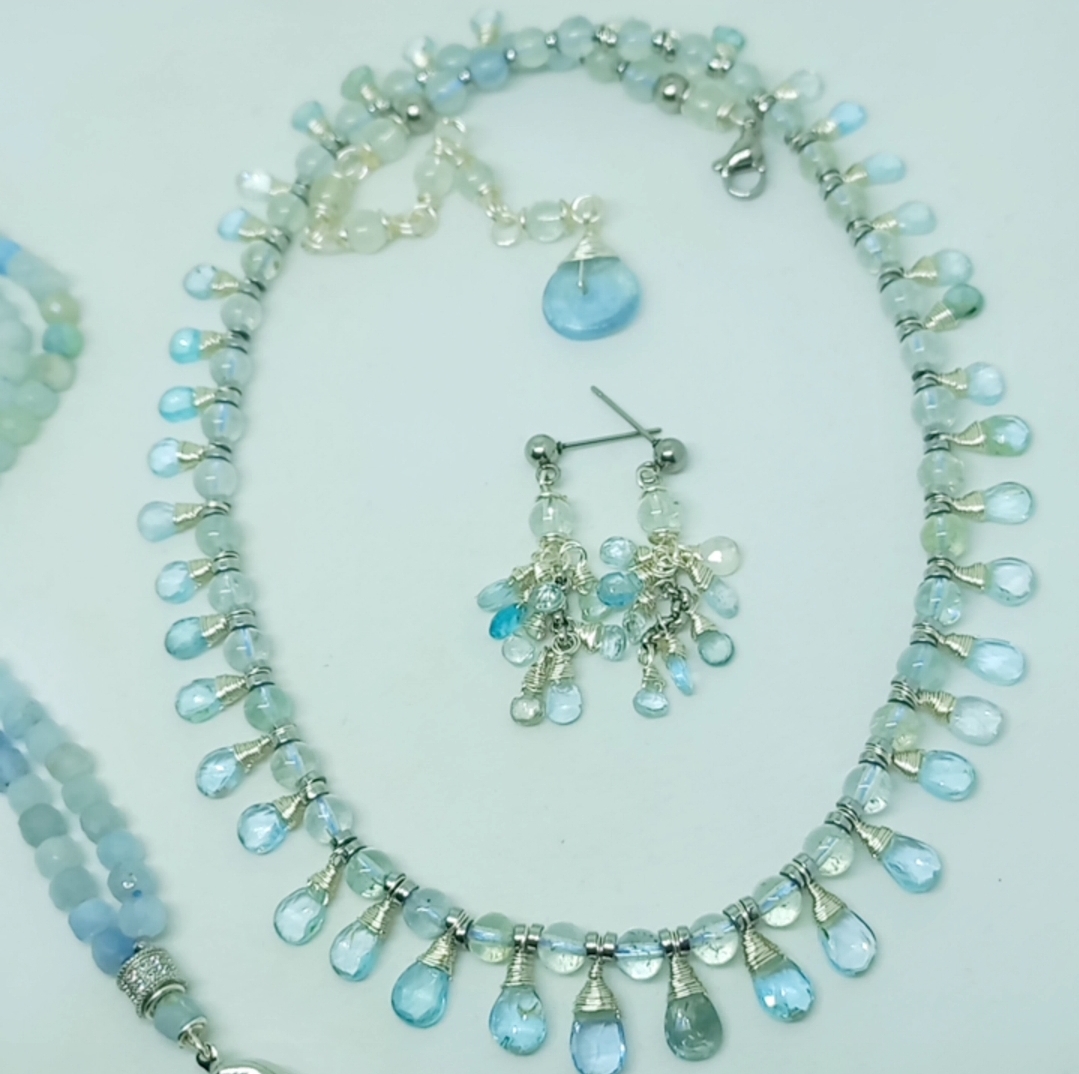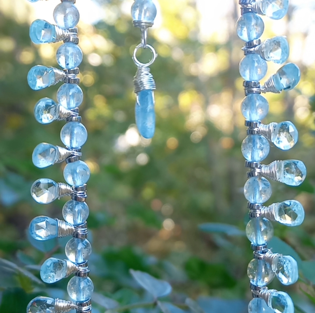 Faset kesimli damla Akuamarin taşlar; beş milim ebatlı Akuamarin, Hematit taşlar ile beraber çalışılarak, çelik aparat ve gümüş kaplama materyaller ile 45 cm uzunluğunda tasarlanmış EL YAPIMI kolye.