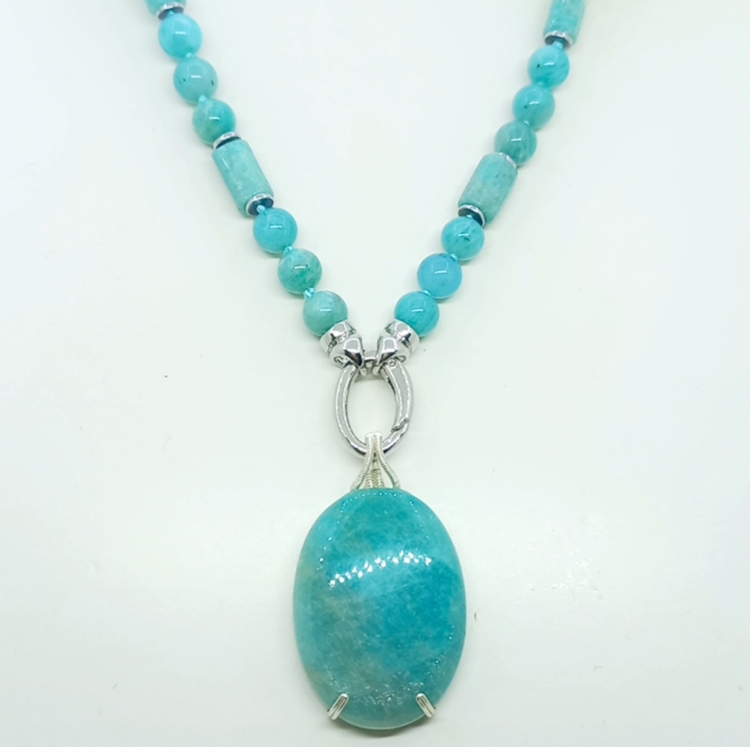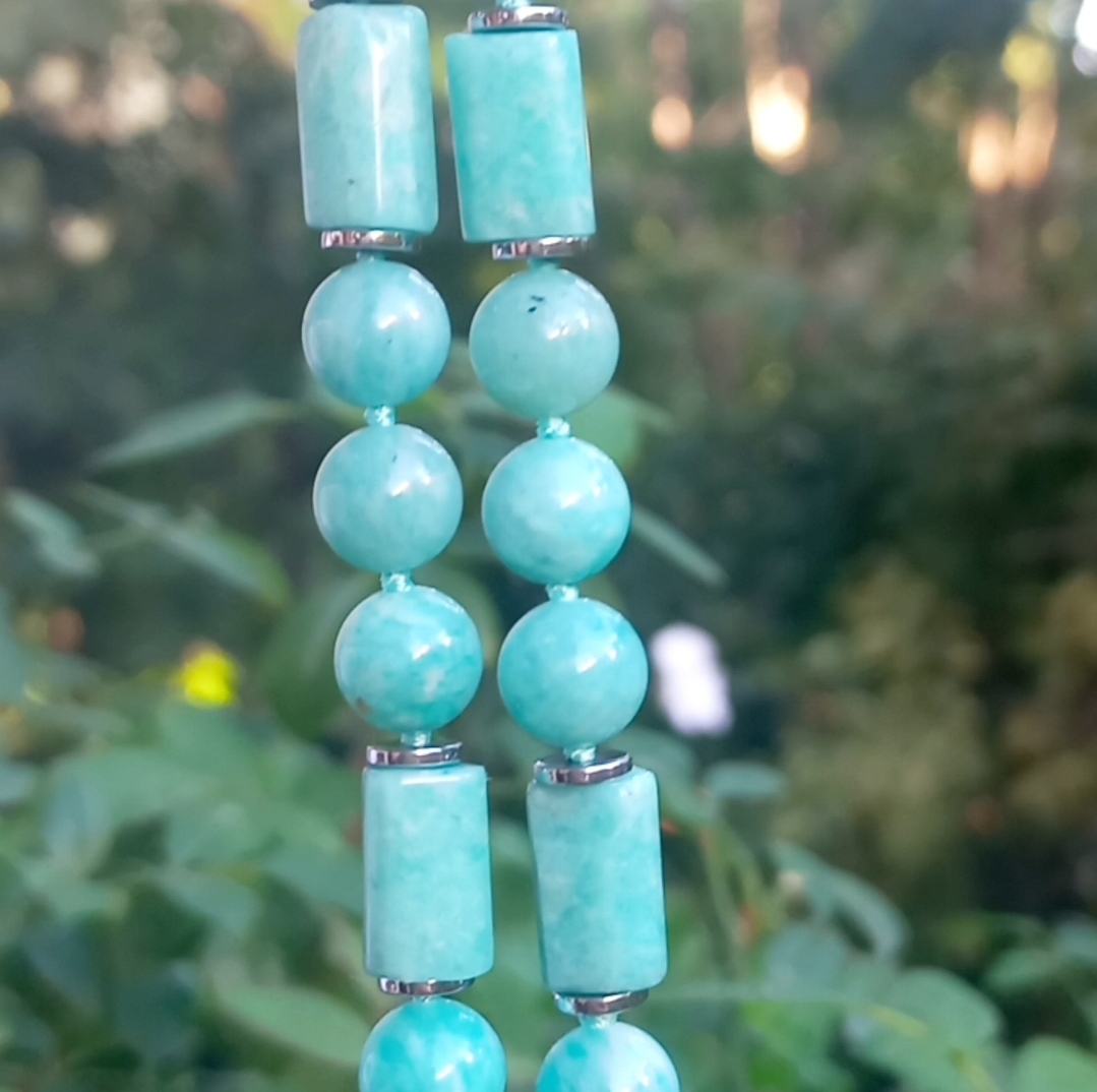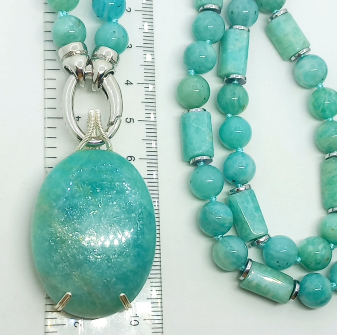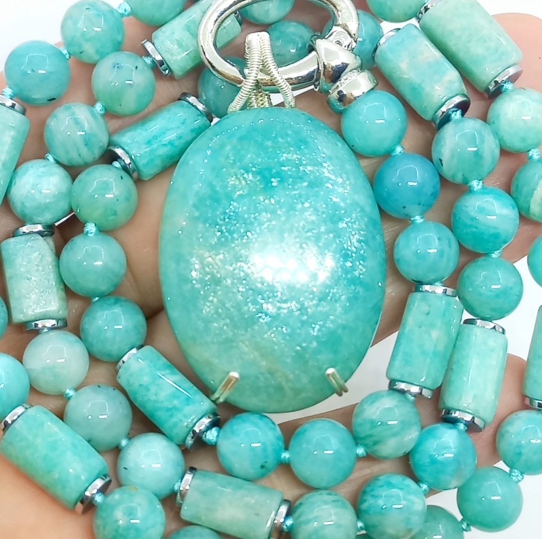 Amazonit kolye uç; silindir ve sekiz milim ebatlı Amazonit ve Hematit taşlar düğüm tekniğiyle dizilip, el yapımı gümüş kaplama ” T ” kapama eklenerek 62 cm uzunluğunda tasarlanıp, gümüş kaplama materyaller ile tamamlanmış EL YAPIMI düğümlü kolye.
