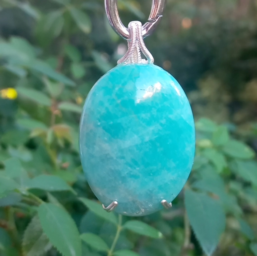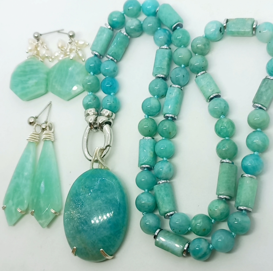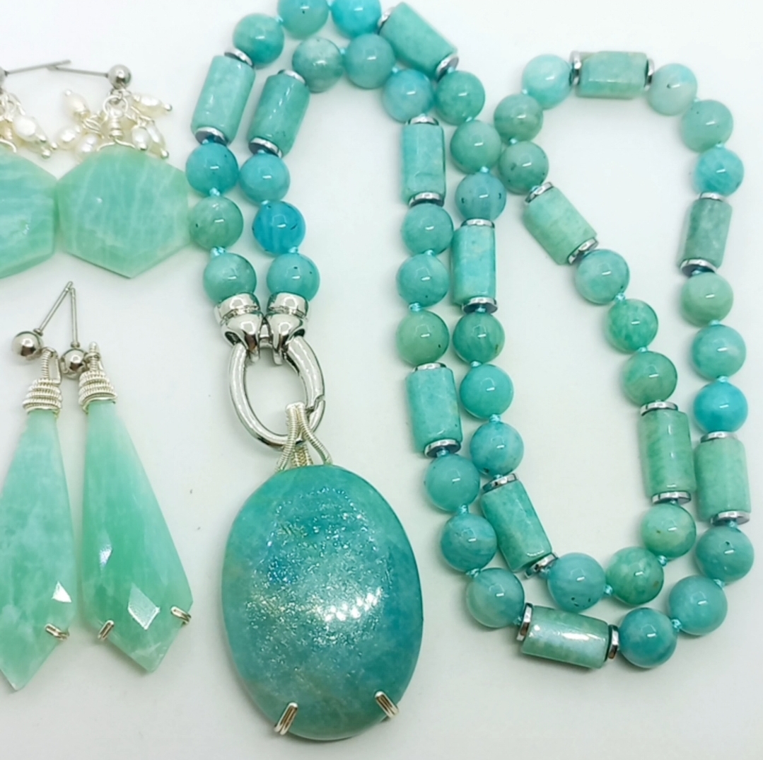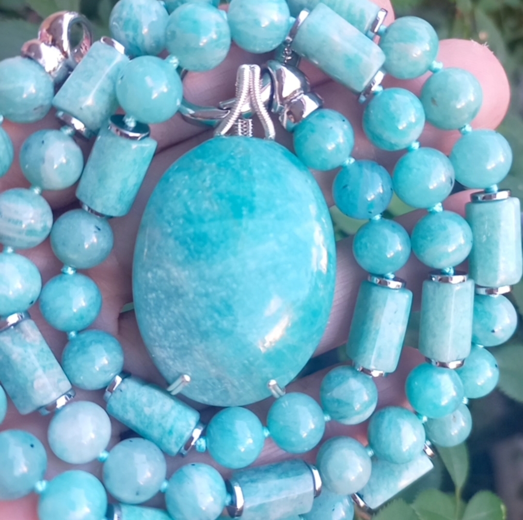 Amazonit kolye uç; silindir ve sekiz milim ebatlı Amazonit ve Hematit taşlar düğüm tekniğiyle dizilip, el yapımı gümüş kaplama ” T ” kapama eklenerek 62 cm uzunluğunda tasarlanıp, gümüş kaplama materyaller ile tamamlanmış EL YAPIMI düğümlü kolye.