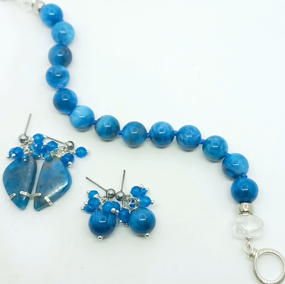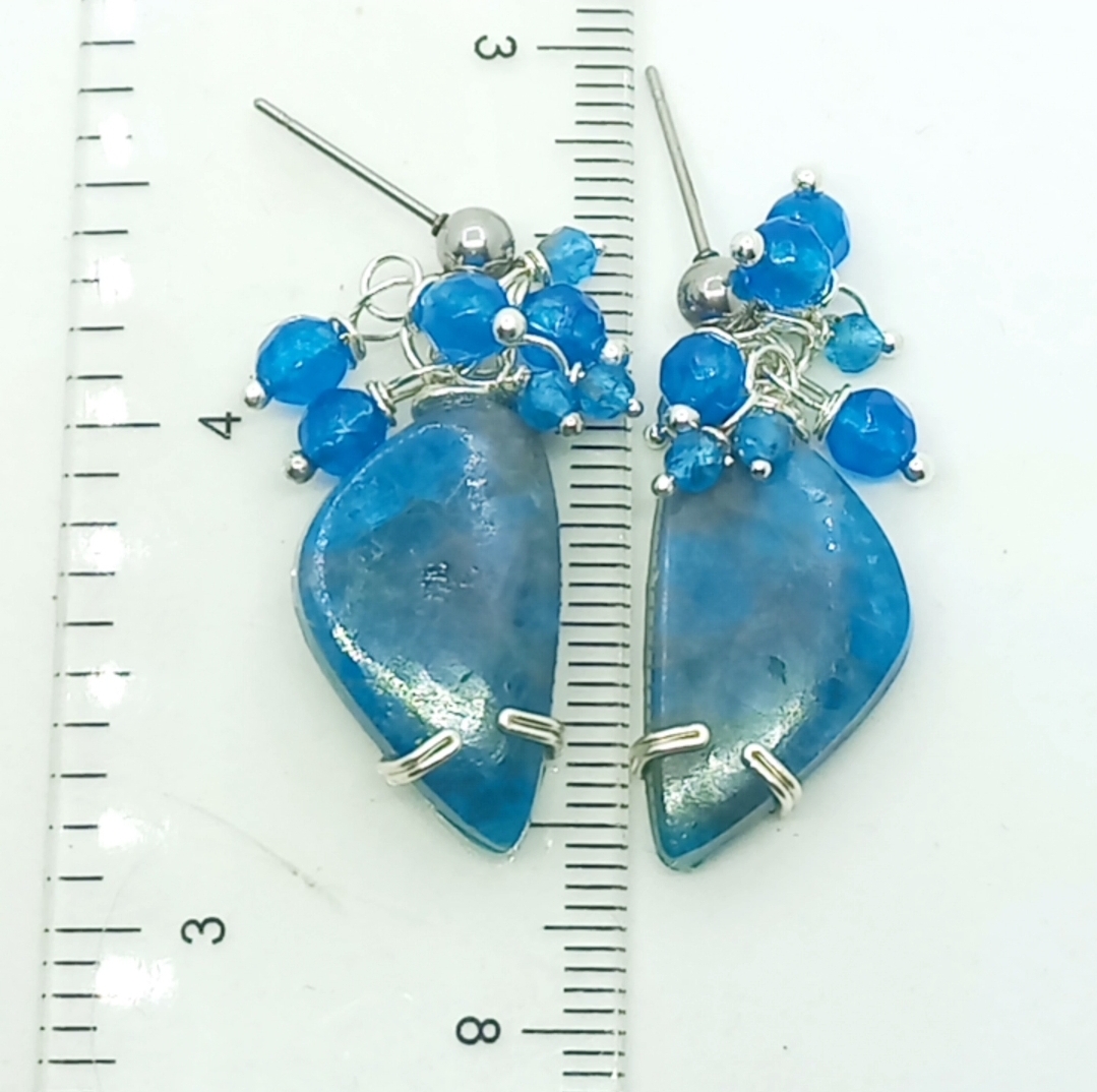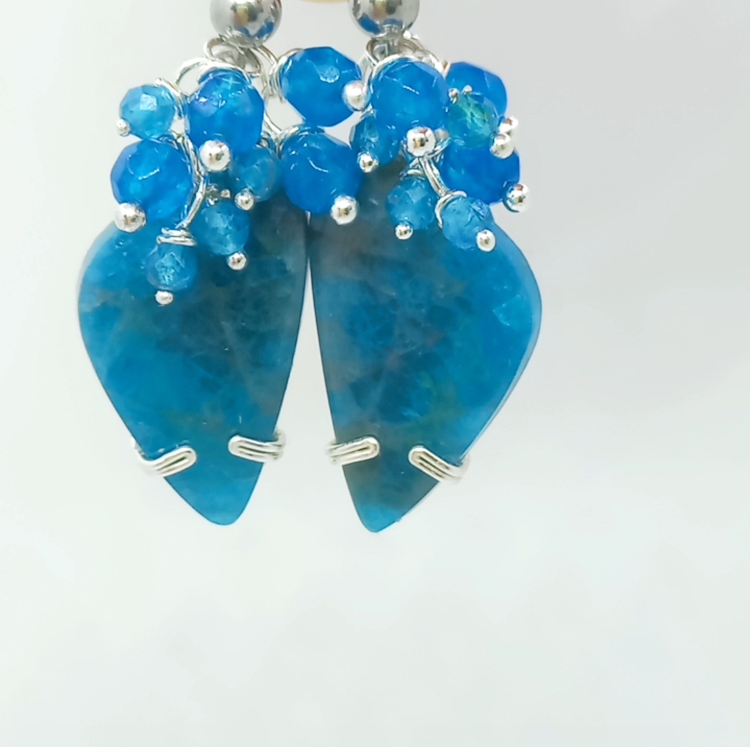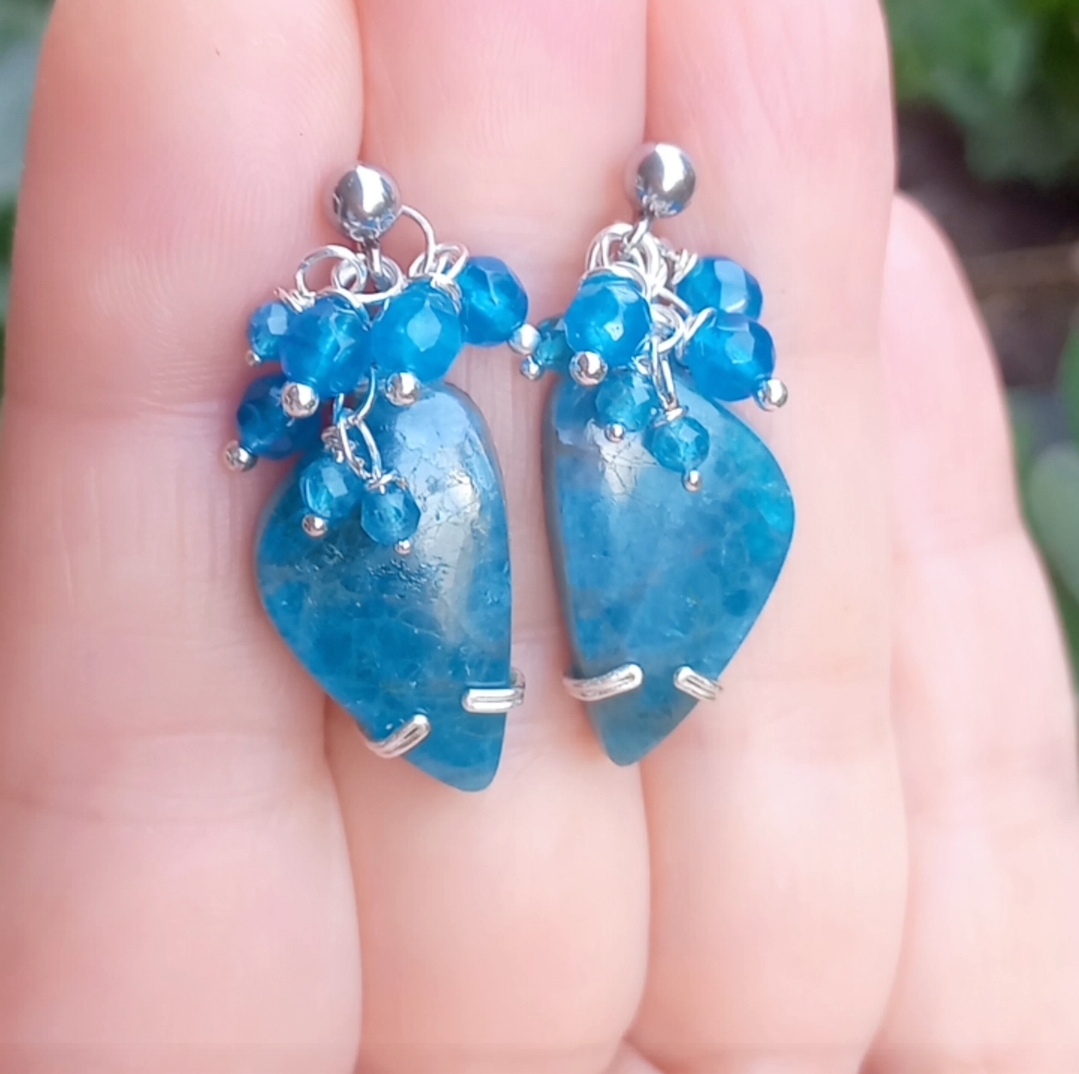 Amorf Apatit küpe taşlar; dört milim ebatlı Kuvars(renklendirilmiş), çelik aparat ve gümüş kaplama materyaller ile tasarlanmış EL YAPIMI küpe.