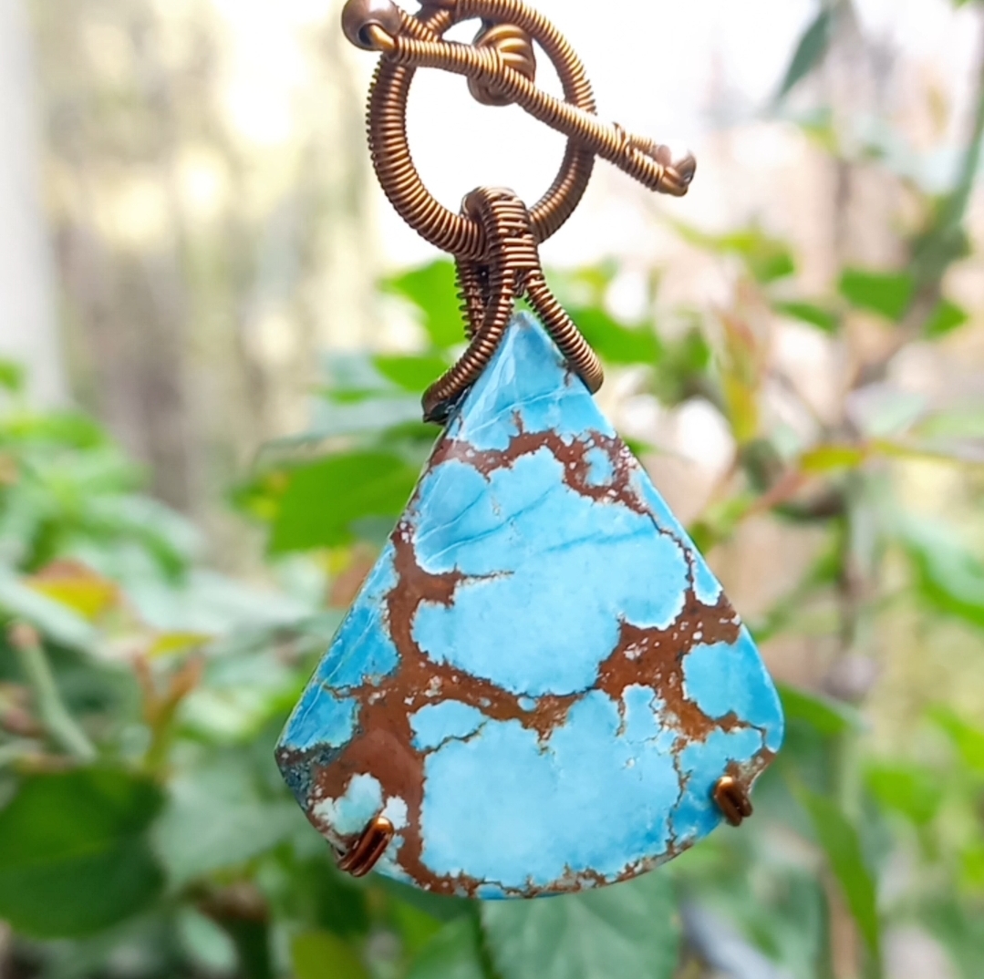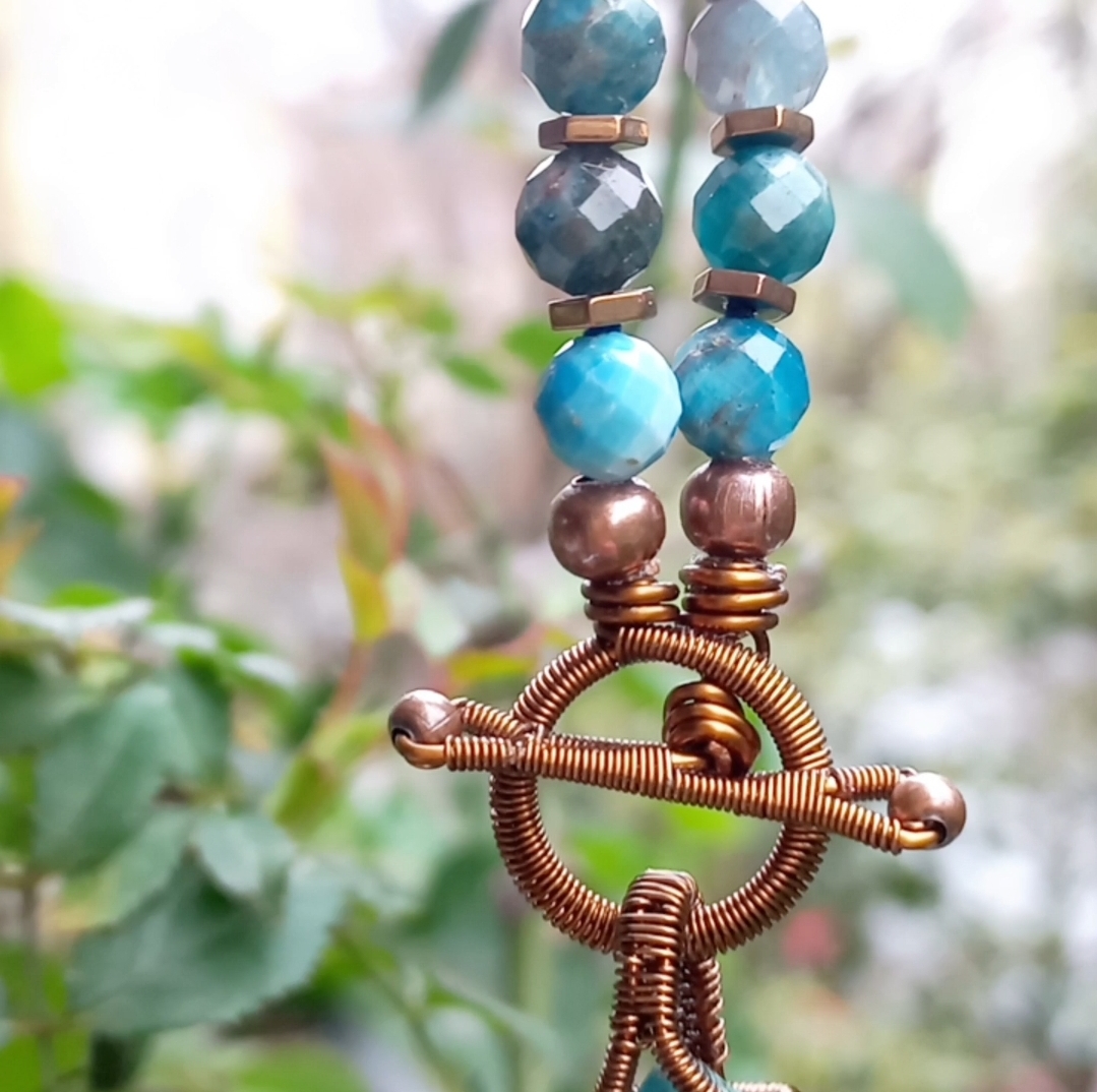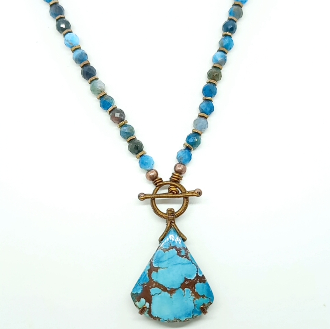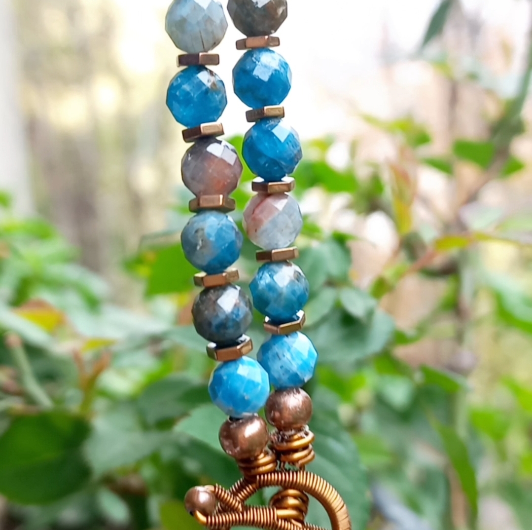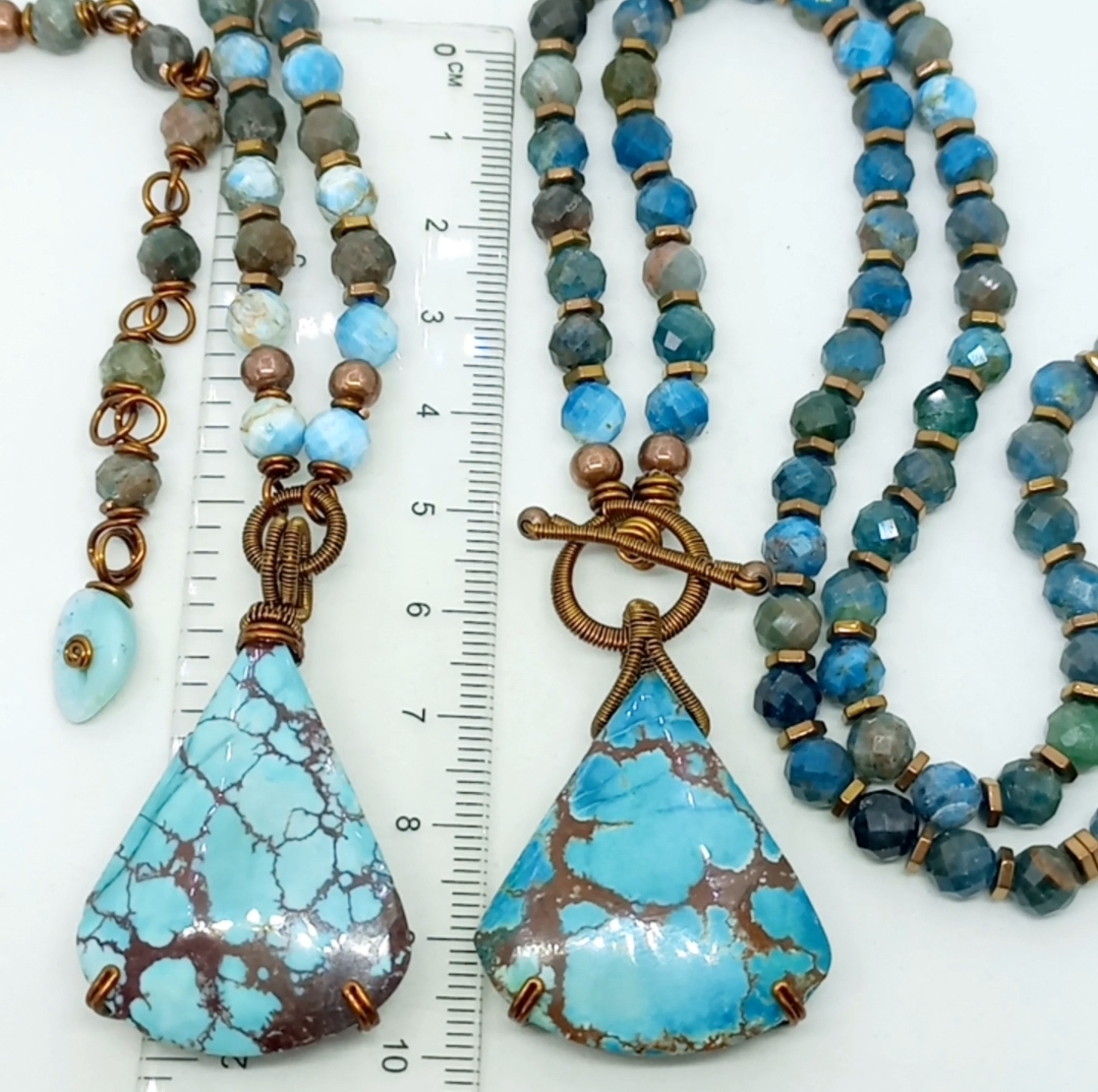 Arizona örümcek Turkuaz kolye uç; altı milim ebatlı faset kesim Apatit, Hematit taşlar ile çalışılarak el yapımı bakır kaplama ”T” kapama eklenmiş ve 50 cm uzunluğunda tasarlanmış EL YAPIMI kolye.