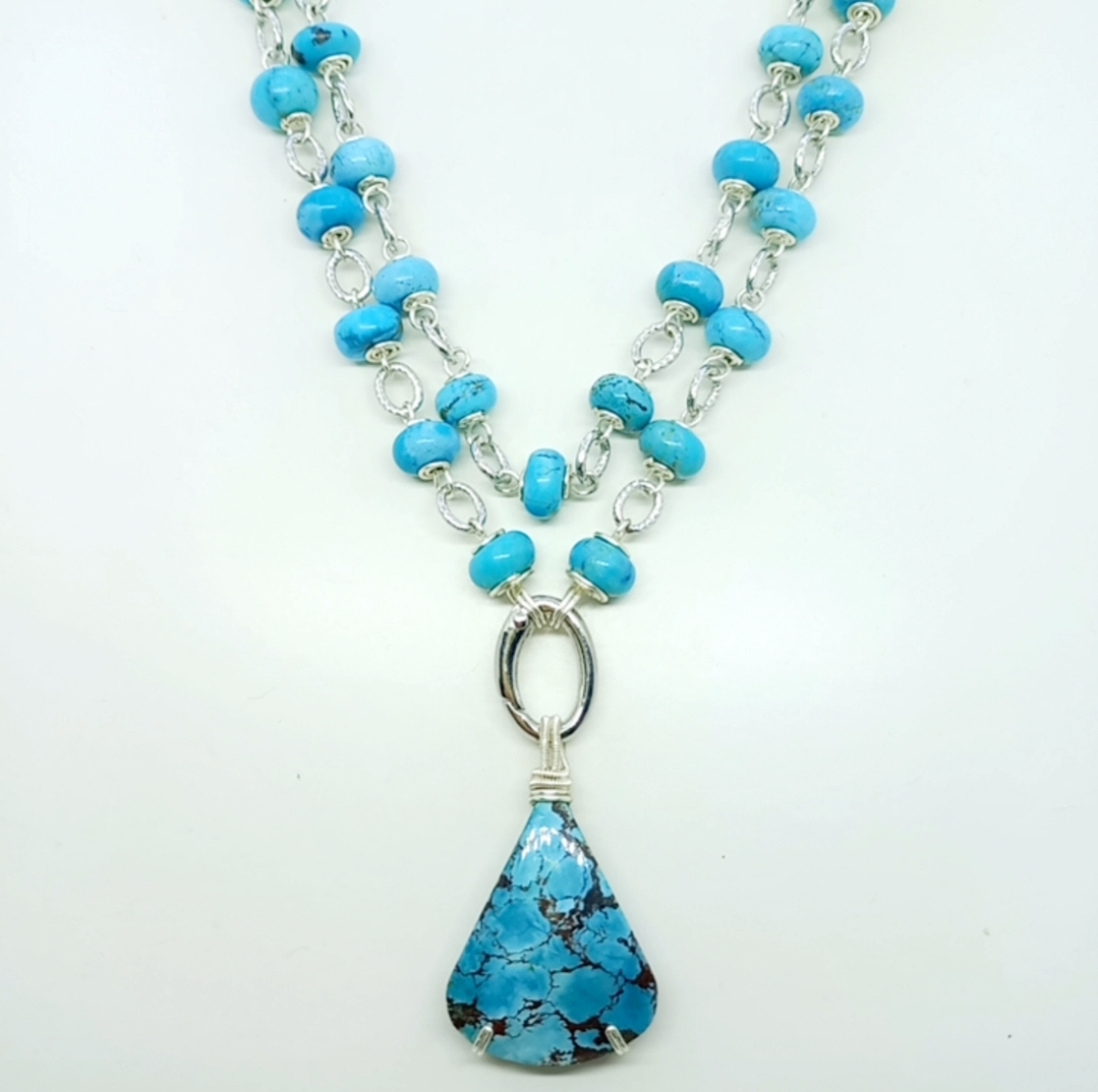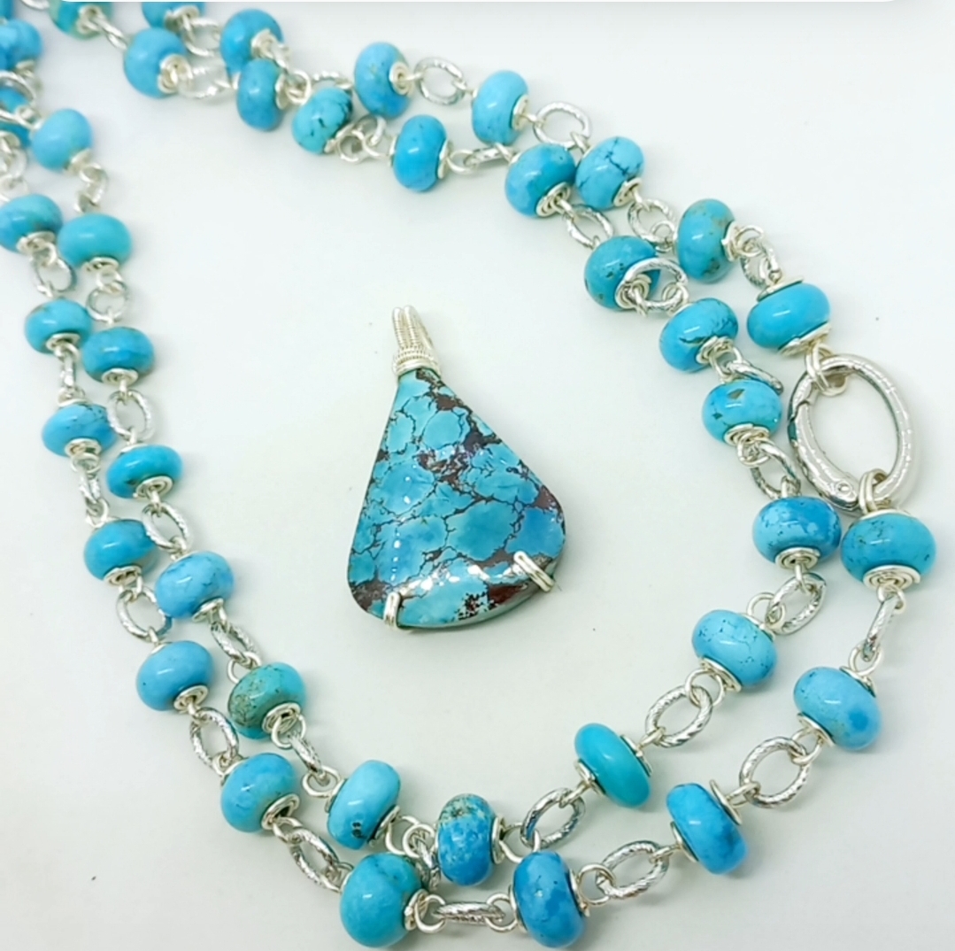 Portatif örümcek Arizona Turkuaz kolye uç; Arizona rondela Turkuaz ve gümüş kaplamalı materyaller ile birlikte çalışılarak 100 cm uzunluğunda tasarlanmış el yapımı kolye. İsteğe göre dolamalı olarak çift sıralı kolye olarak ta kullanılabilir.