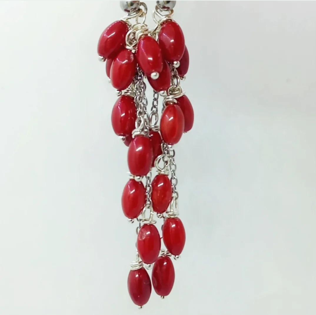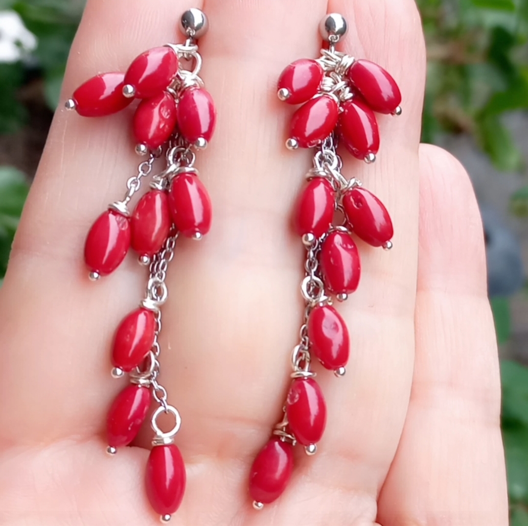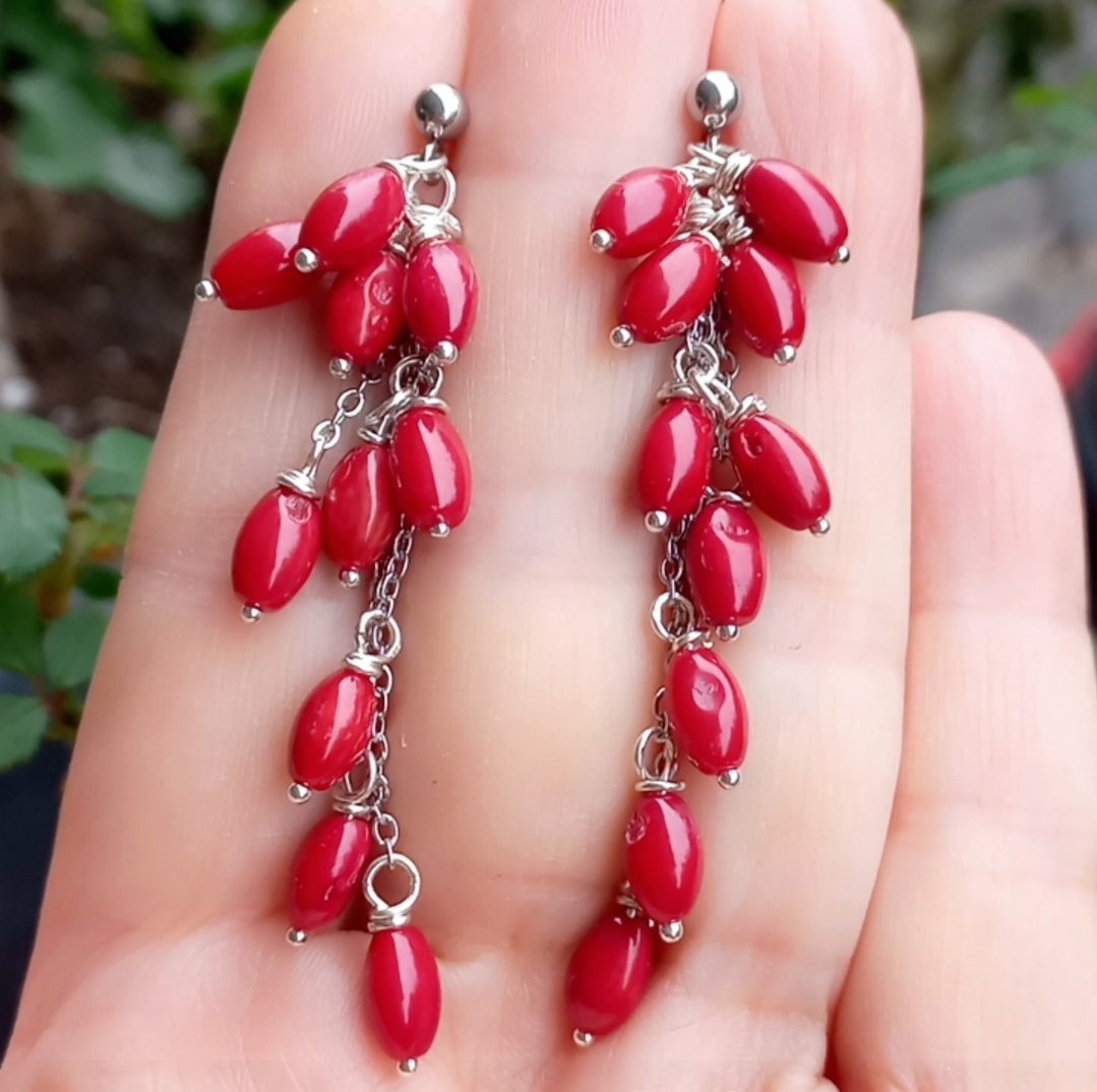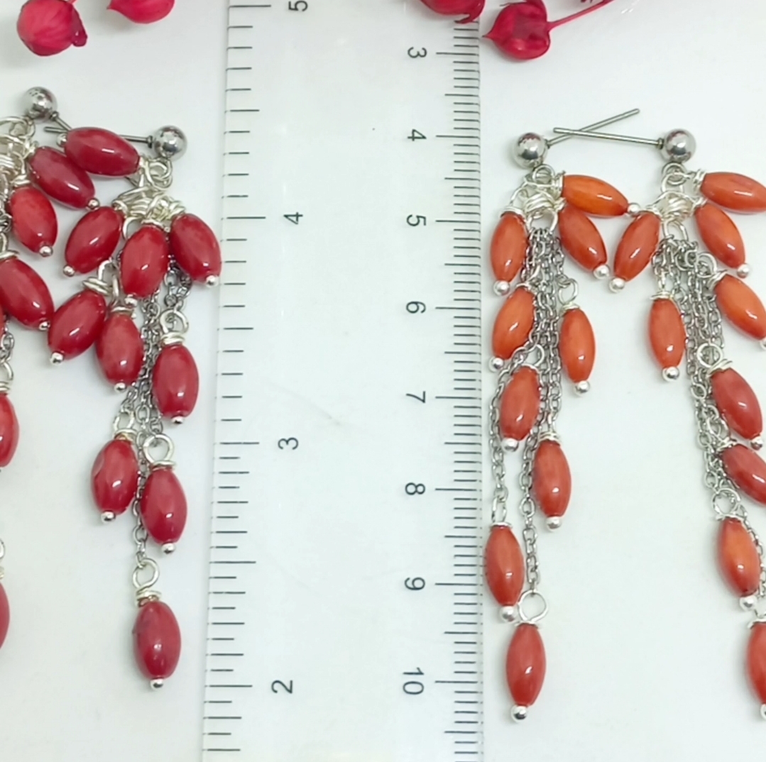 Arpa şekilli Mercan taşlar, çelik aparat ve zincir ile çalışılarak tamamlanmış EL YAPIMI küpe.