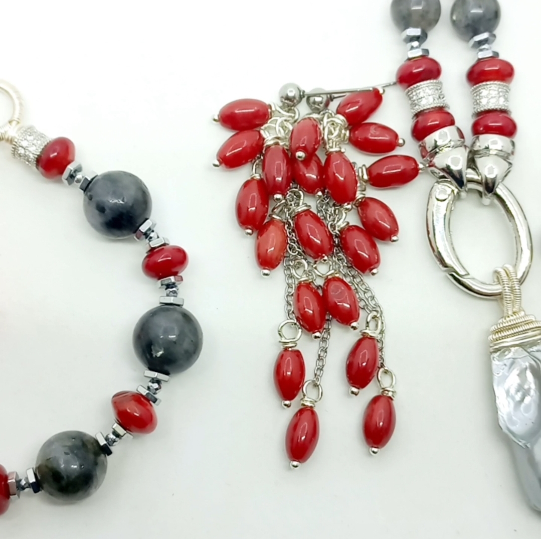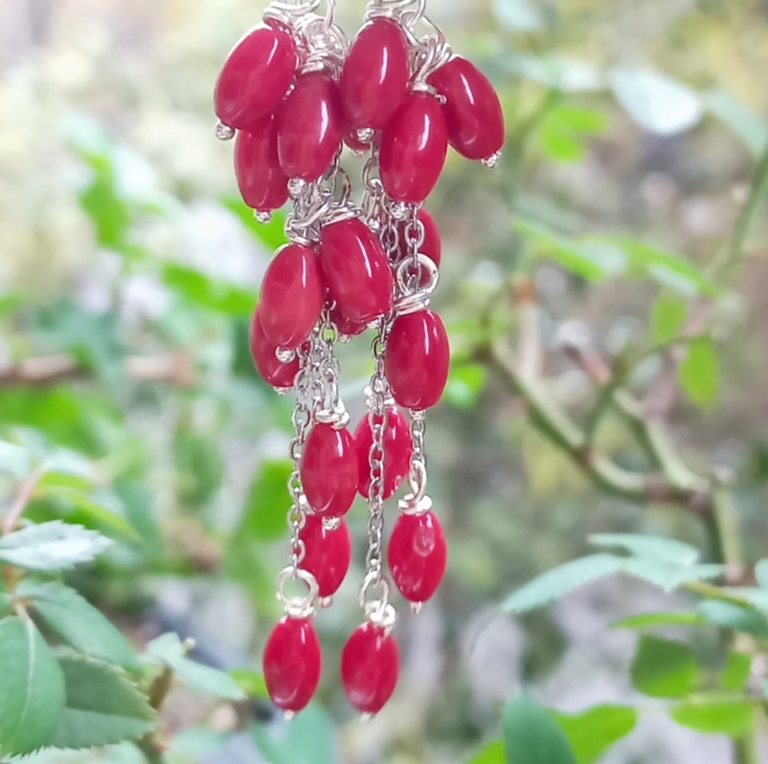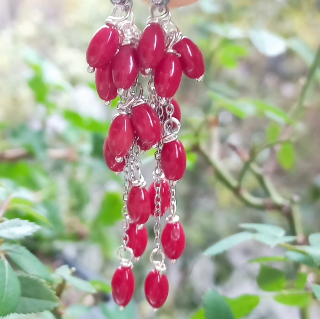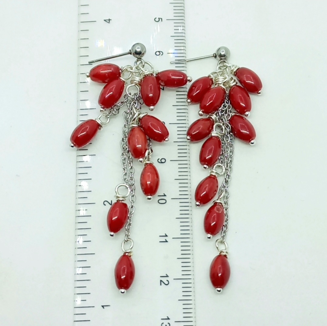 Arpa şekilli Mercan taşlar, çelik aparat ve zincir ile çalışılarak tamamlanmış EL YAPIMI küpe.