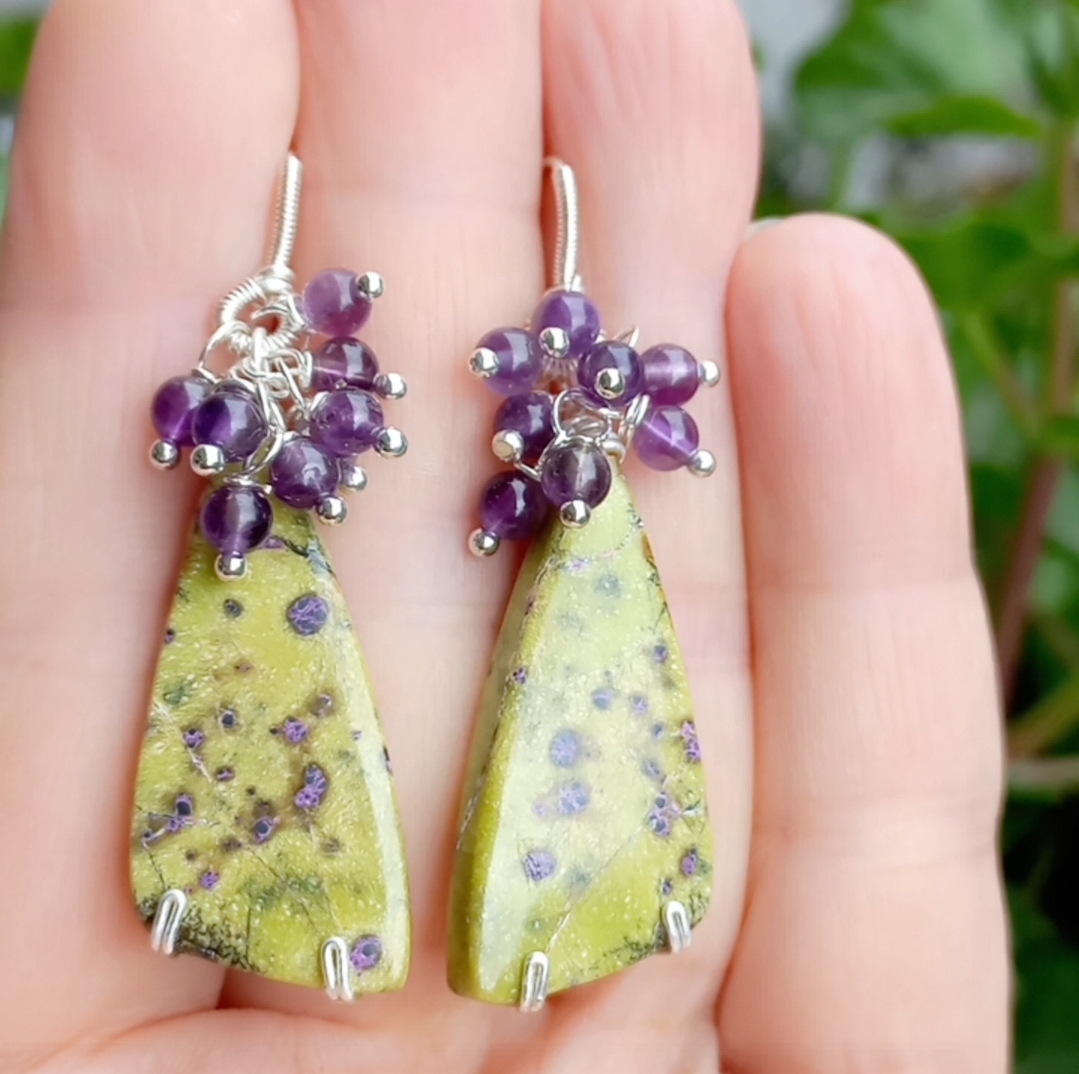 Atlantisit küpe taşlar; üç milim ebatlı Ametist dekor taşlar ve gümüş kaplama materyaller ile çalışılarak tasarlanmış EL YAPIMI küpe.