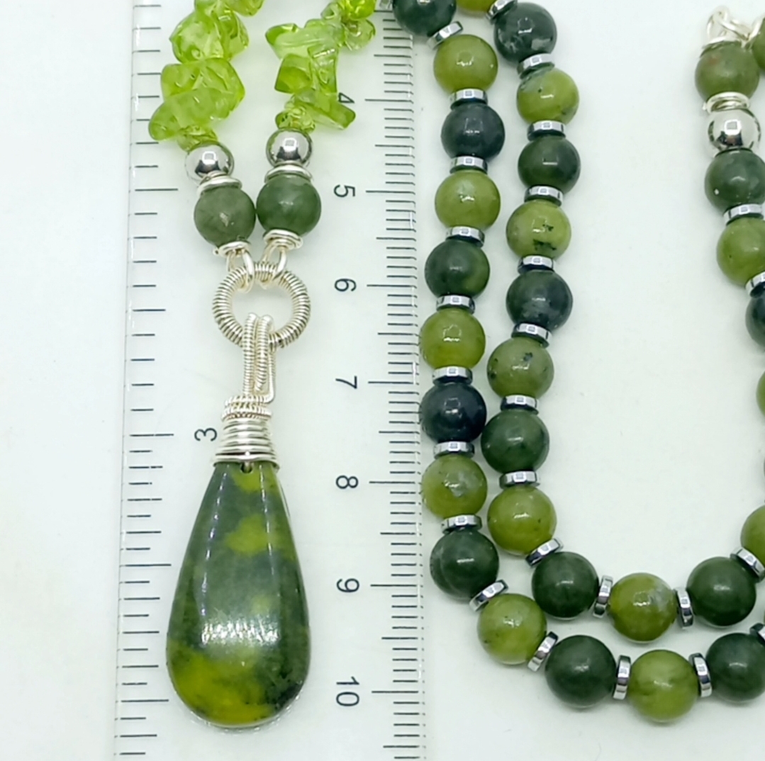 Atlantisite kolye uç; altı milim ebatlı Yeşim, amorf Zebercet, Hematit taşlar birlikte kullanılarak çelik aparat ve gümüş kaplama materyaller ile 50 cm uzunluğunda tasarlanmış EL YAPIMI kolye.