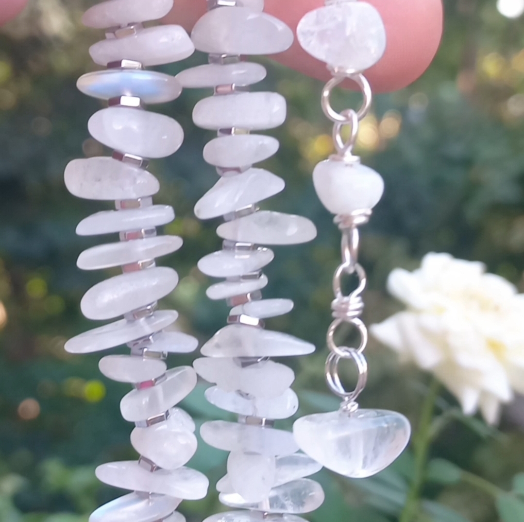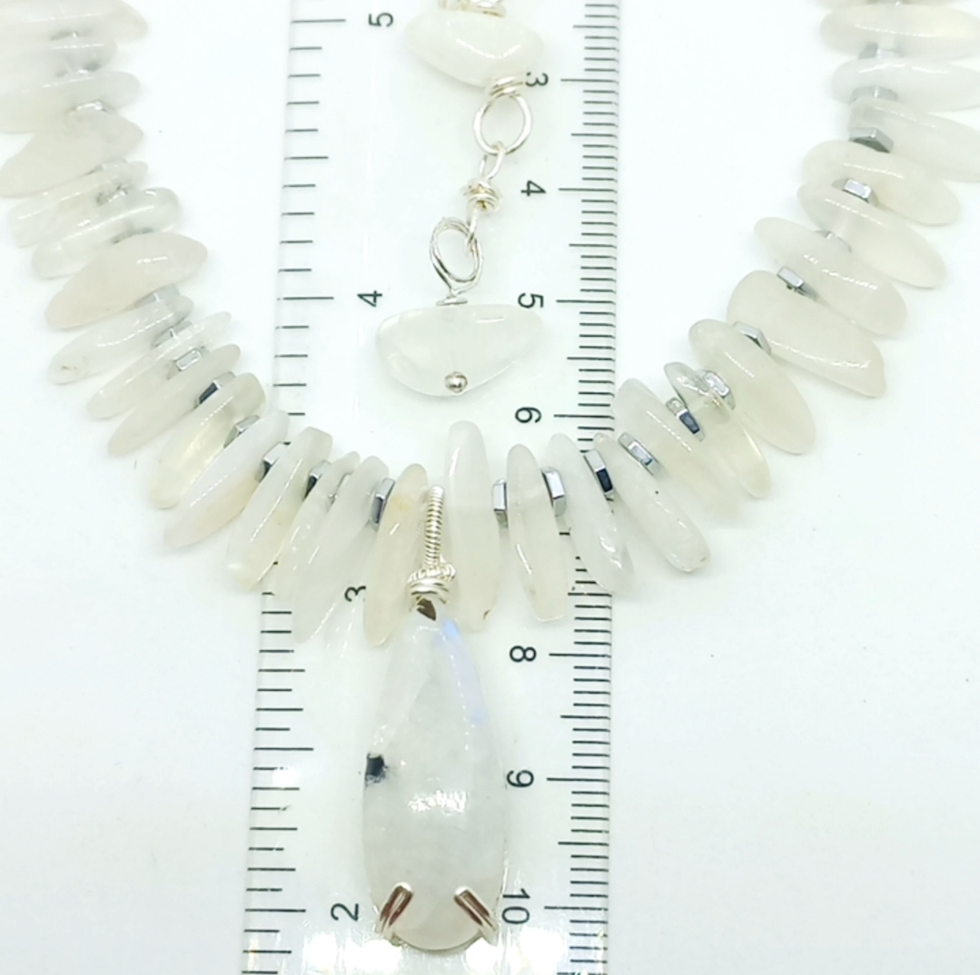Ay taşı kolye uç; çubuk Ay taşı ve Hematit taşlar ile birlikte çalışılarak, gümüş kaplama materyaller ile 47 cm uzunluğunda tasarlanmış EL YAPIMI kolye. Bir adet üretilmiştir, seçiminiz SİZE ÖZEL olacaktır.