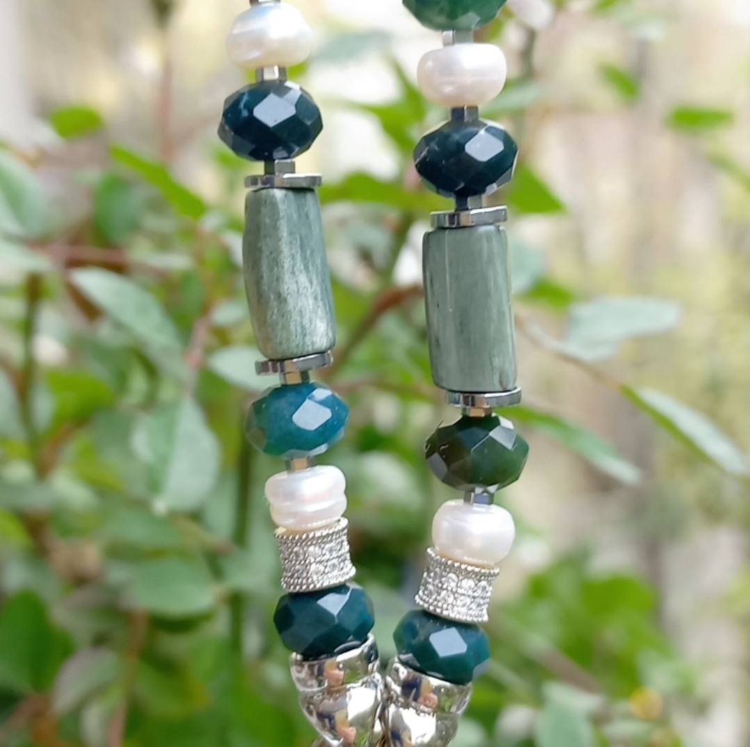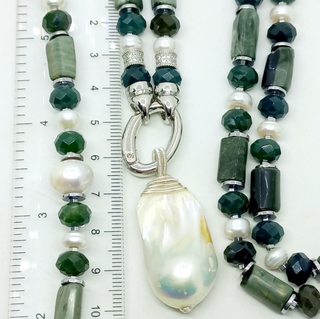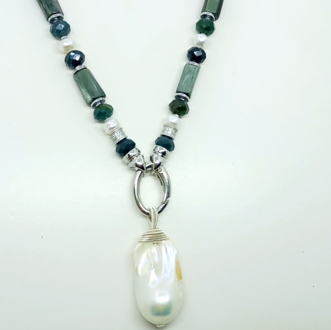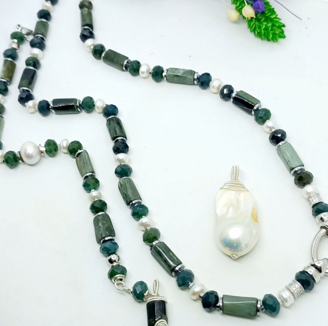 Doğal kültür barok İnci portatif kolye uç; silindir kesim Seraphinite, sekiz milim ebtlı faset kesim rondela yosunlu Akik, doğal kültür İnci, Hematit ve iki adet Zirkon rondela taşlar ile çalışılarak, gümüş kaplama materyaller ile 55 cm uzunluğunda tasarlanmış EL YAPIMI kolye.