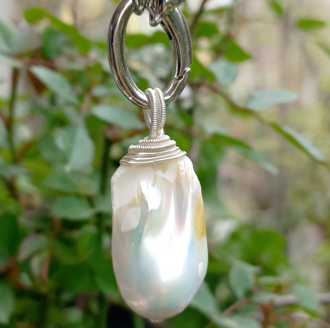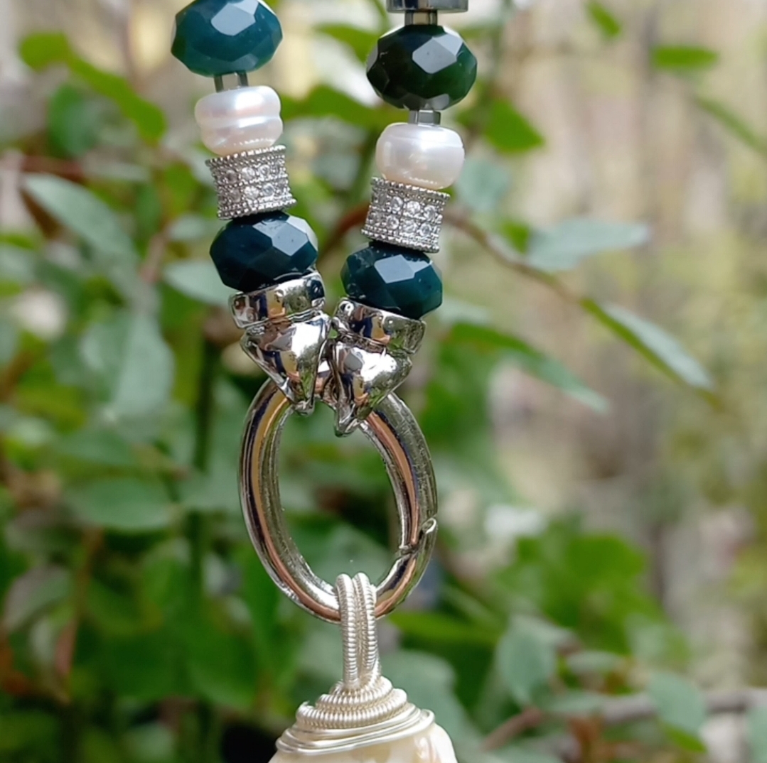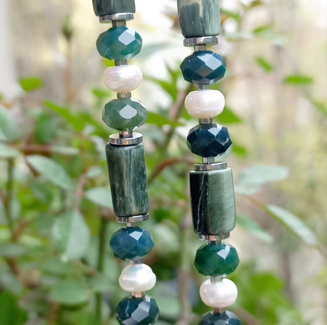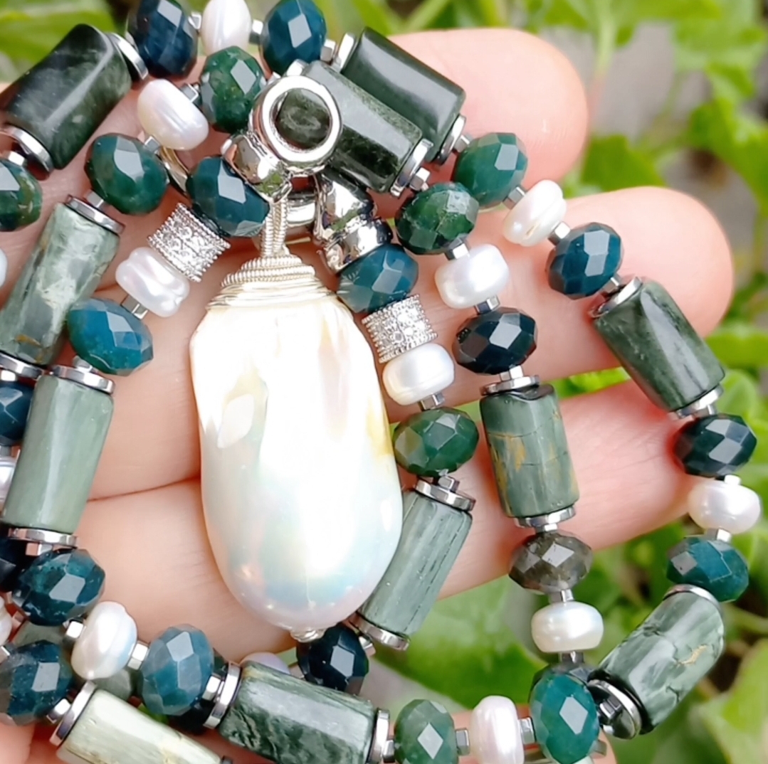 Doğal kültür barok İnci portatif kolye uç; silindir kesim Seraphinite, sekiz milim ebtlı faset kesim rondela yosunlu Akik, doğal kültür İnci, Hematit ve iki adet Zirkon rondela taşlar ile çalışılarak, gümüş kaplama materyaller ile 55 cm uzunluğunda tasarlanmış EL YAPIMI kolye.