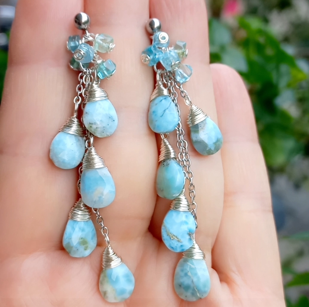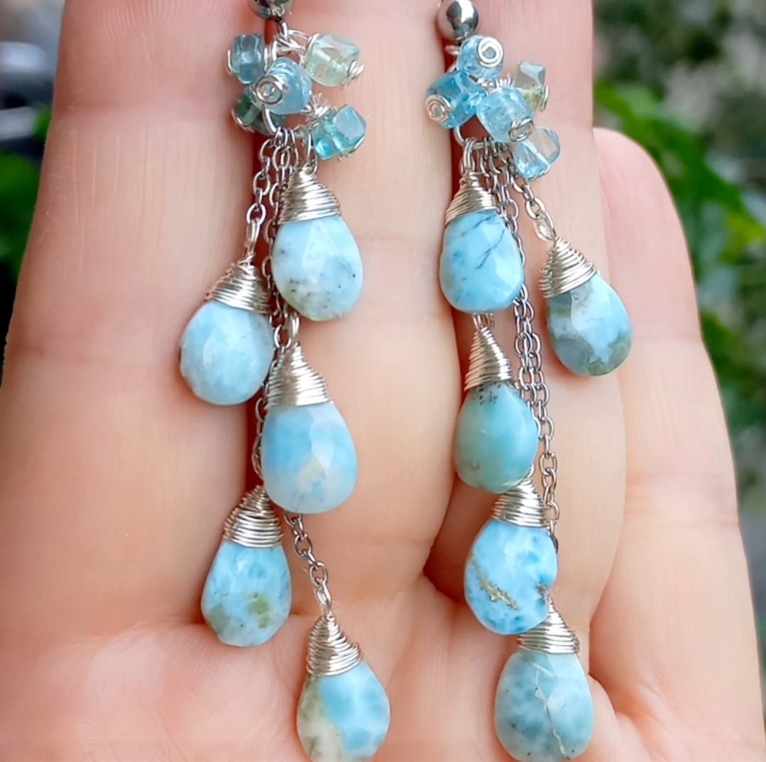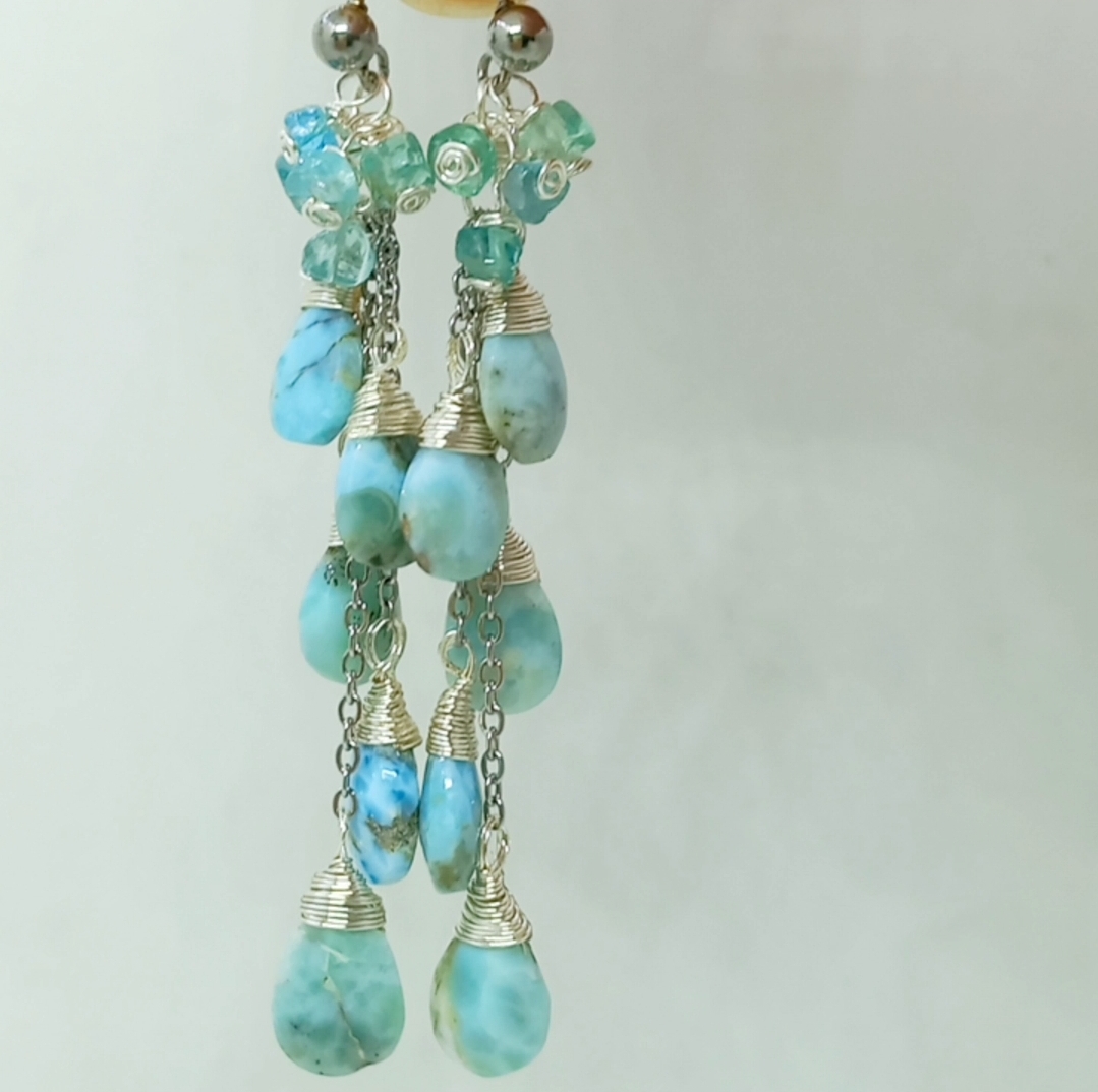 Damla Larimar küpe taşlar; Hindistan el kesimi rondela Apatit taşlar ile çalışılarak, çelik aparat ve gümüş kaplama materyaller ile tamamlanmış EL YAPIMI küpe.