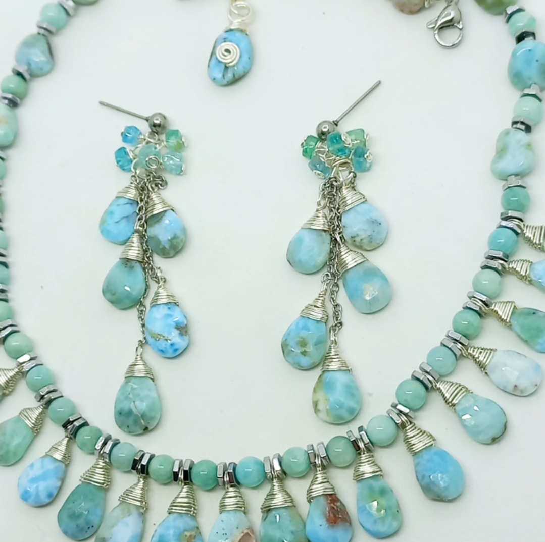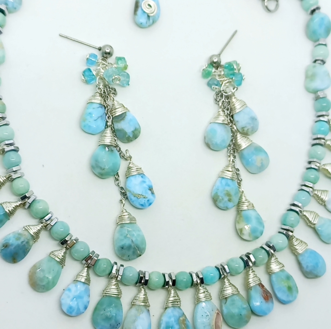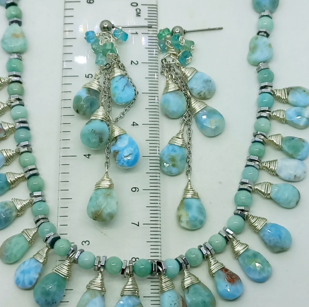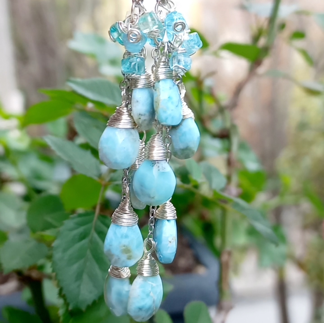 Damla Larimar küpe taşlar; Hindistan el kesimi rondela Apatit taşlar ile çalışılarak, çelik aparat ve gümüş kaplama materyaller ile tamamlanmış EL YAPIMI küpe.