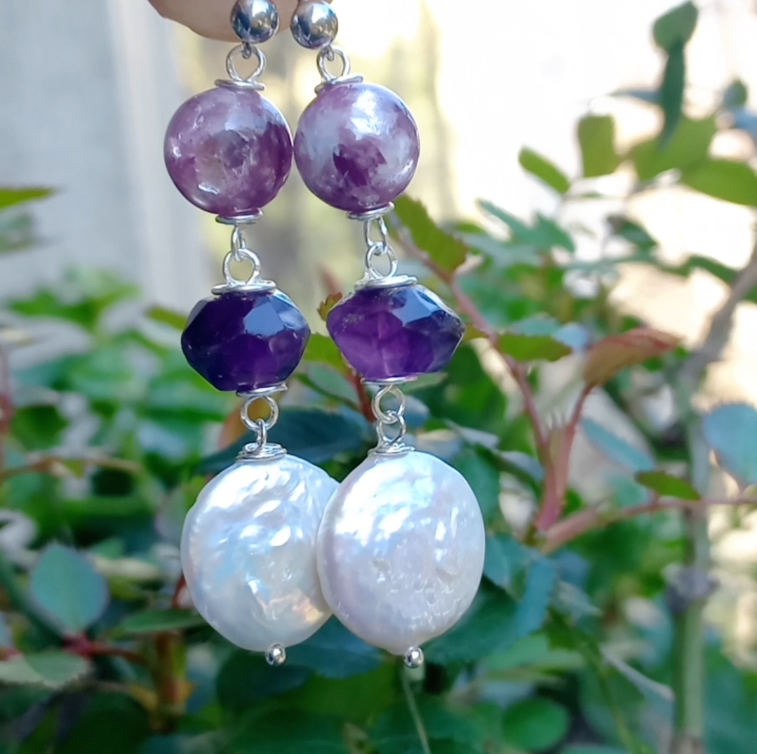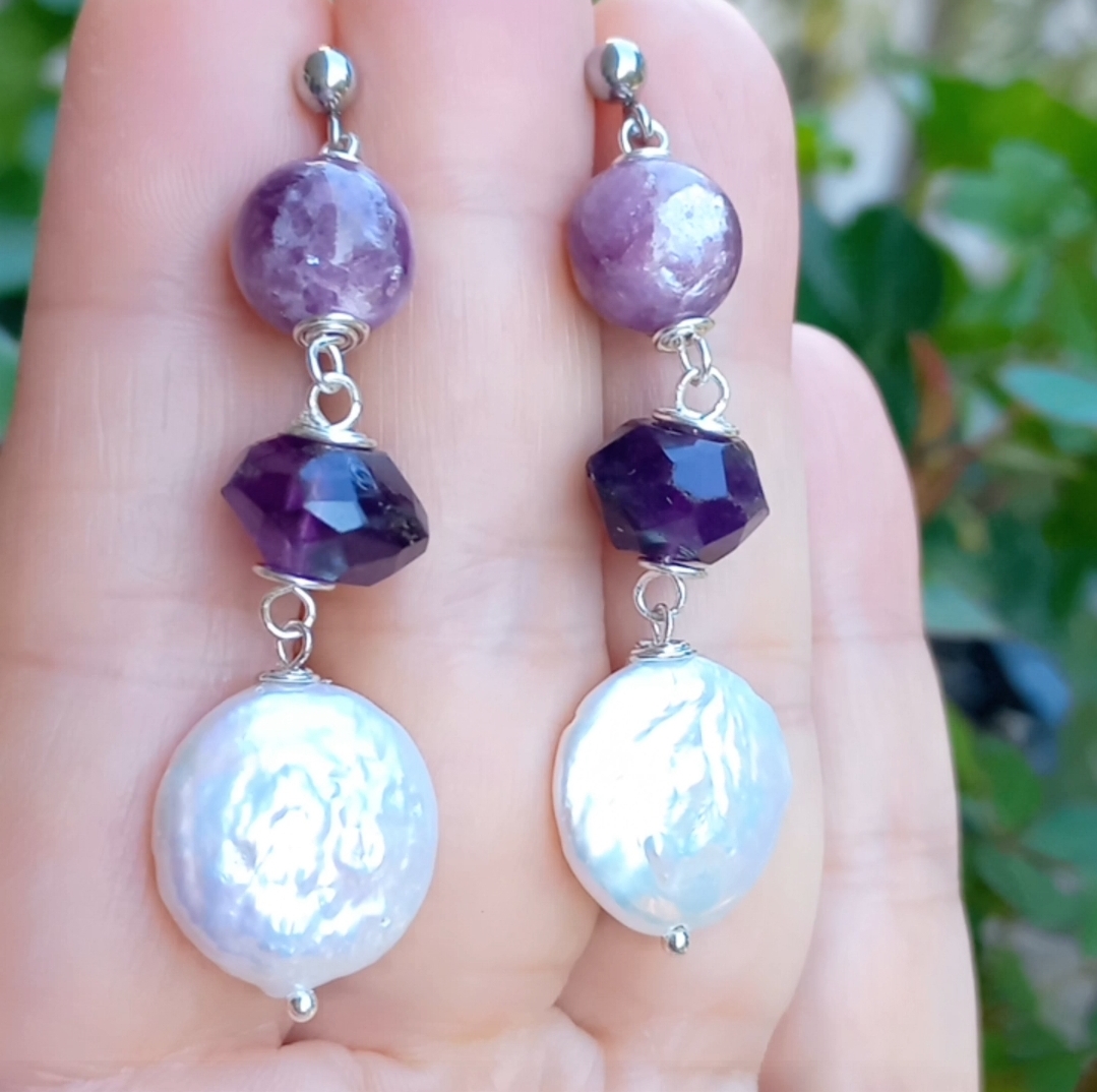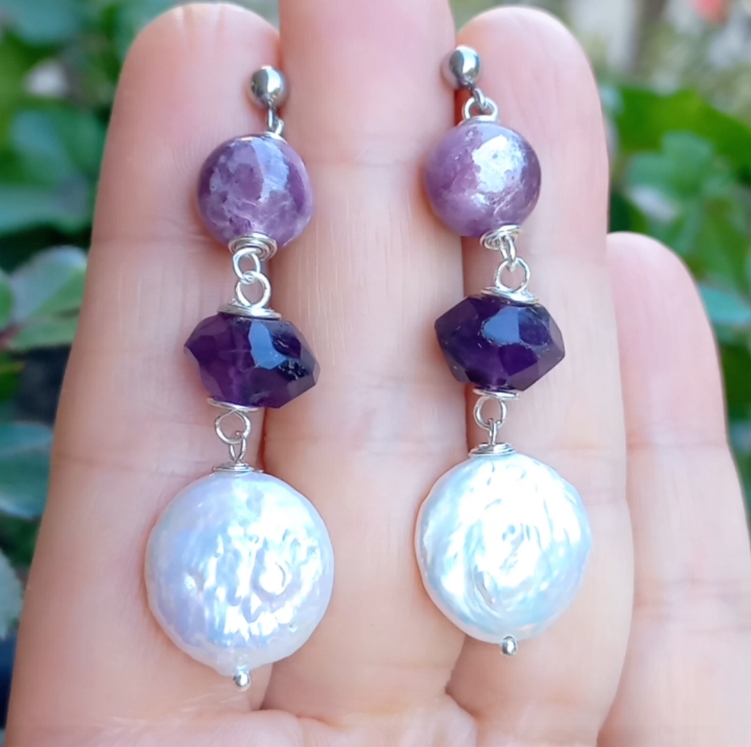 Doğal kültür disk İnci küpe taşlar; Hindistan el kesimi rondela Ametist, Mika Lepidolit ile çalışılarak çelik aparat ve gümüş kaplama materyaller ile tamamlanmış EL YAPIMI küpe.