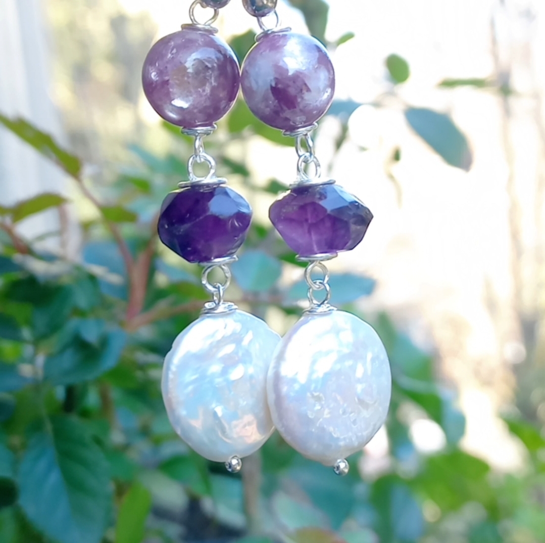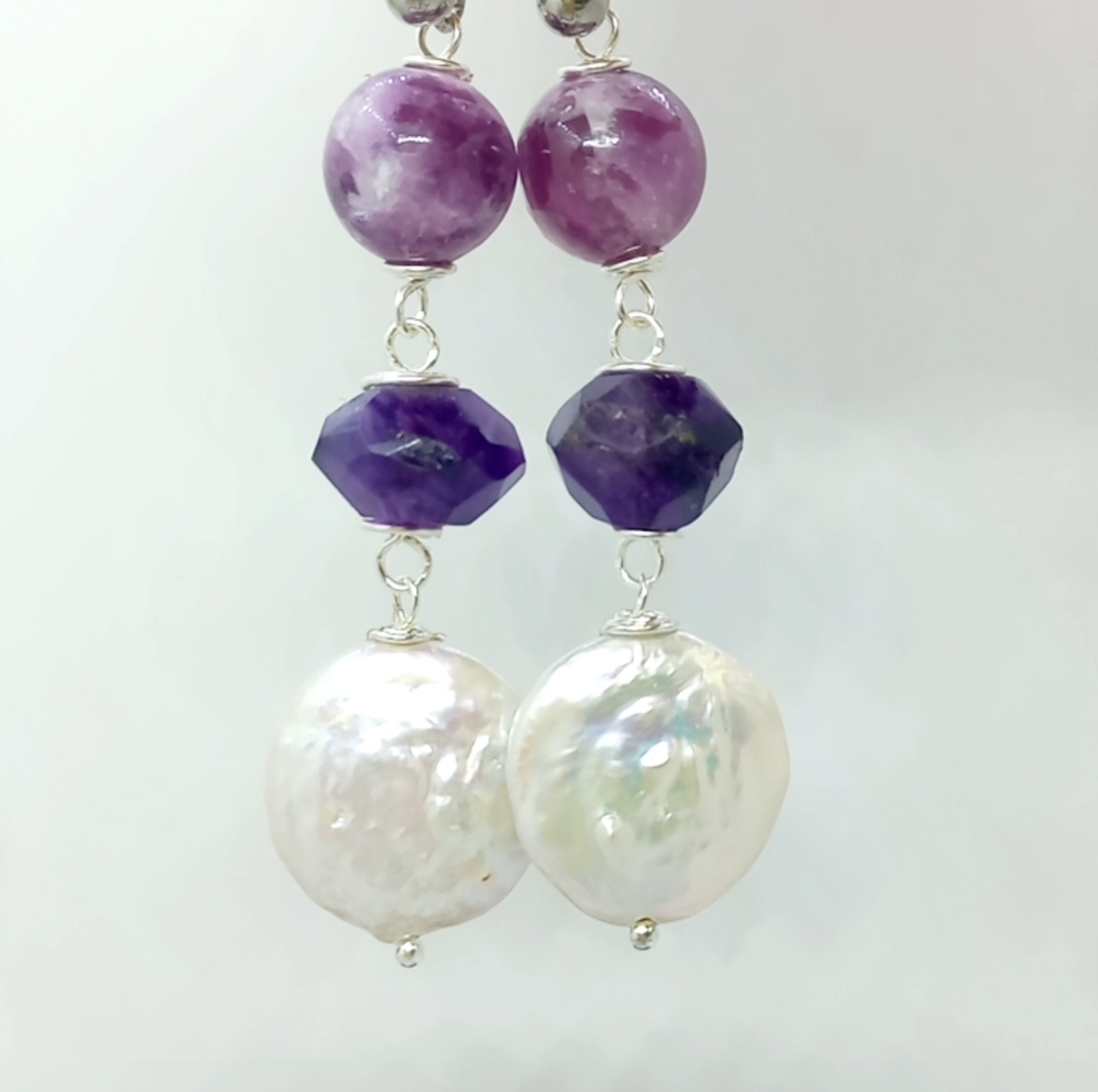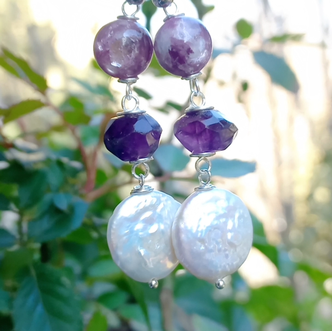 Doğal kültür disk İnci küpe taşlar; Hindistan el kesimi rondela Ametist, Mika Lepidolit ile çalışılarak çelik aparat ve gümüş kaplama materyaller ile tamamlanmış EL YAPIMI küpe.
