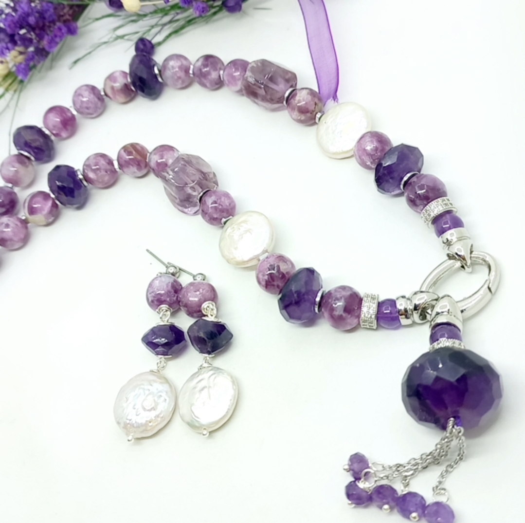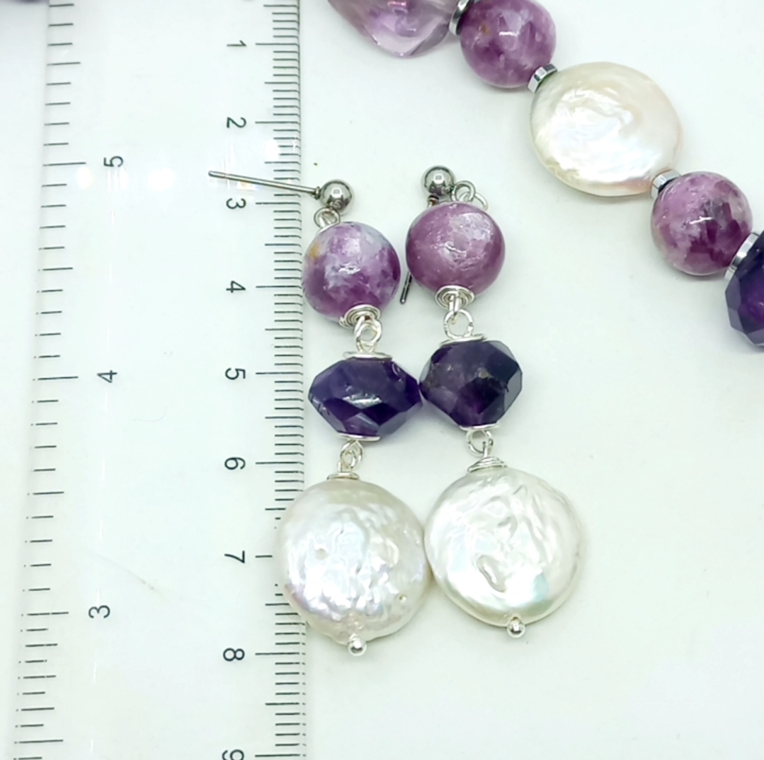 ÜRÜN KOD: 2681 Doğal İnci Hindistan el kesimi Ametist Mika Lepidolit el yapımı çelik aparatlı küpe
