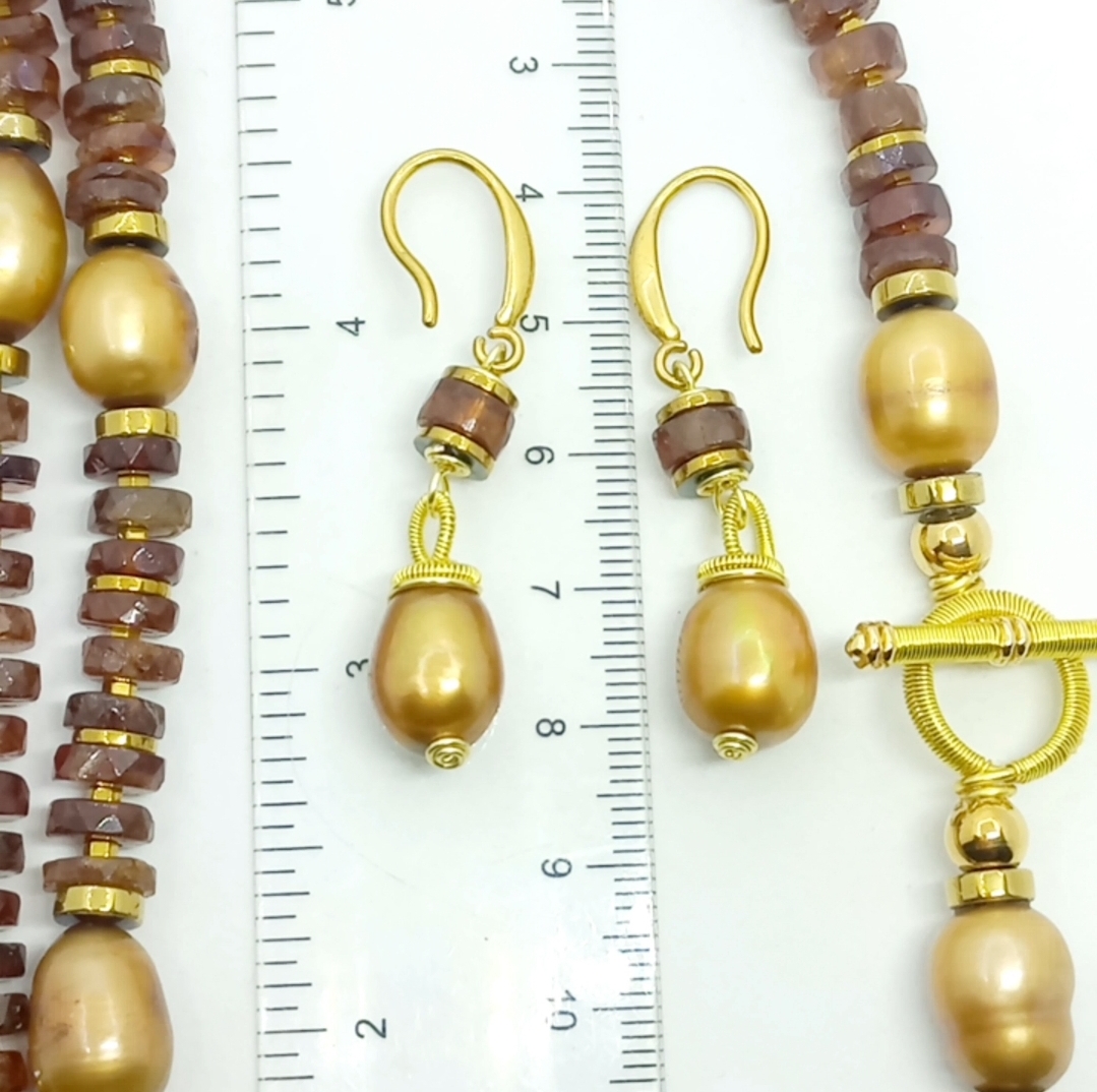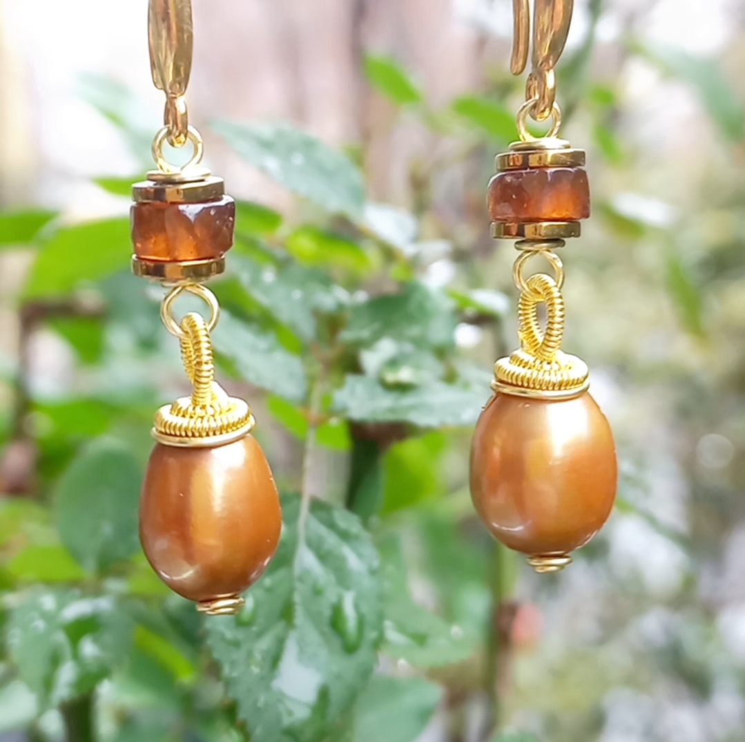 Doğal kültür İnci küpe taşlar; Hindistan el kesimi Hossanite Garnet, Hematit ve altın kaplama materyaller ile çalışılarak tasarlanmış EL YAPIMI küpe.