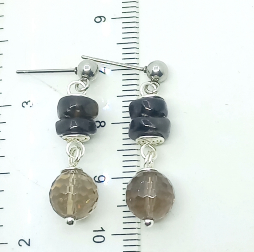 Dokuz milim ebatlı fasetli dumanlı Kuvars küpe taşları; rondela dumanlı Kuvars, çelik aparat ve gümüş kaplama materyaller ile çalışılarak tasarlanmış EL YAPIMI küpe.