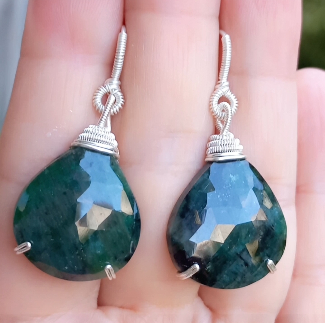 Faset kesimli Zümrüt küpe taşlar; Gümüş (925) küpe aparatlar ve gümüş kaplama materyaller ile çalışılarak tasarlanmış EL YAPIMI küpe. Bir adet üretilmiştir, seçiminiz SİZE ÖZEL olacaktır.