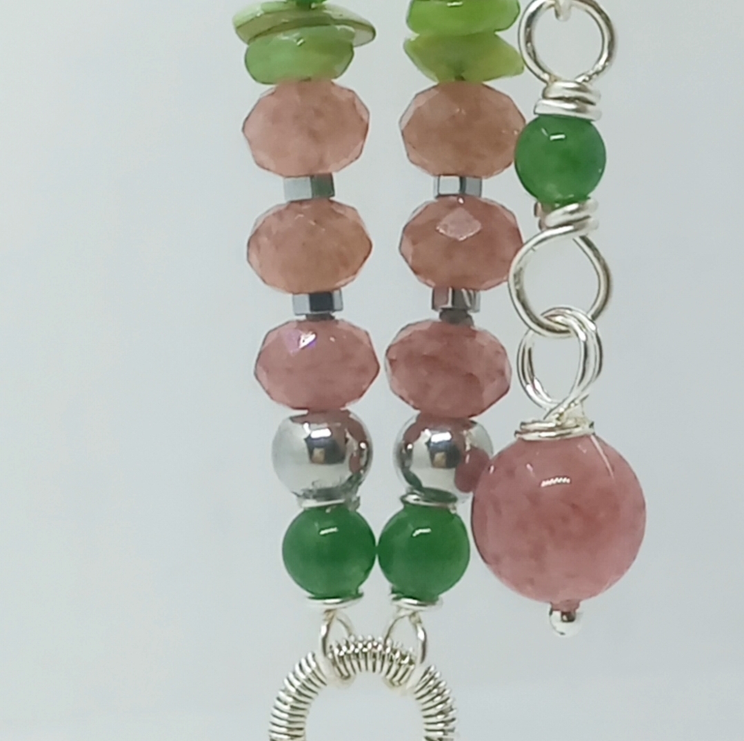 Garden Kuvars kolye uç; faset kesimli rondela çilek Kuvars, Yeşim, renklendirilmiş Sedef ve Hematit taşlar ile çalışılarak, gümüş kaplama materyaller ile 50 cm uzunluğunda tasarlanmış EL YAPIMI kolye. Bir adet üretilmiştir, seçiminiz SİZE ÖZEL olacaktır.