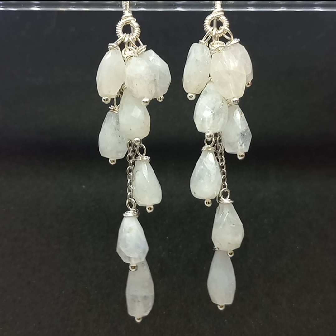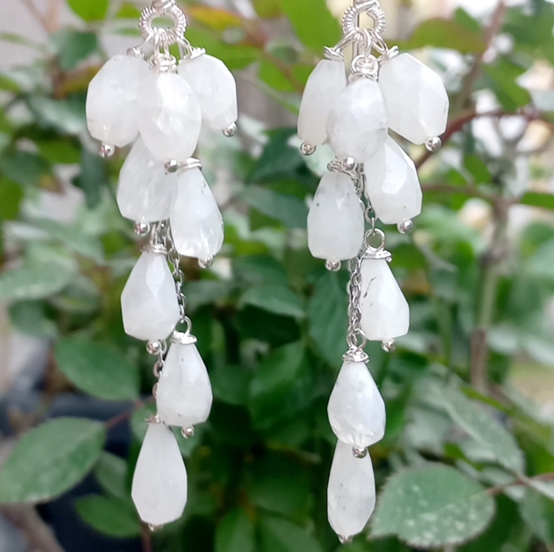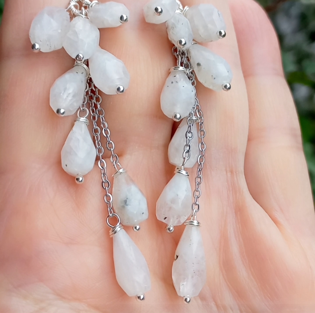 Hindistan el kesimi fasetli damla ve oval Aytaşı taşlar; çelik ve gümüş kaplama materyaller ile çalışılarak tasarlanmış EL YAPIMI küpe.