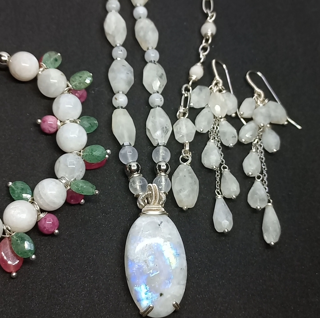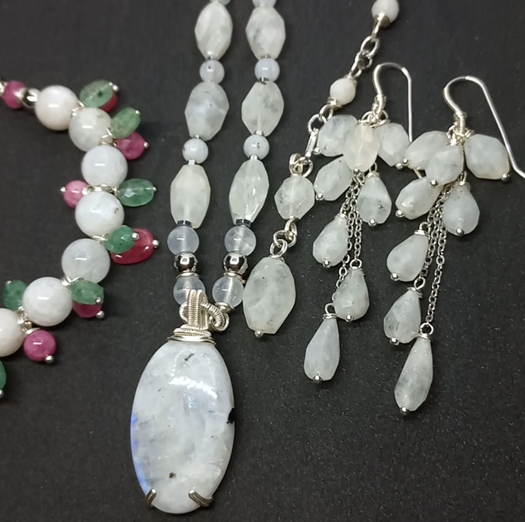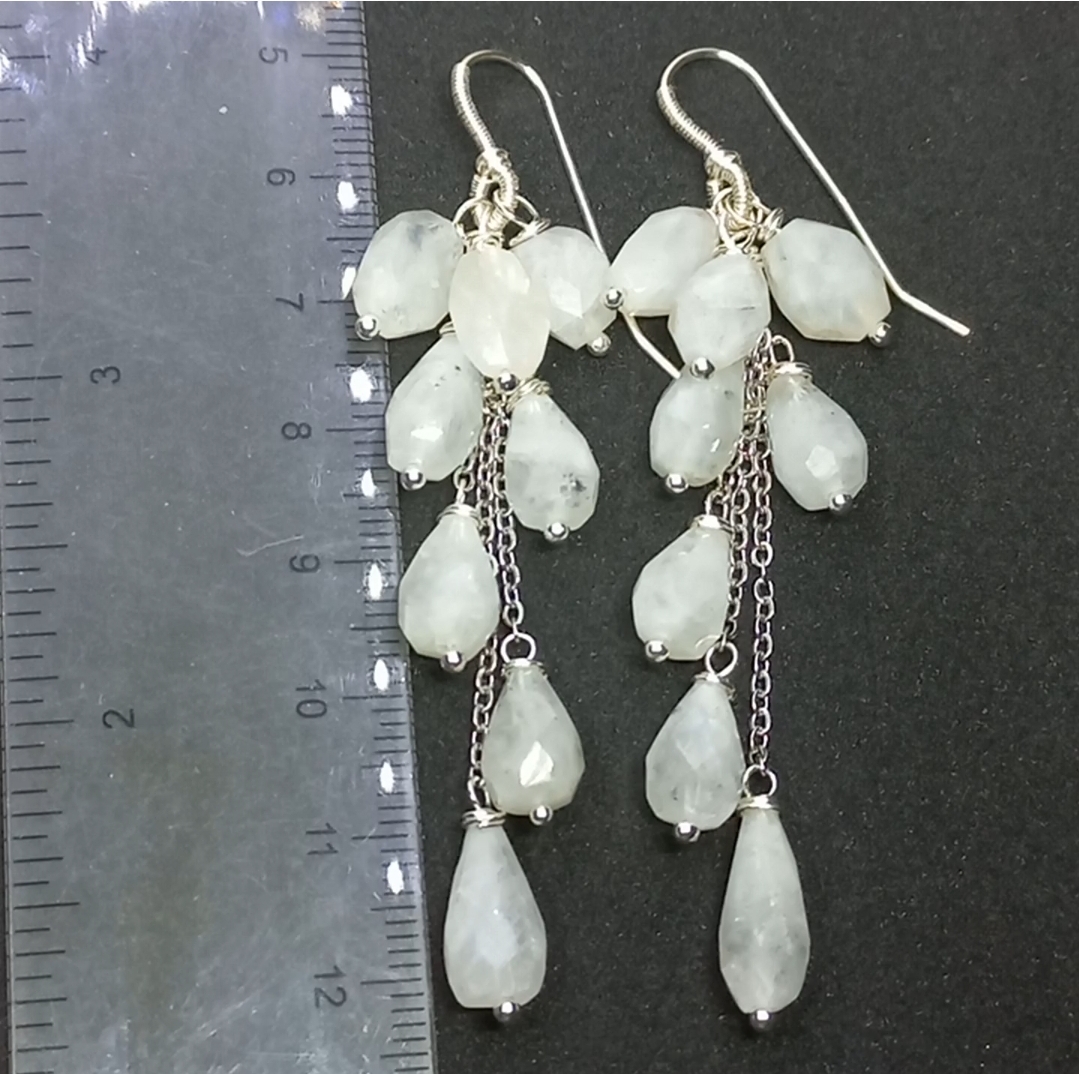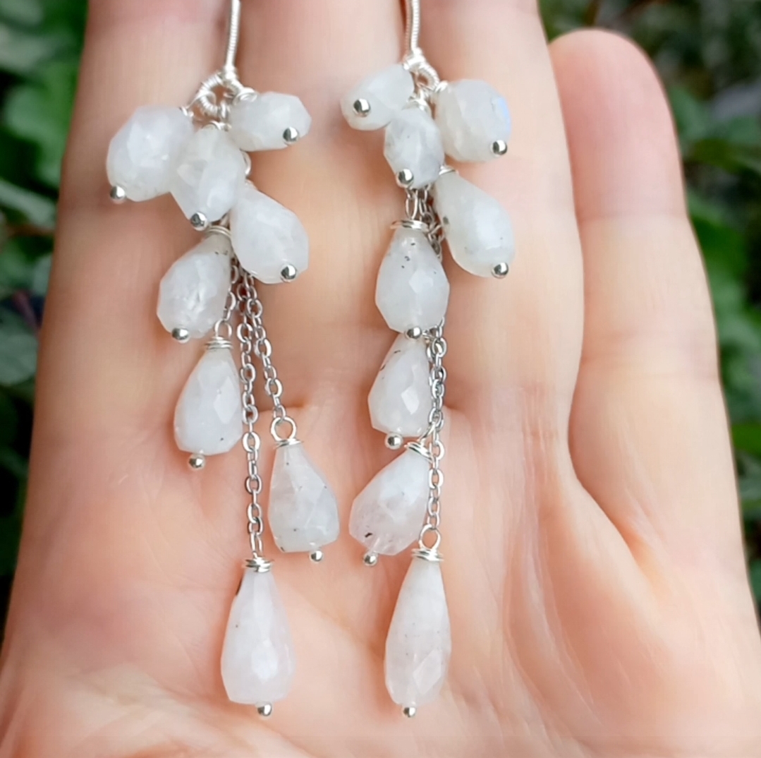 Hindistan el kesimi fasetli damla ve oval Aytaşı taşlar; çelik ve gümüş kaplama materyaller ile çalışılarak tasarlanmış EL YAPIMI küpe.