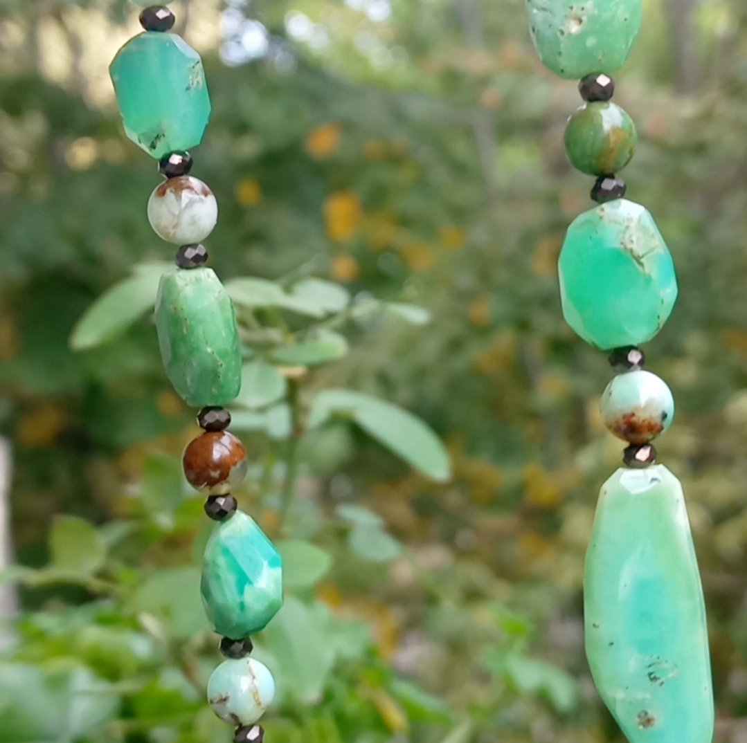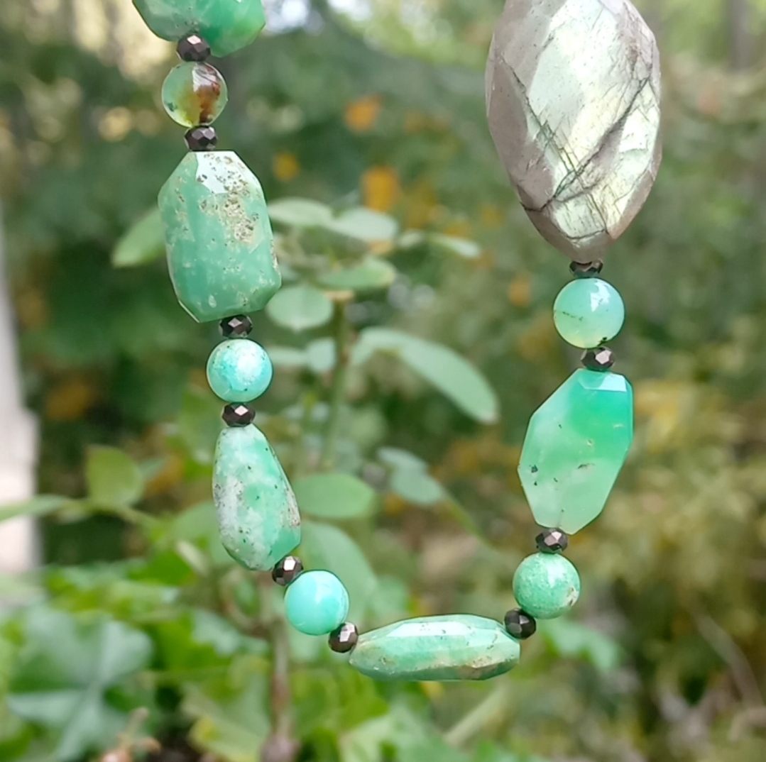 Hindistan el kesimi Krizopras taşlar; altı milim ebatlı Krizopras, üç milim ebatlı Pirit ve 3×1,5 cm ebatlı Labradorit taşlar ile birlikte çalışılarak 50 cm uzunluğunda tasarlanmış ve bakır kaplama materyaller ile tamamlanmış EL YAPIMI kolye.