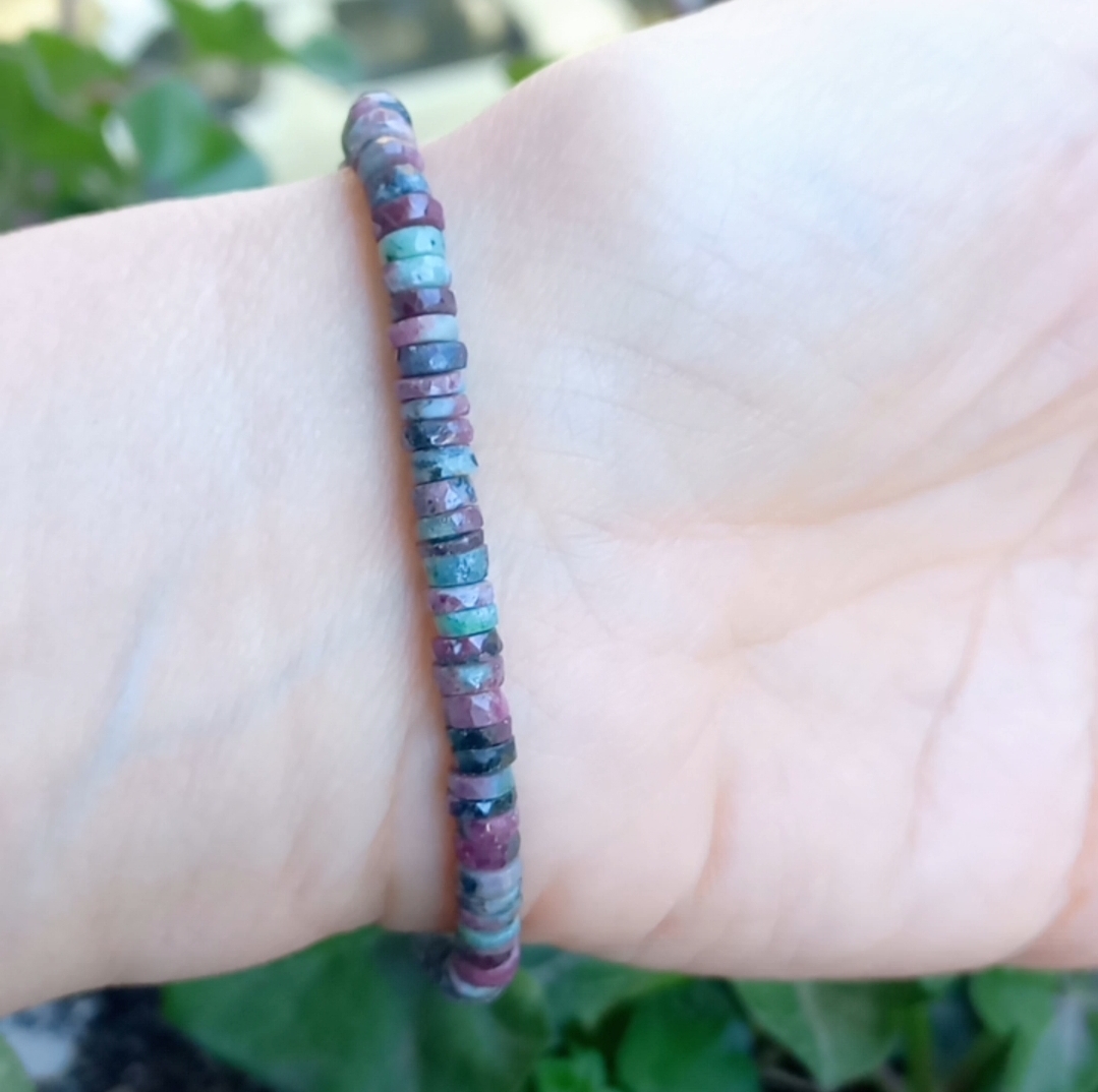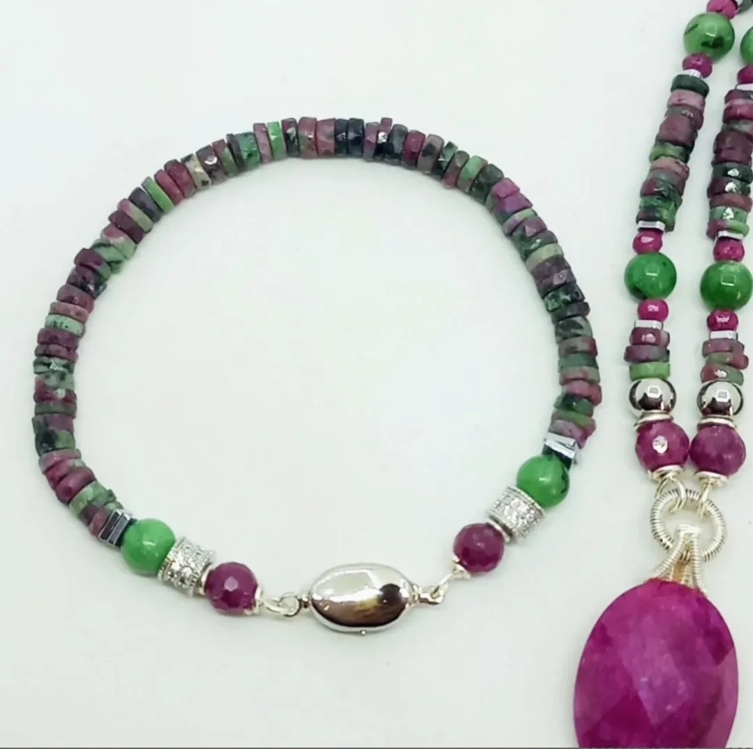 Hindistan el kesimi rondela Ruby Zoisit taşlar; iki adet Zirkonlu rondela, altı milim ebatlı iki adet faset kesim Yakut, Zoisit ve Hematit taşlar ile çalışılarak, gümüş kaplama materyaller ile 19 cm uzunluğunda tasarlanmış EL YAPIMI bileklik.
