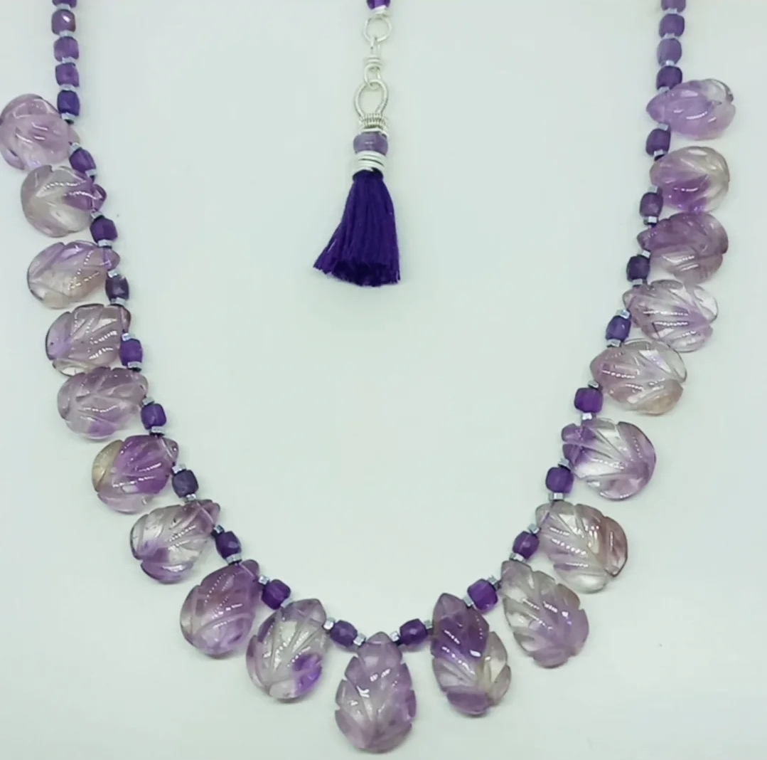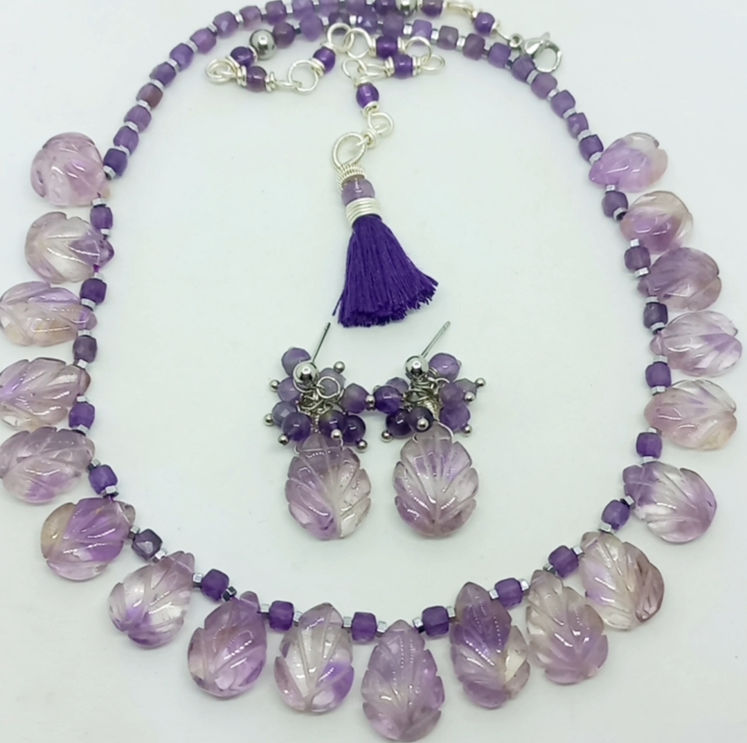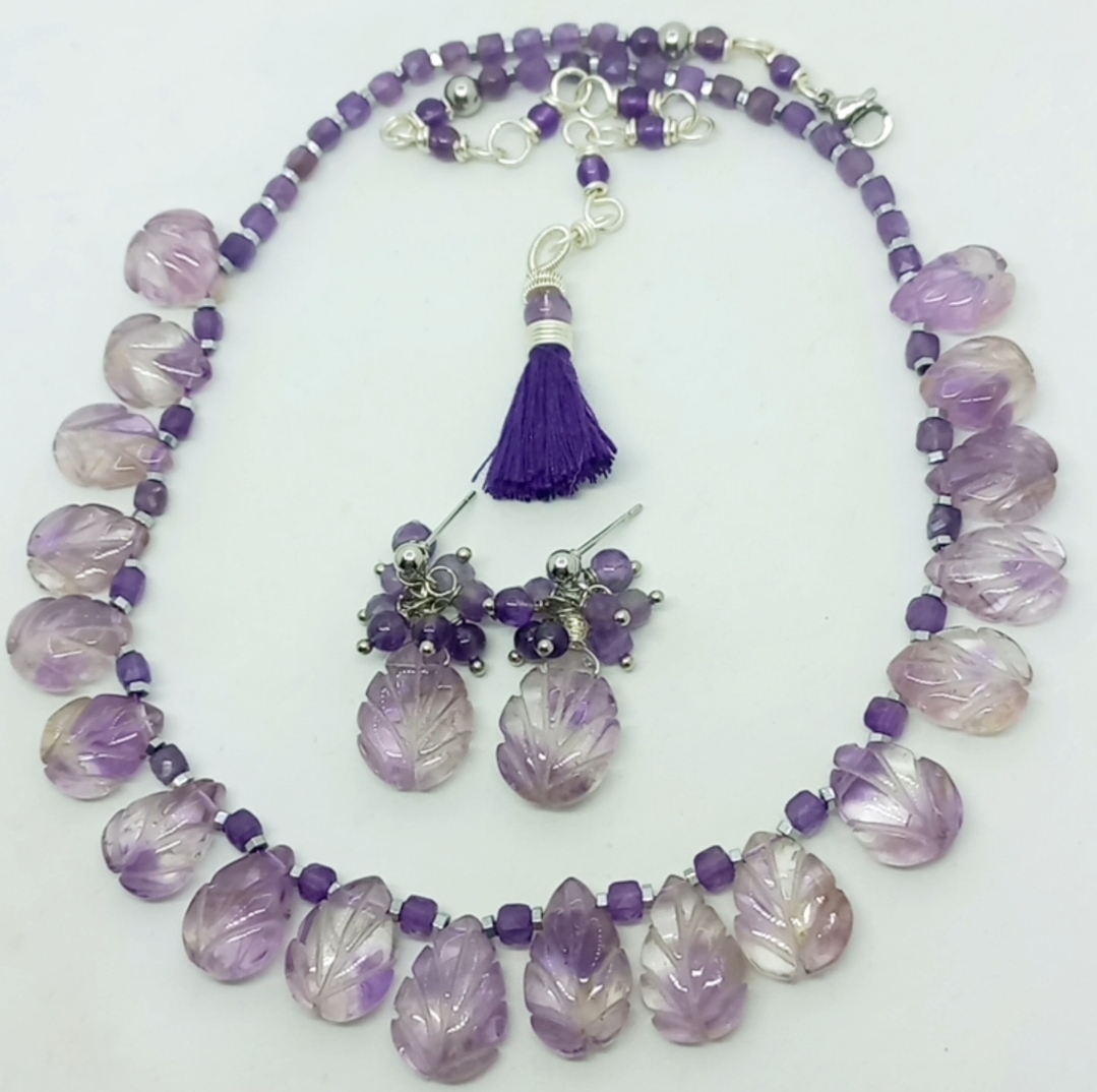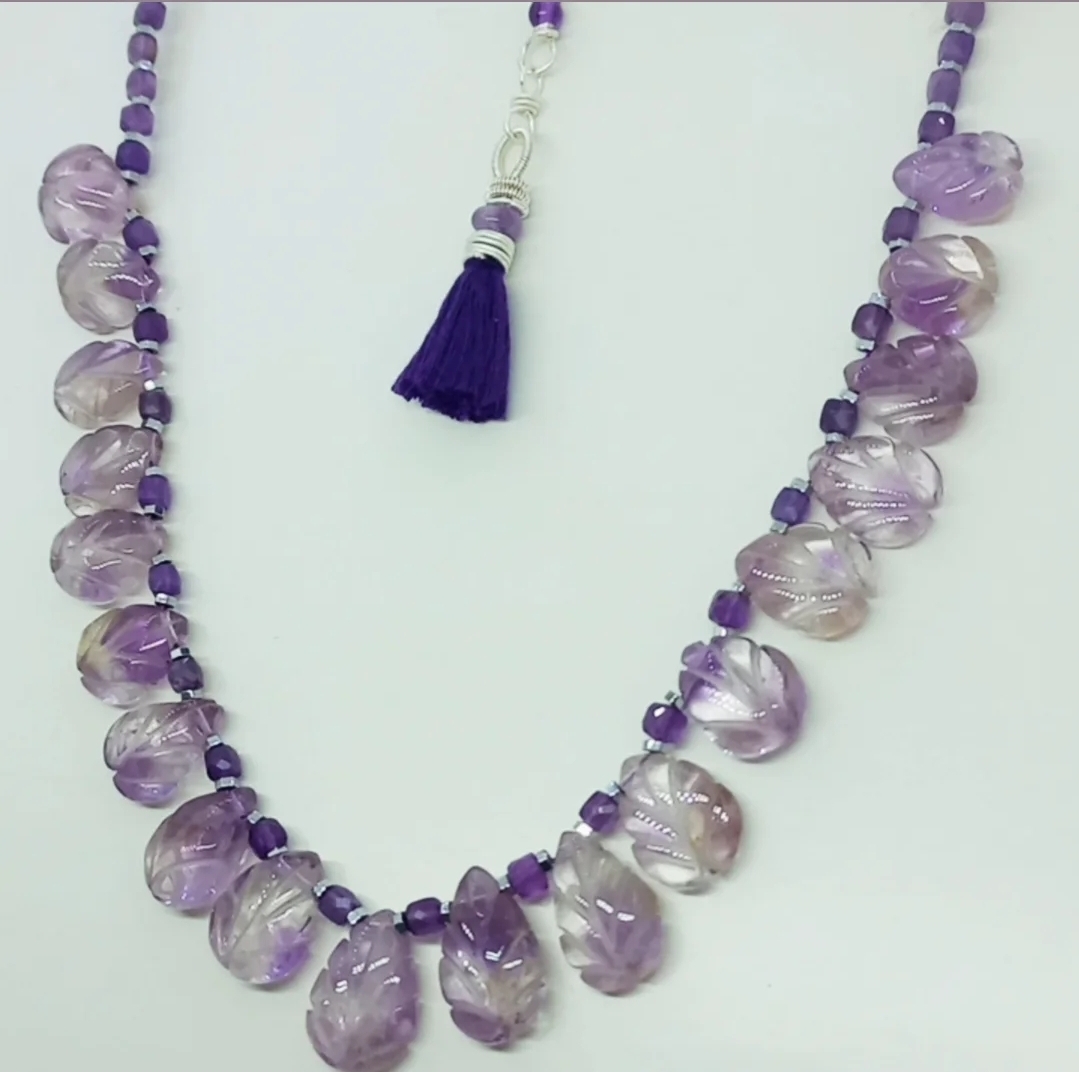 Hindistan el oyması Ametist taşlar; dört milim ebatlı küp Ametist, Hematit taşlar birlikte çalışılarak, çelik aparat ve gümüş kaplama materyaller ile 47 cm uzunluğunda tasarlanmış EL YAPIMI kolye.