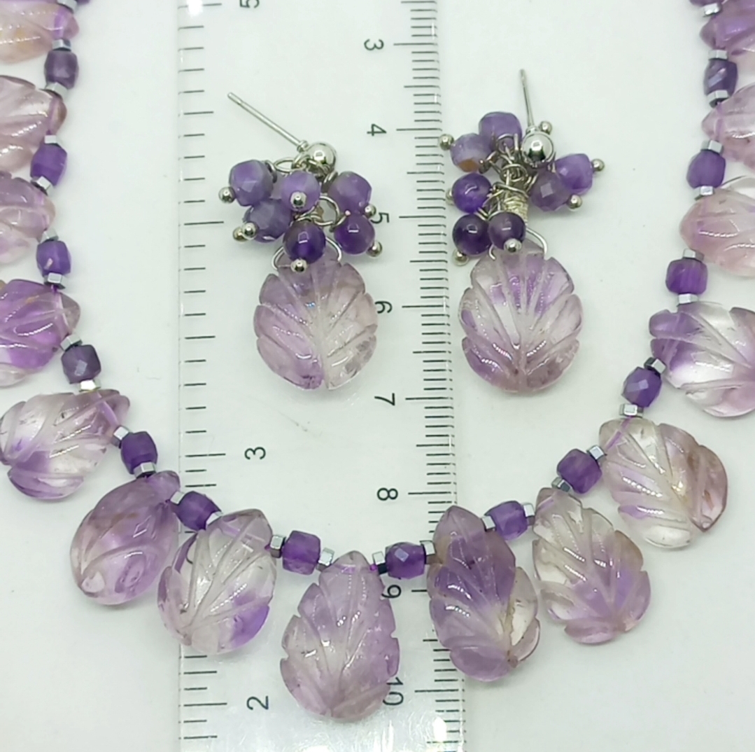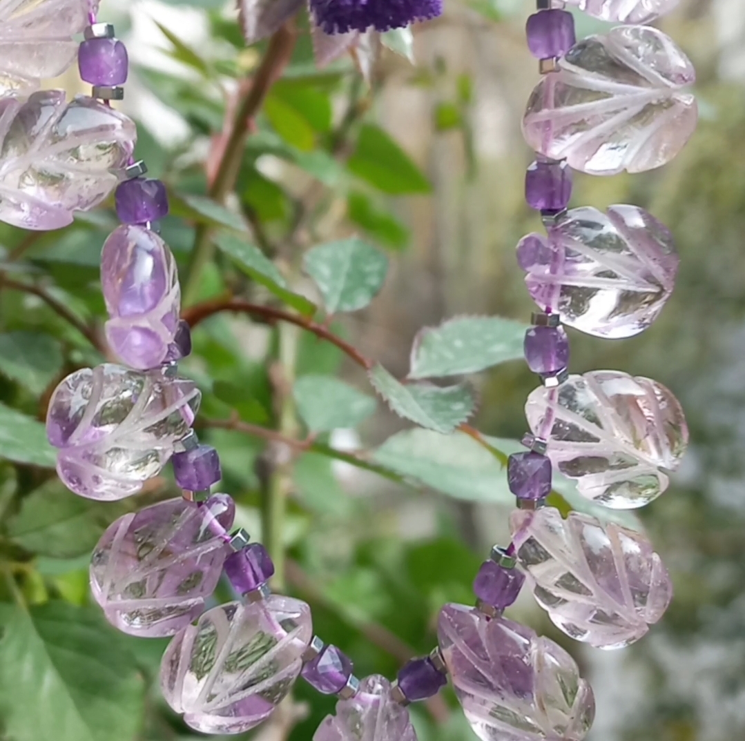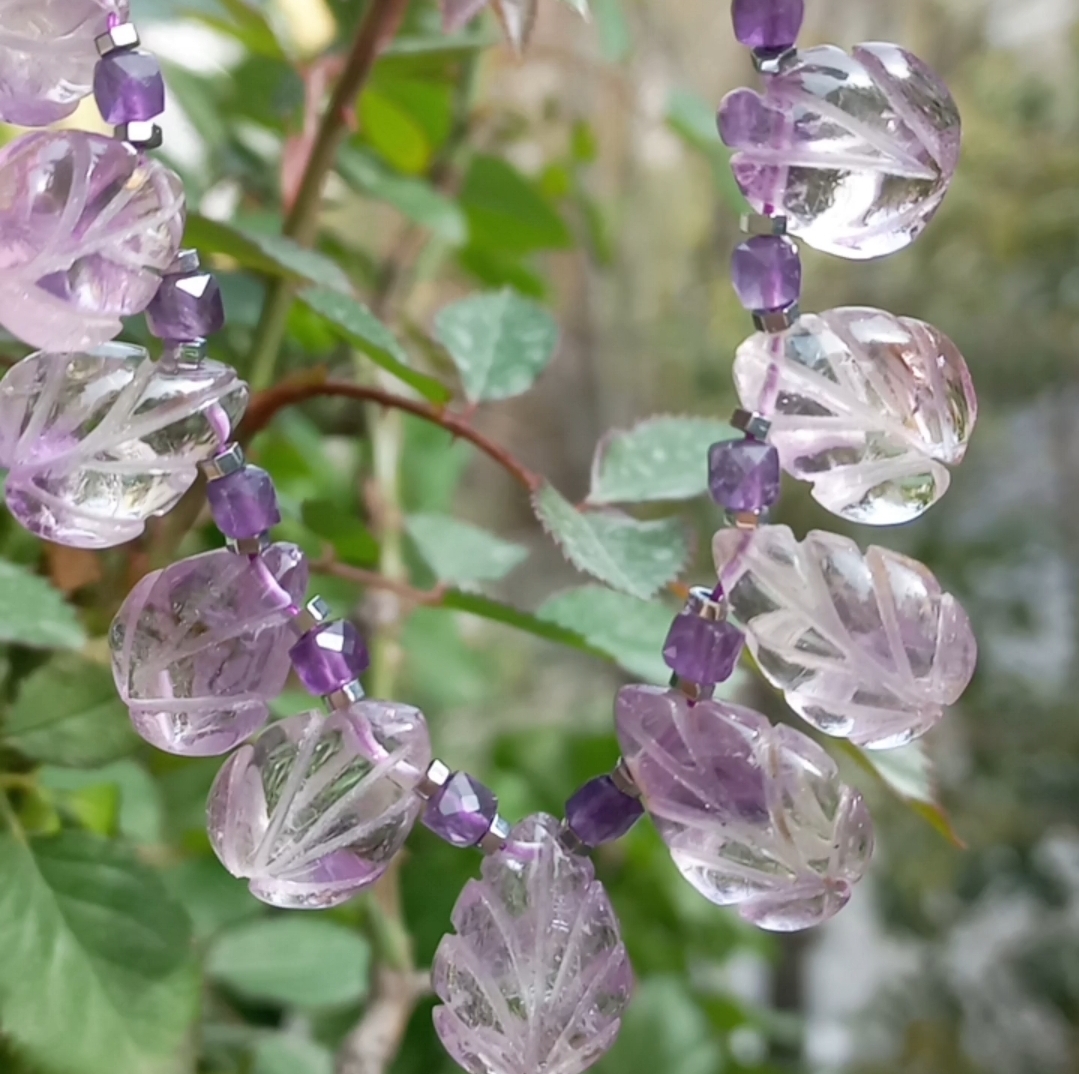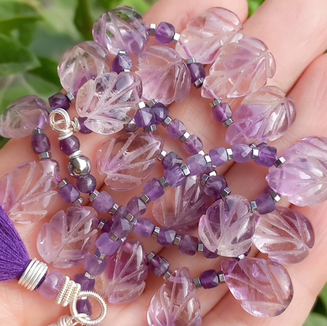 Hindistan el oyması Ametist taşlar; dört milim ebatlı küp Ametist, Hematit taşlar birlikte çalışılarak, çelik aparat ve gümüş kaplama materyaller ile 47 cm uzunluğunda tasarlanmış EL YAPIMI kolye.