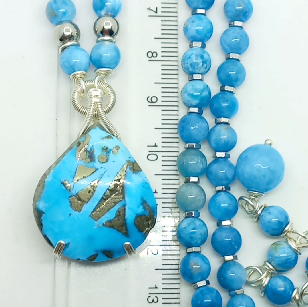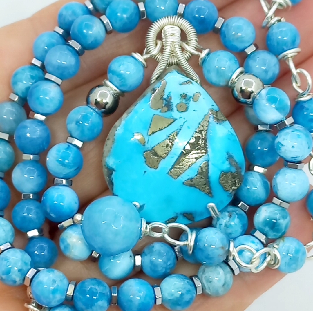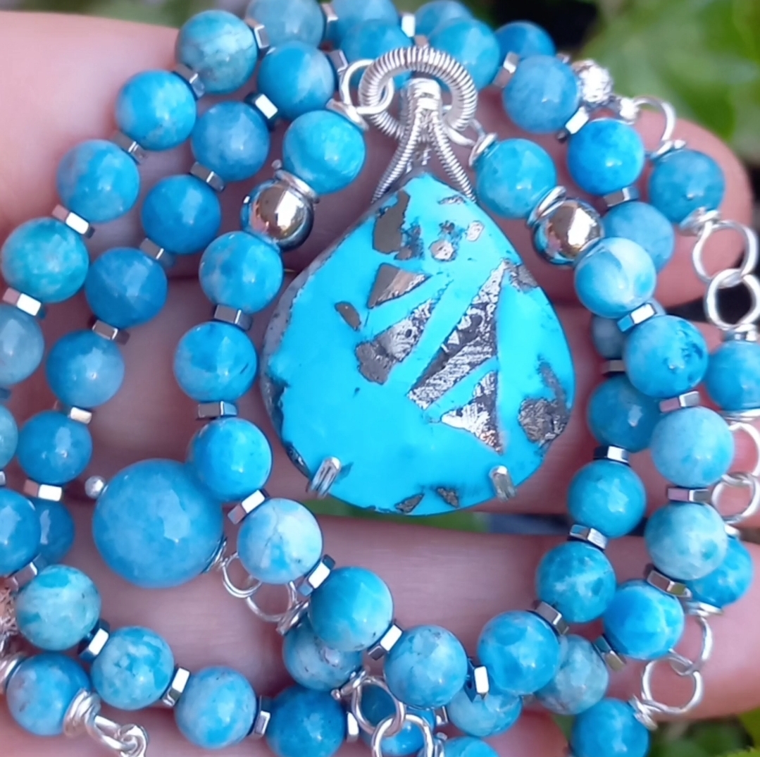 İran nişabur Firuze kolye uç (10,33 gr); altı milim ebatlı Apatit, Hematit taşlar beraber çalışılarak, gümüş kaplama materyaller ile 50 cm uzunluğunda tasarlanmış EL YAPIMI kolye. Bir adet üretilmiştir, seçiminiz SİZE ÖZEL olacaktır.