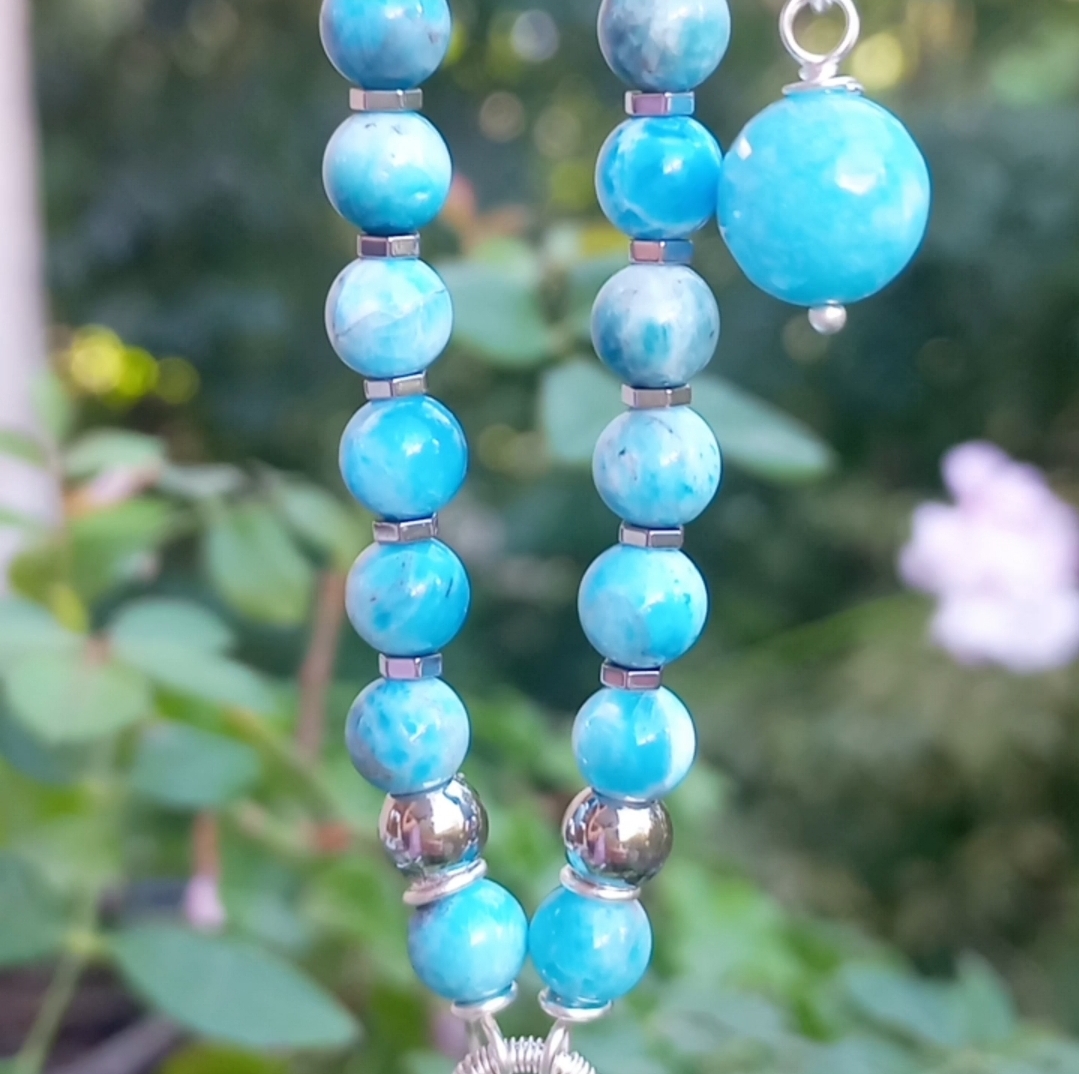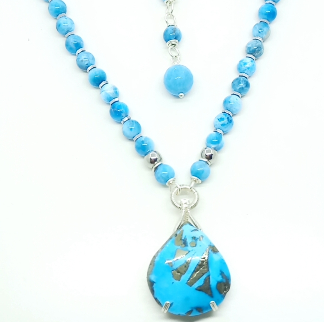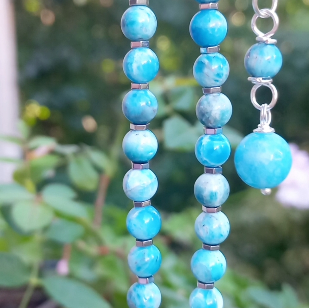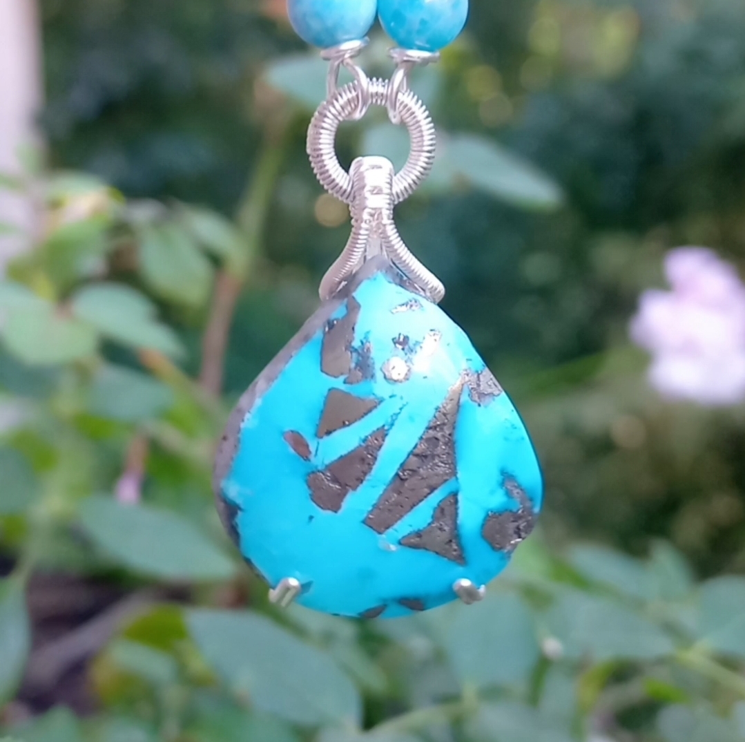İran nişabur Firuze kolye uç (10,33 gr); altı milim ebatlı Apatit, Hematit taşlar beraber çalışılarak, gümüş kaplama materyaller ile 50 cm uzunluğunda tasarlanmış EL YAPIMI kolye. Bir adet üretilmiştir, seçiminiz SİZE ÖZEL olacaktır.