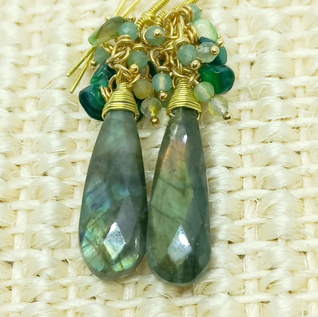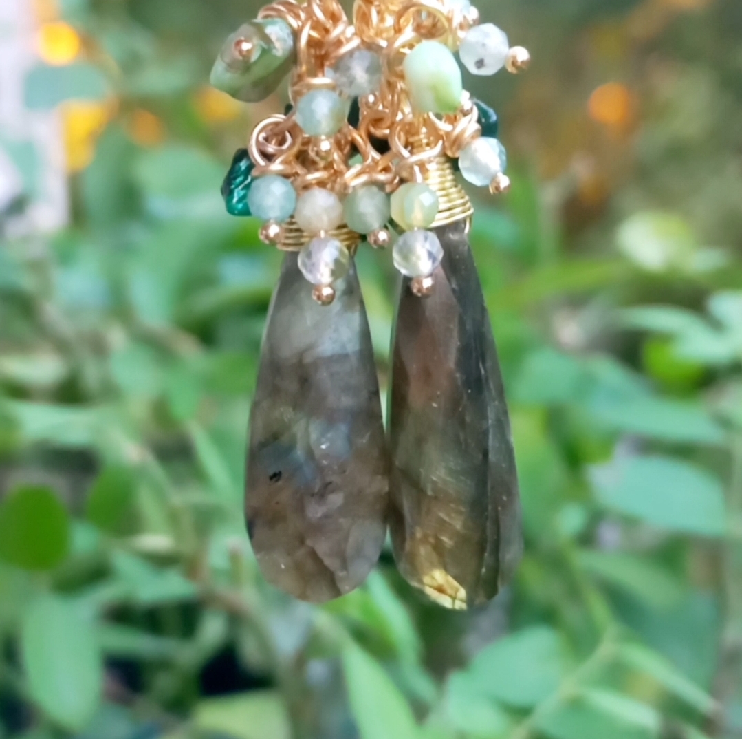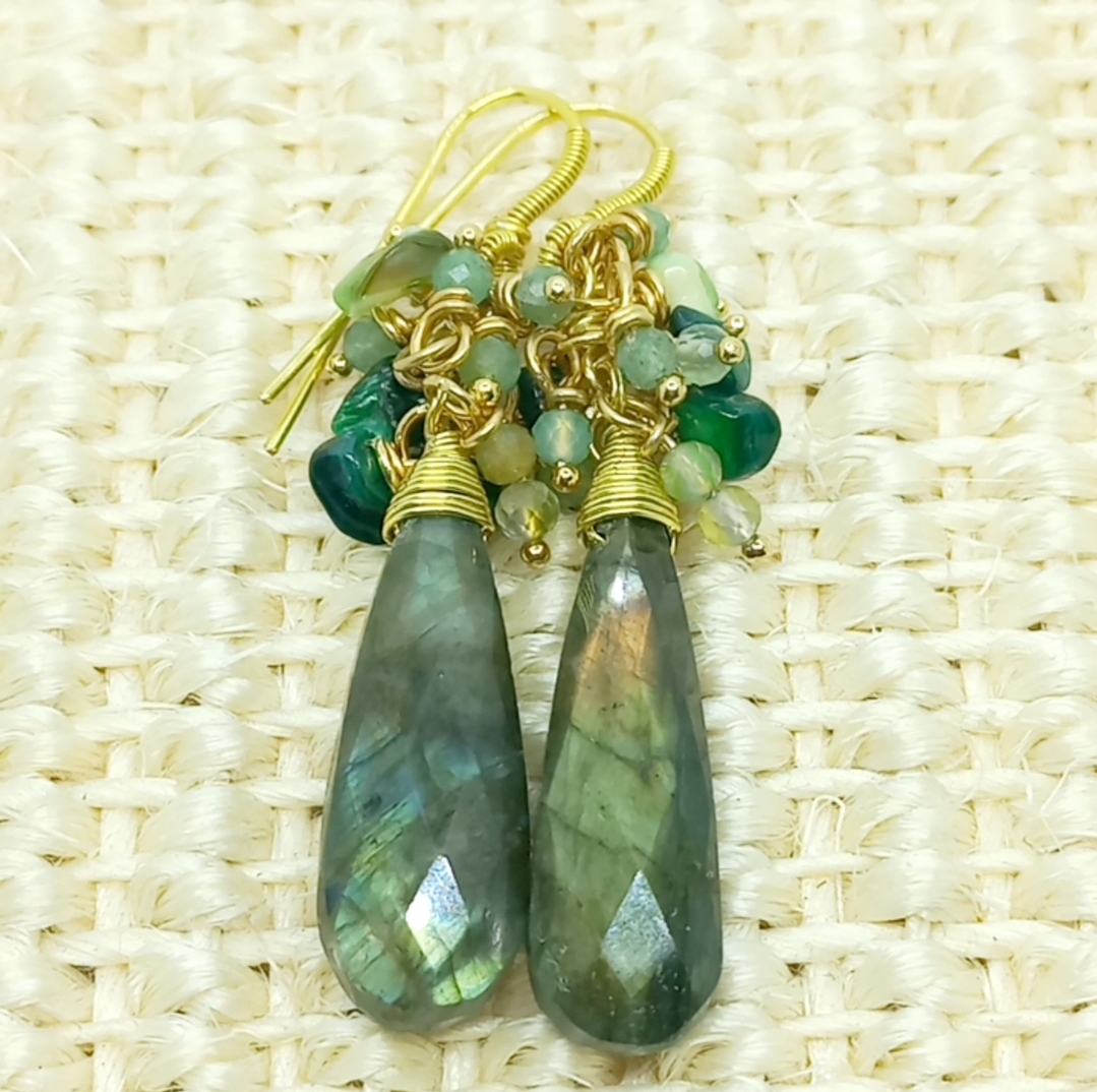 Faset kesimli damla Labradorit küpe taşlar; amorf Sedef, iki milim ebatlı Aventurin dekor taşlar ile desteklenerek, altın kaplama materyaller ile tamamlanmış EL YAPIMI küpe.