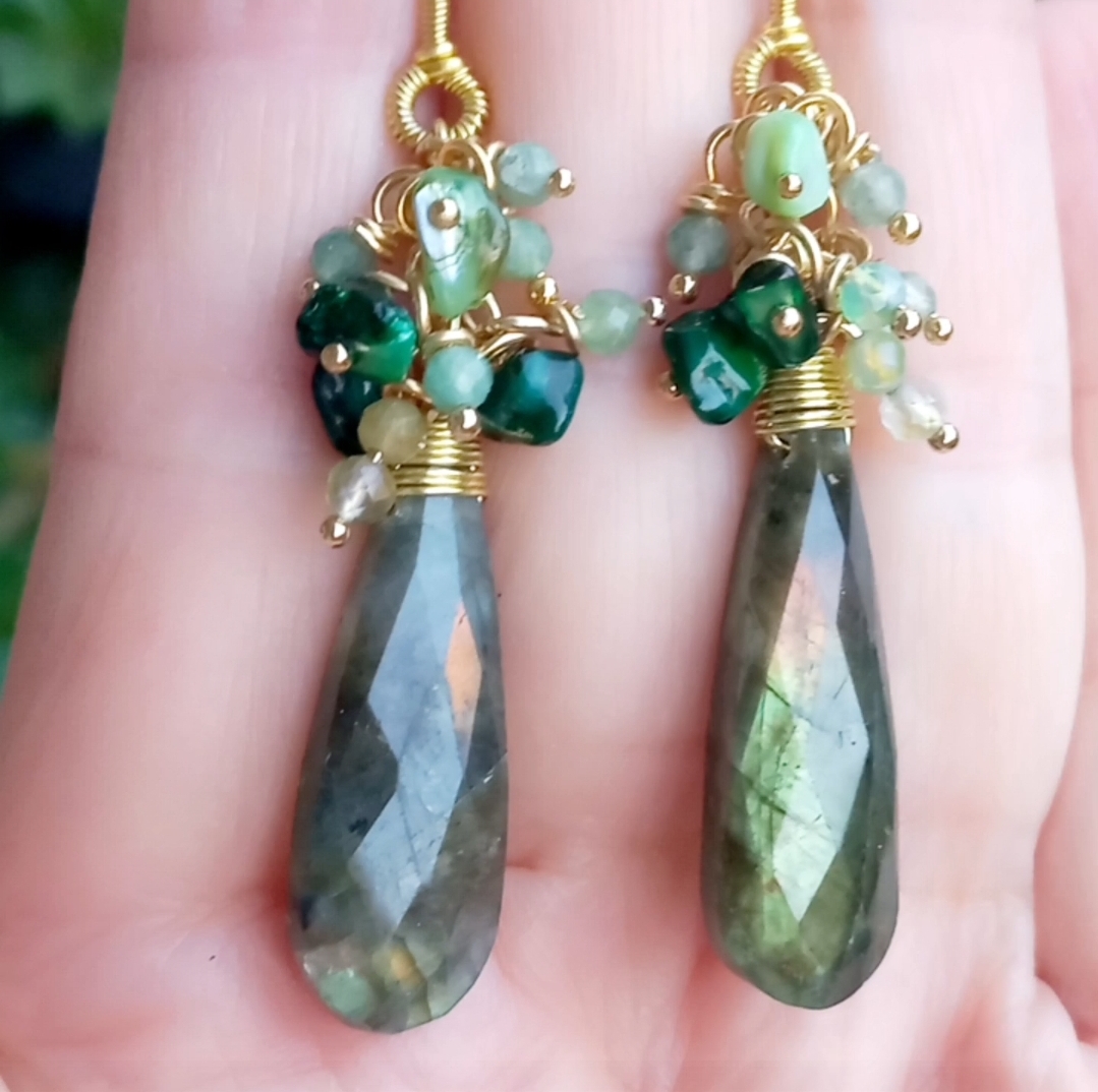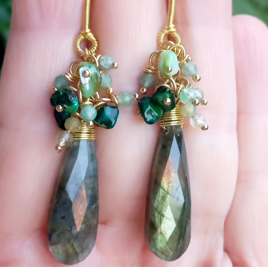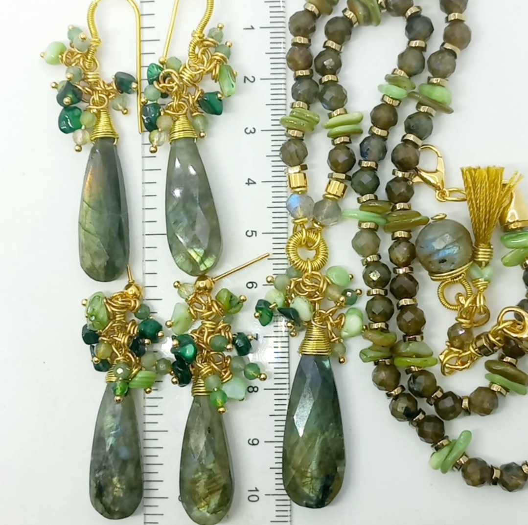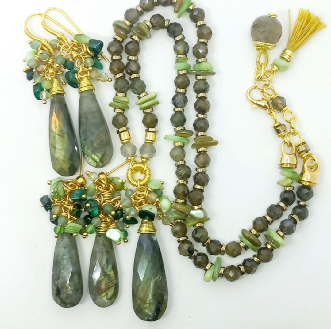 Faset kesimli damla Labradorit küpe taşlar; amorf Sedef, iki milim ebatlı Aventurin dekor taşlar ile desteklenerek, altın kaplama materyaller ile tamamlanmış EL YAPIMI küpe.