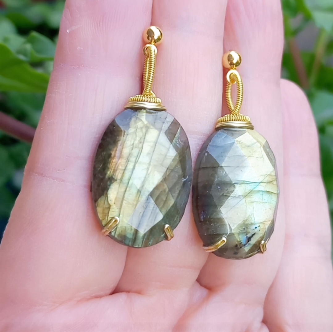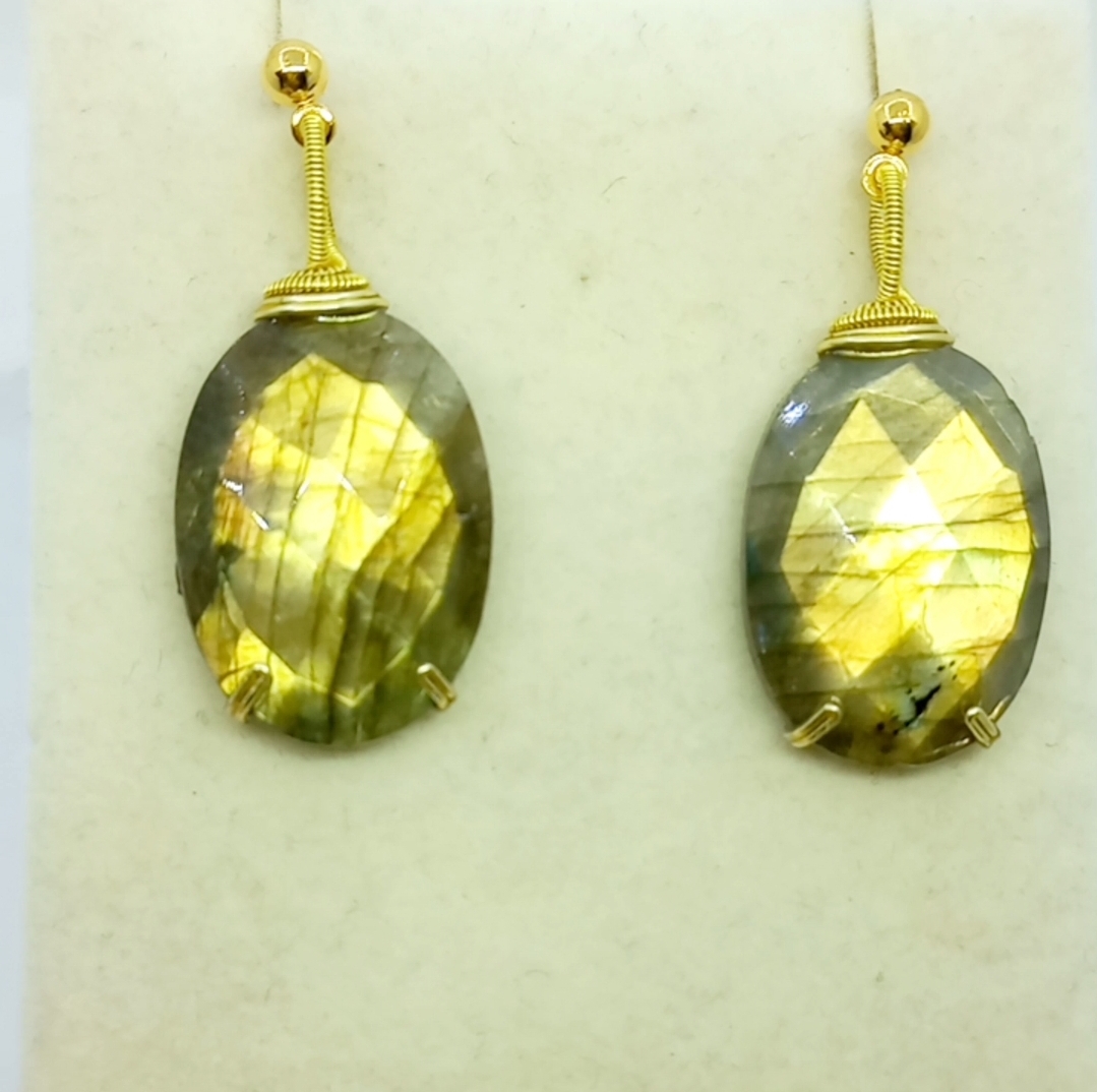 Faset kesimli Labradorit küpe taşlar ve altın kaplamalı materyaller birlikte kullanılarak tasarlanmış EL YAPIMI küpe.