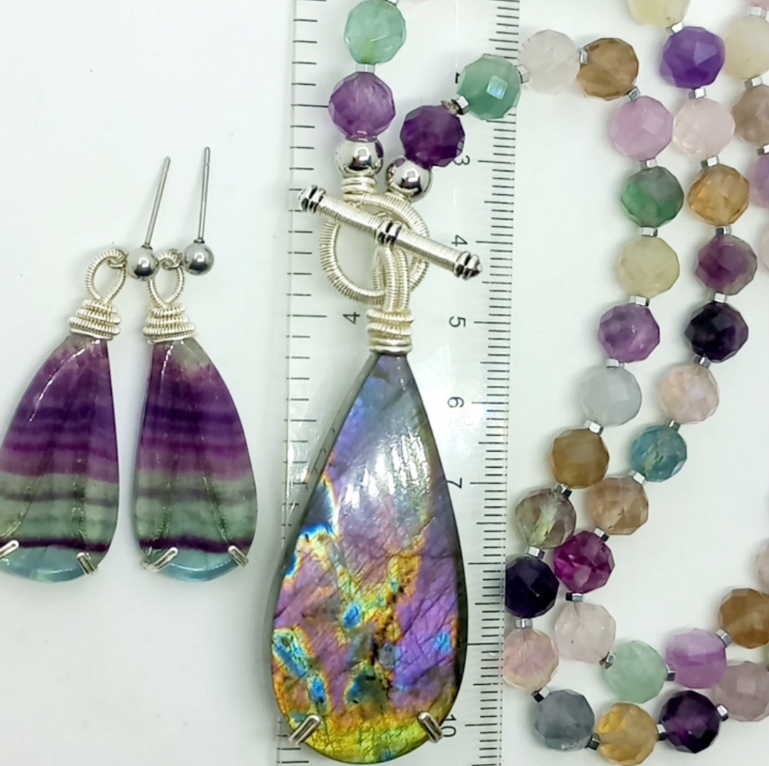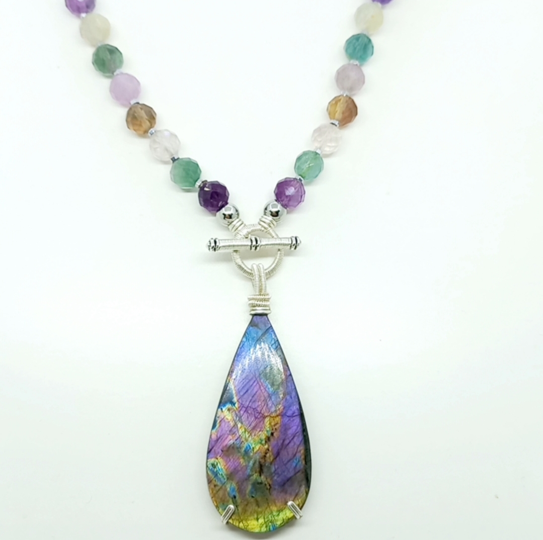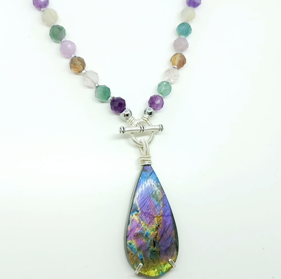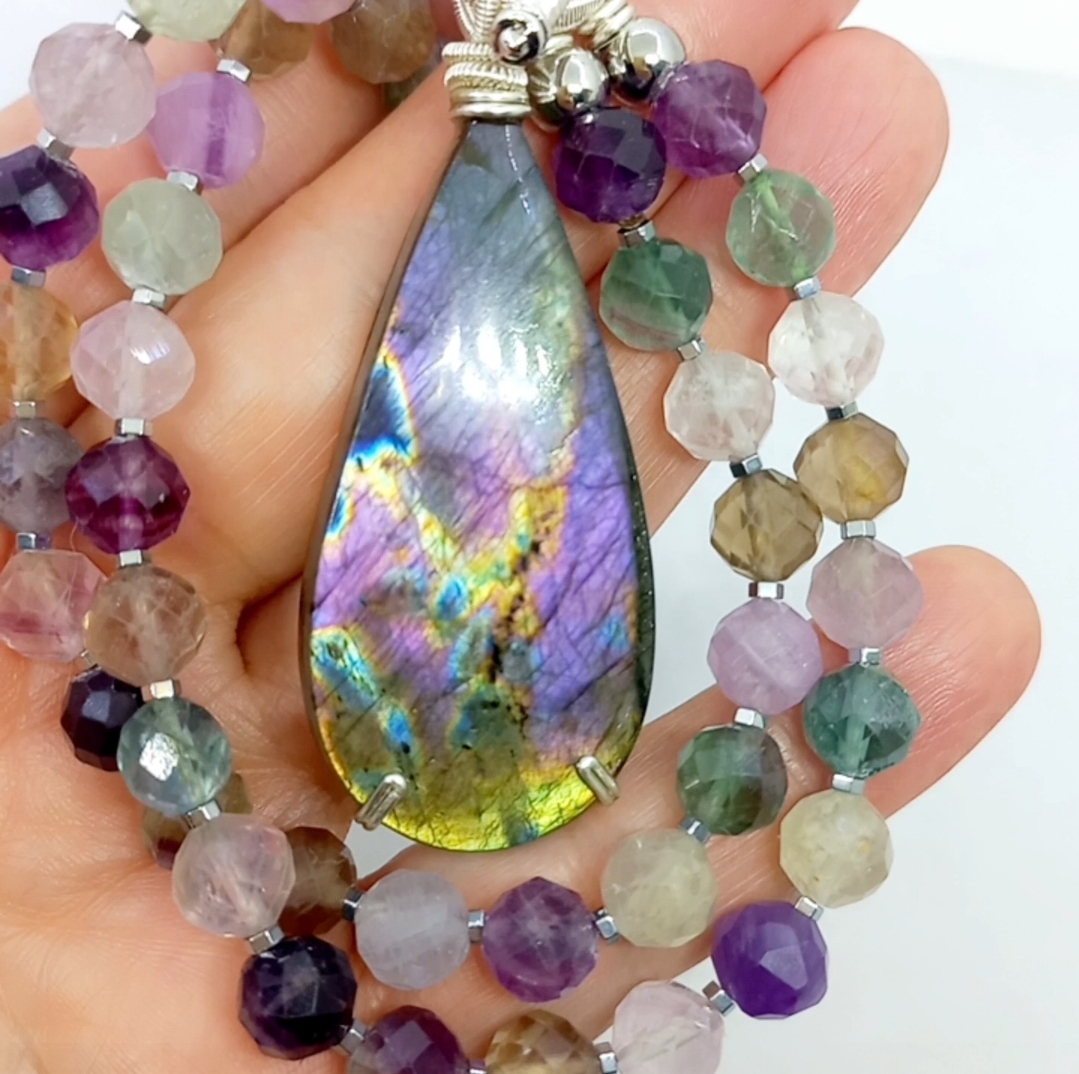 Labradorit kolye uç; sekiz milim ebatlı faset kesim Florit, Hematit taşlar ile çalışılarak, el yapımı gümüş kaplama ”T” kapama eklenip 55 cm uzunluğunda tasarlanmış EL YAPIMI kolye.