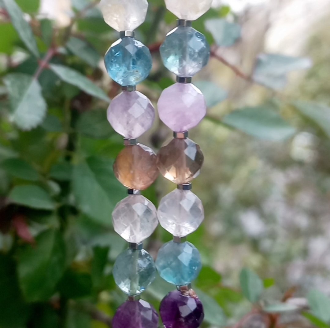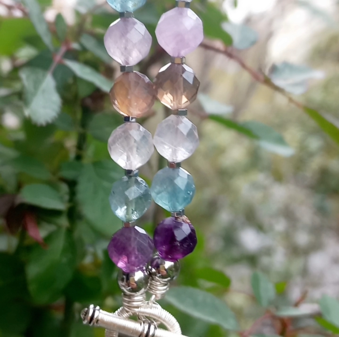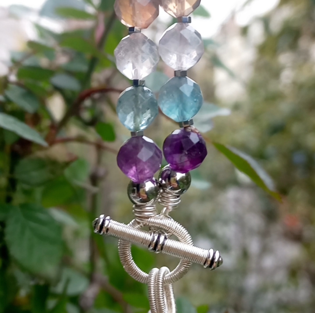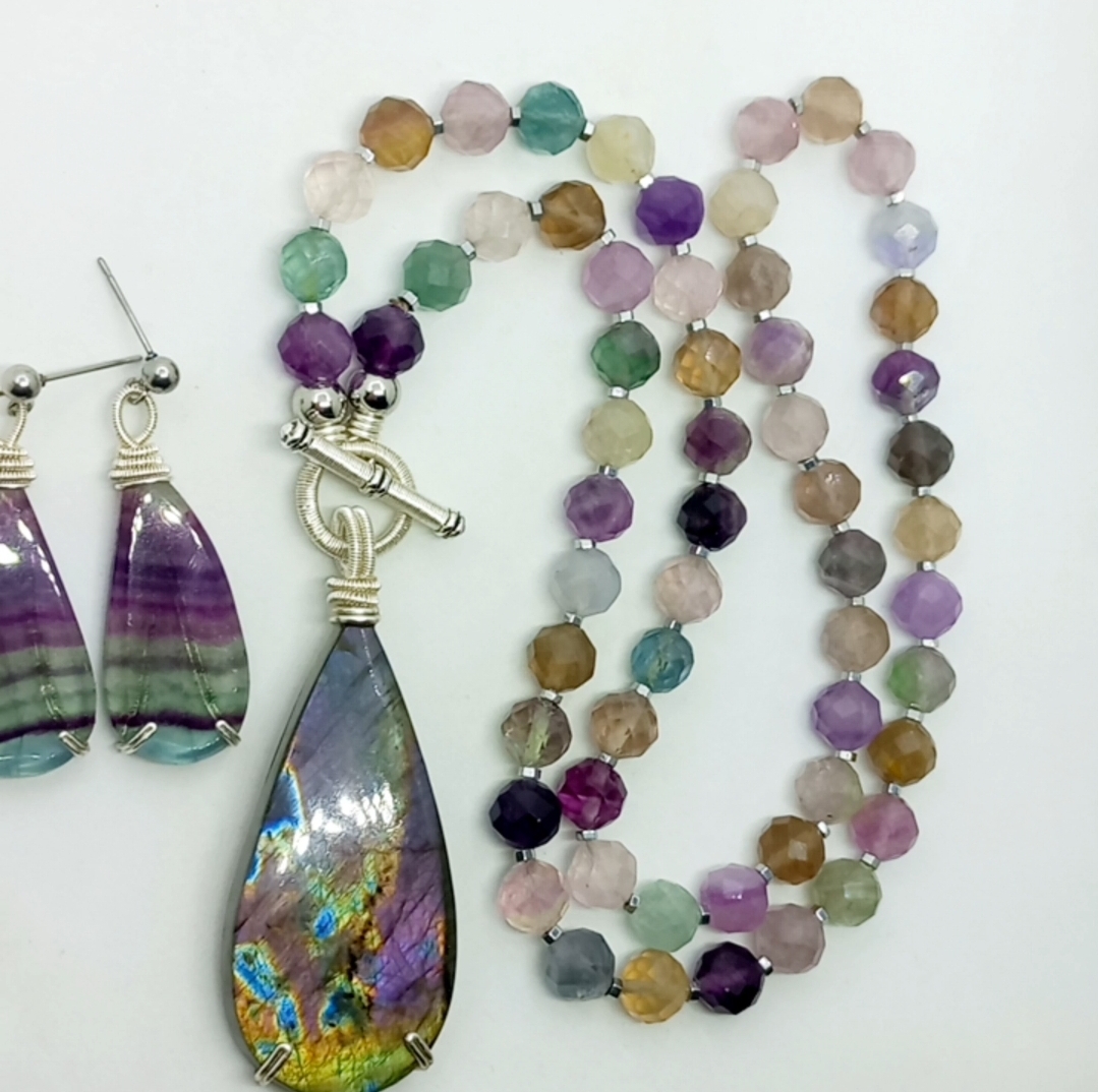 Labradorit kolye uç; sekiz milim ebatlı faset kesim Florit, Hematit taşlar ile çalışılarak, el yapımı gümüş kaplama ”T” kapama eklenip 55 cm uzunluğunda tasarlanmış EL YAPIMI kolye.