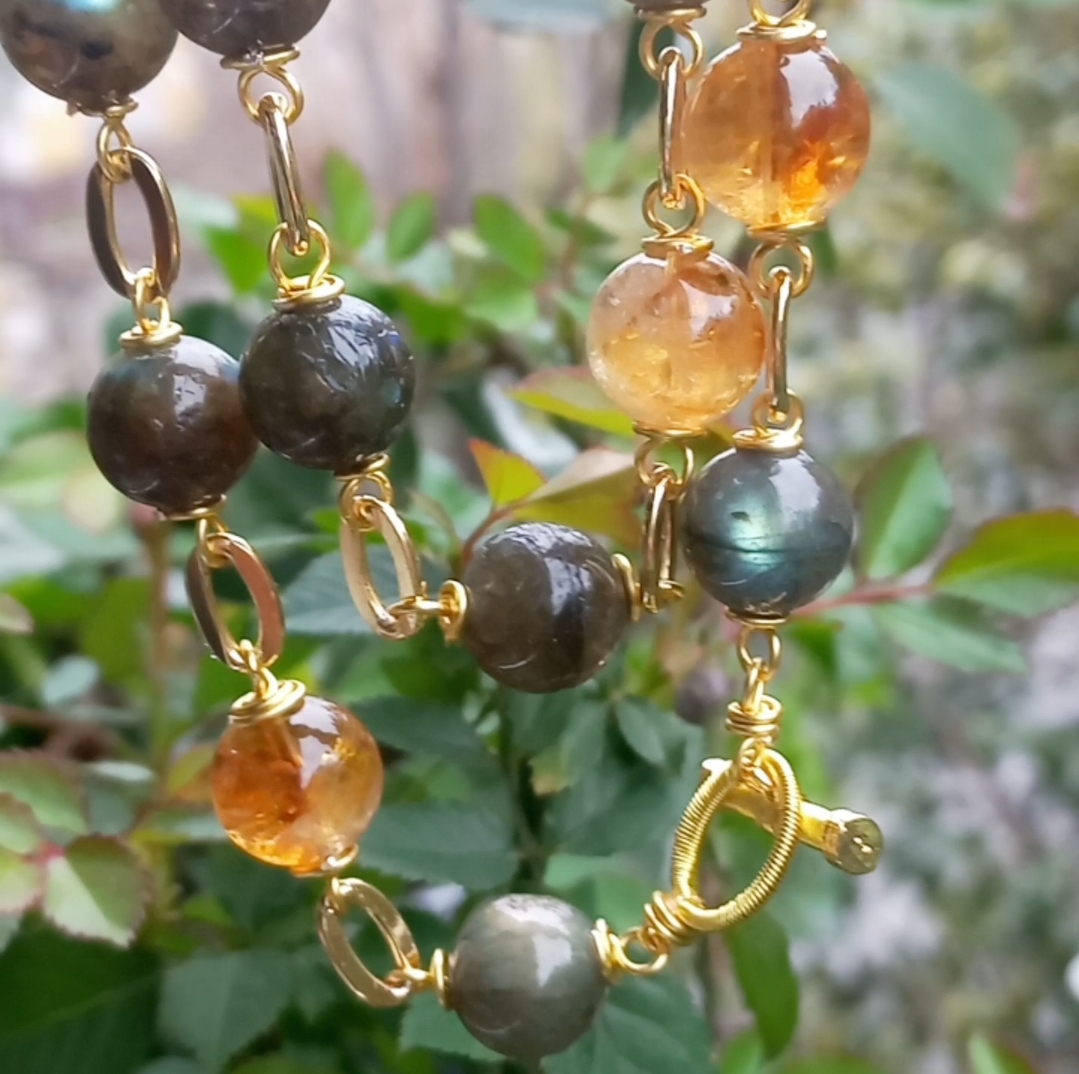 On iki milim ebatlı Labradorit ve Sitrin taşlar; el yapımı altın kaplama ”T” kapama eklenerek, altın kaplama materyaller ile 100 cm uzunluğunda tasarlanmış EL YAPIMI uzun kolye.