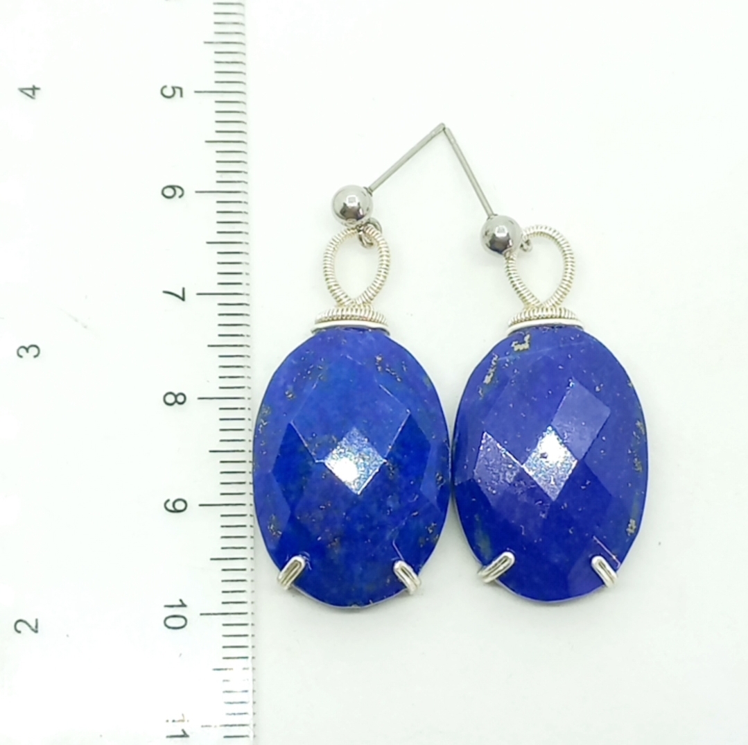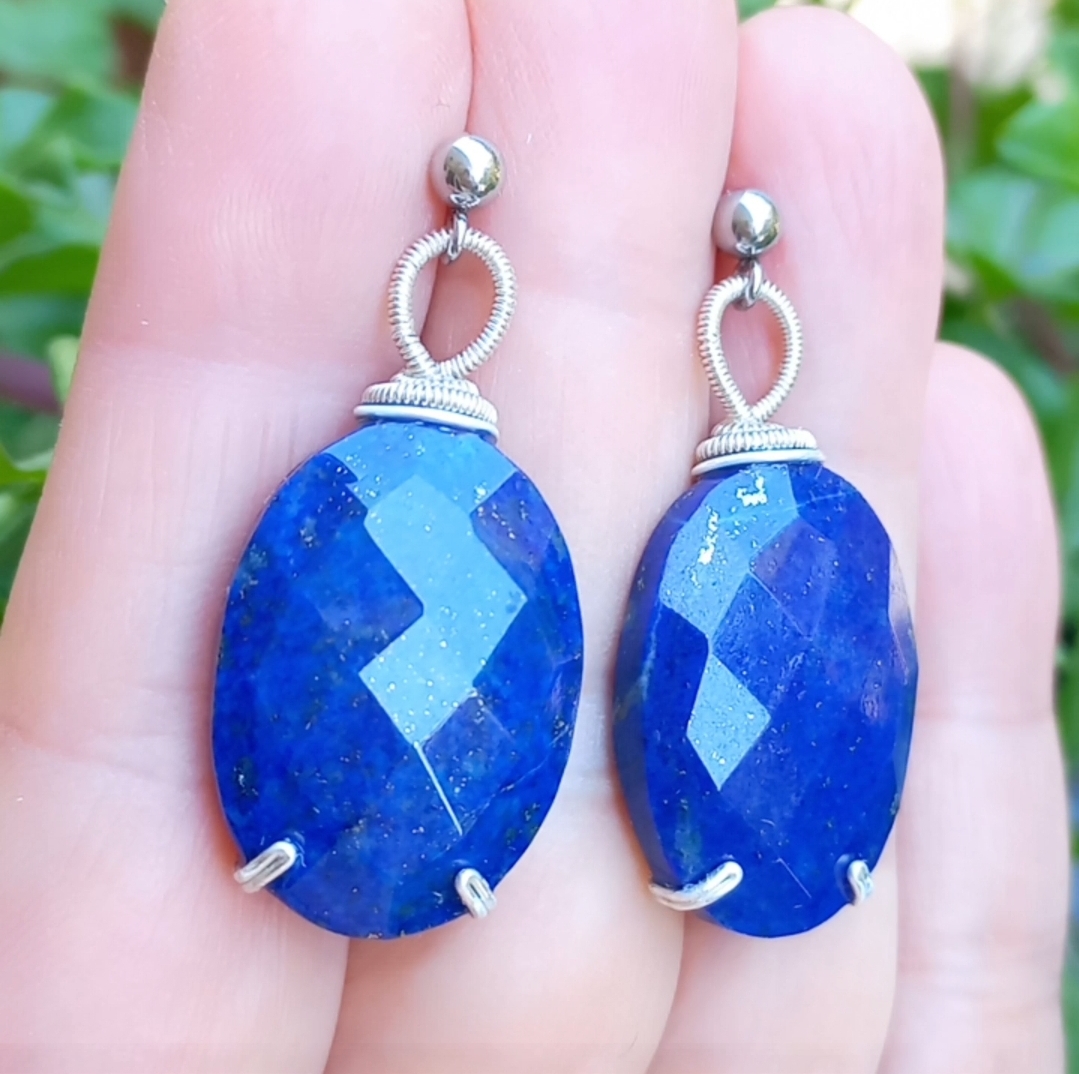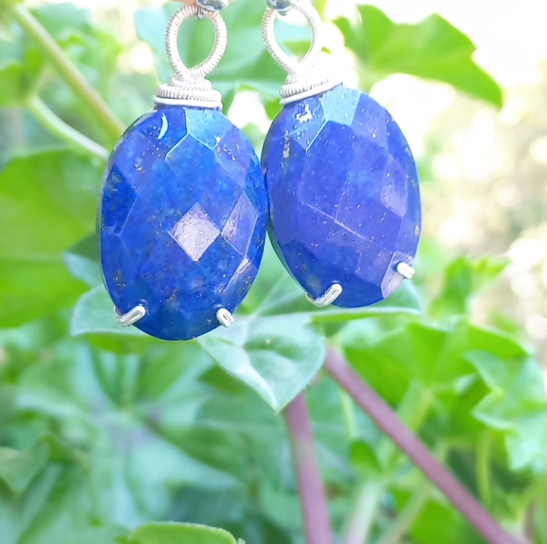 Faset kesimli Lapislazuli taşlar; çelik aparat ve gümüş kaplama materyaller ile çalışılarak tasarlanmış EL YAPIMI küpe.