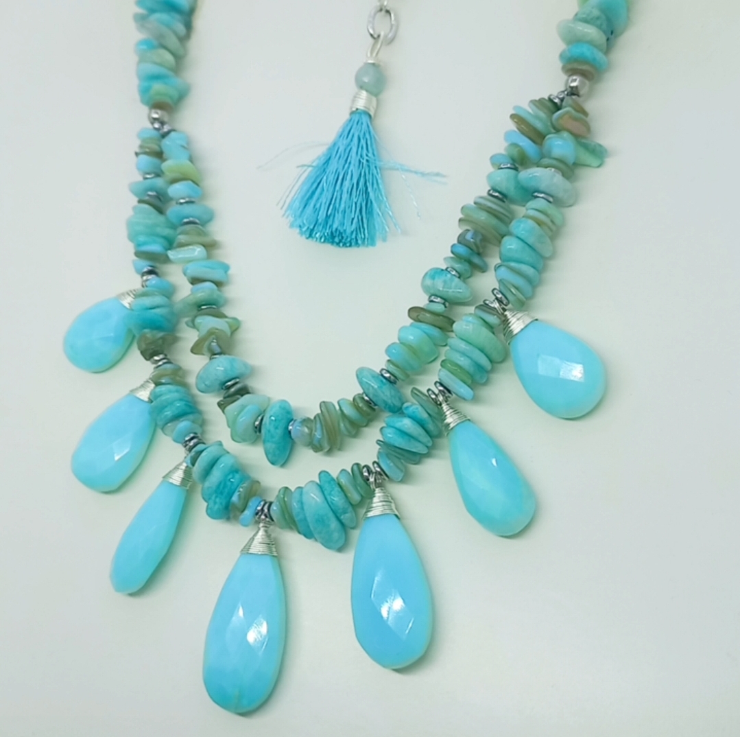 Faset kesimli damla Opal kolye taşlar; Sedef, Amazonit ve Hematit taşlar ile çalışılarak 48 cm uzunluğunda ve çift sıra olarak tasarlanıp, gümüş kaplama materyaller ile tamamlanmış EL YAPIMI kolye. Bir adet üretilmiş olup seçiminiz SİZE ÖZEL olacaktır.