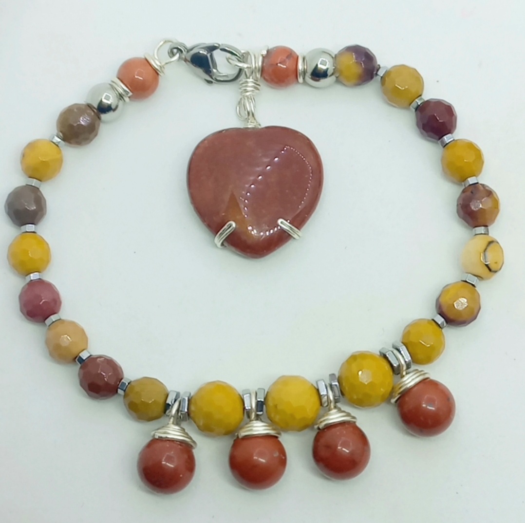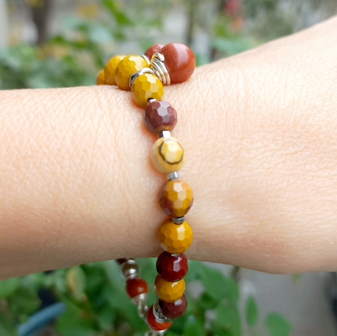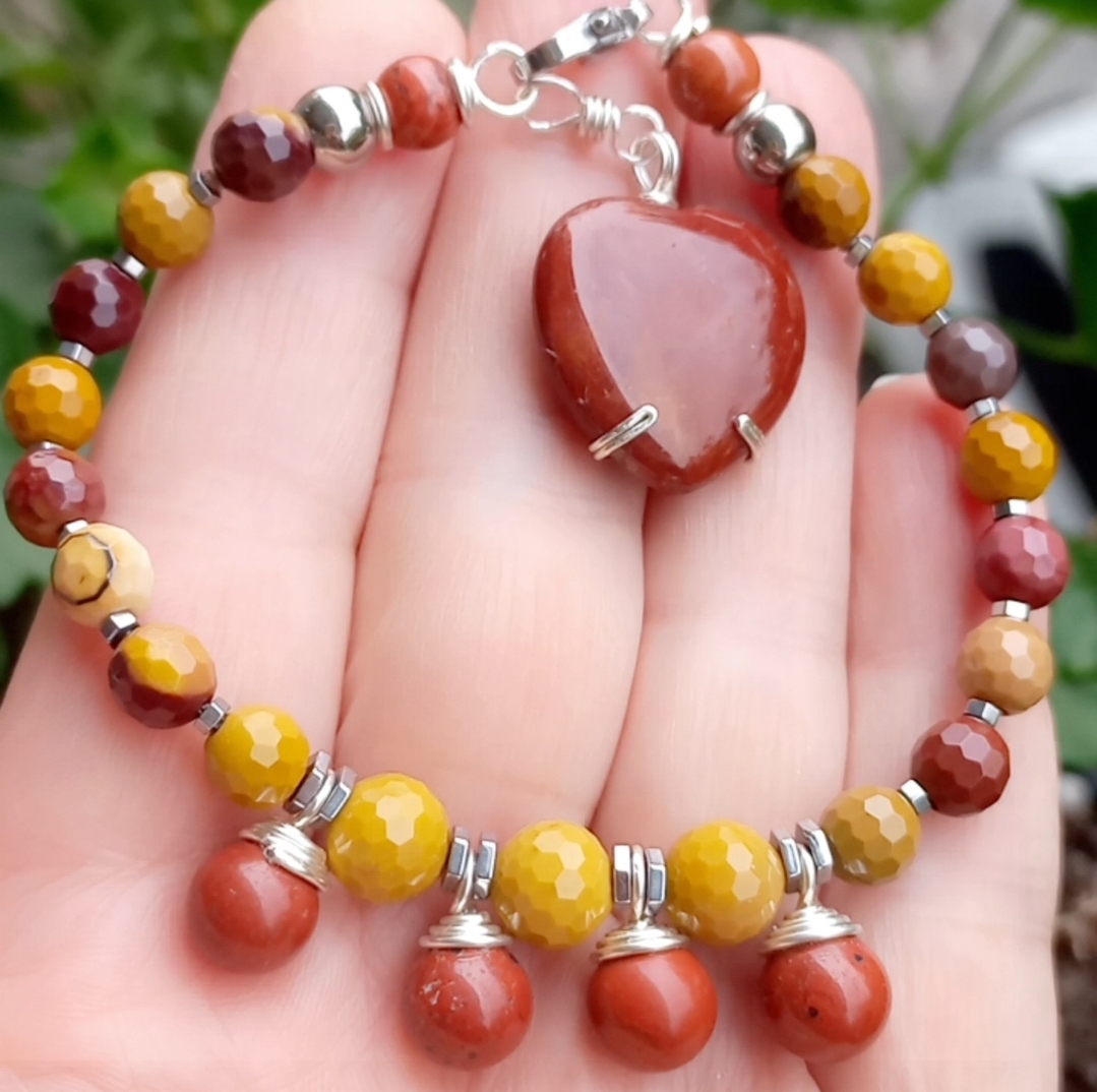 Sekiz milim ebatlı faset kesim Mookaite Jasper ve kırmızı Jasper taşlar; Hematit, çelik aparat ve gümüş kaplama materyaller ile beraber çalışılarak 19-20 cm uzunluğunda tasarlanmış EL YAPIMI bileklik.