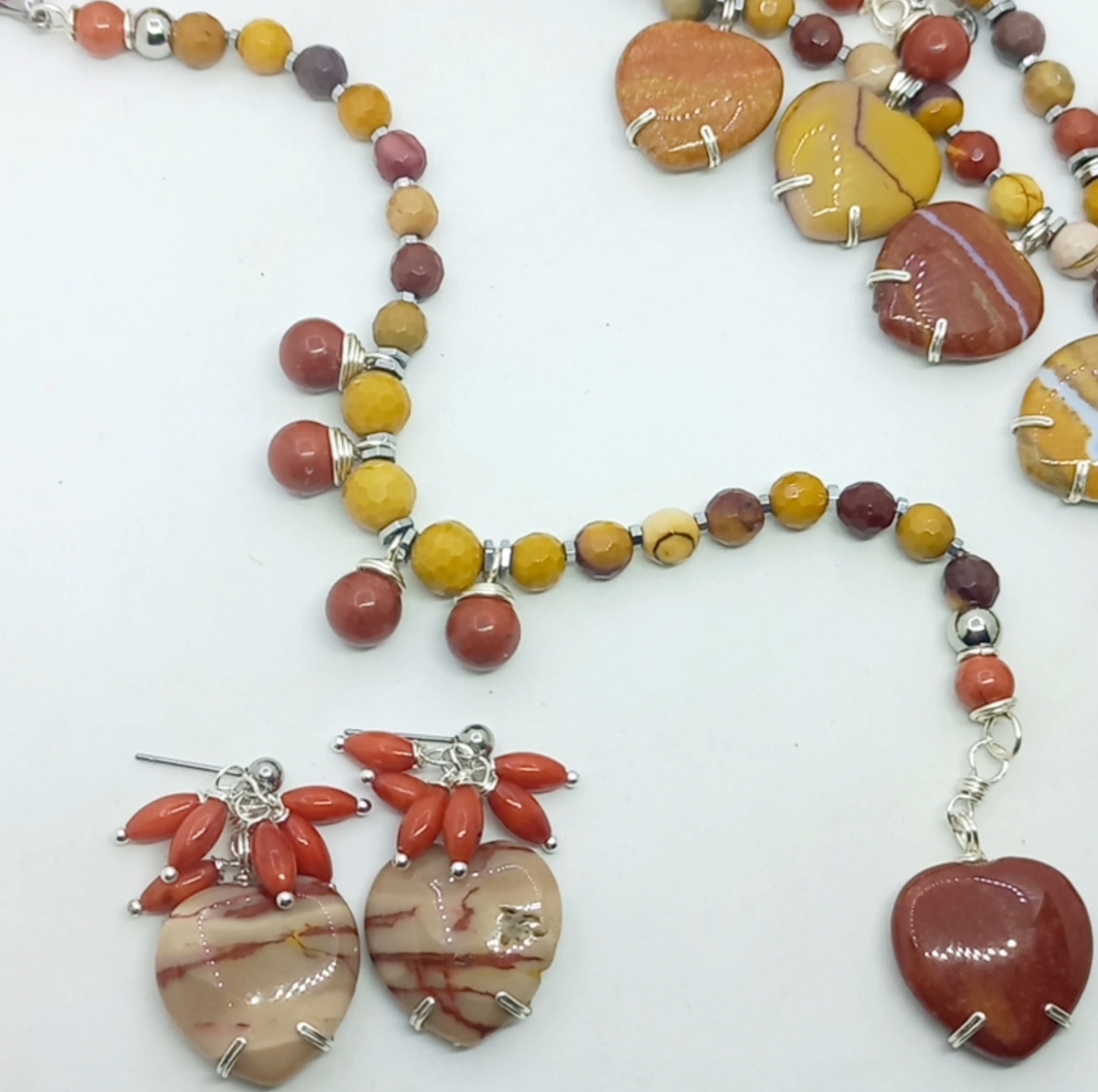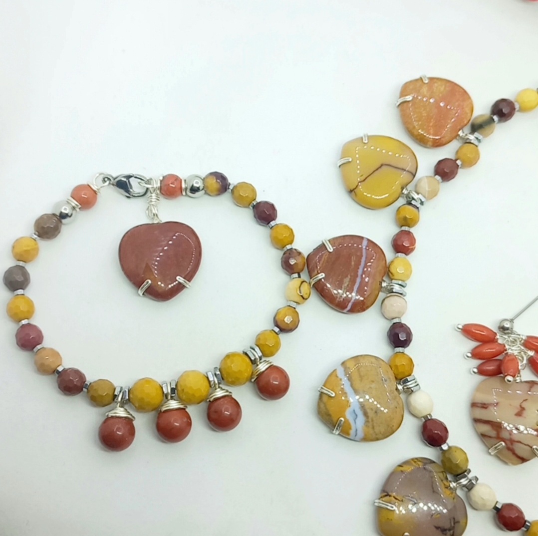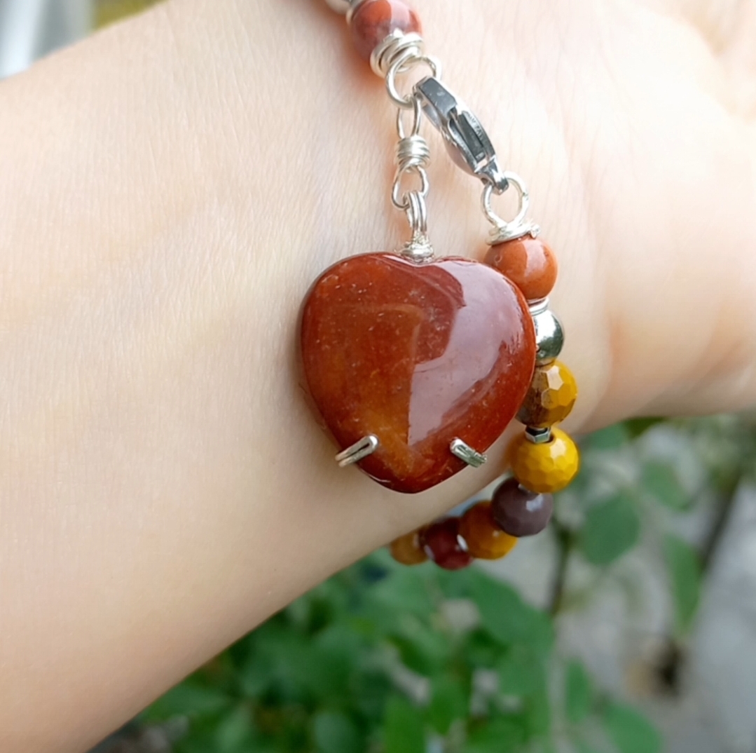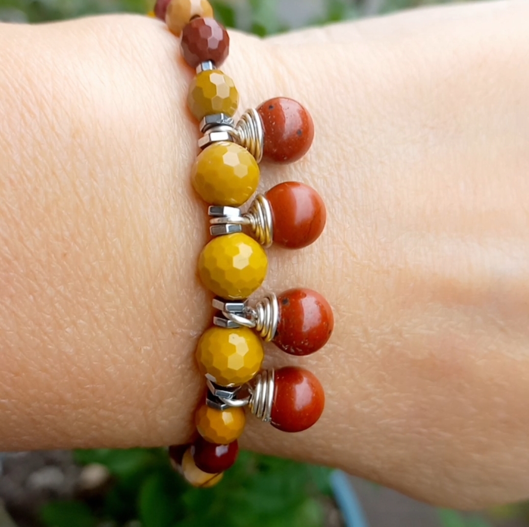 Sekiz milim ebatlı faset kesim Mookaite Jasper ve kırmızı Jasper taşlar; Hematit, çelik aparat ve gümüş kaplama materyaller ile beraber çalışılarak 19-20 cm uzunluğunda tasarlanmış EL YAPIMI bileklik.
