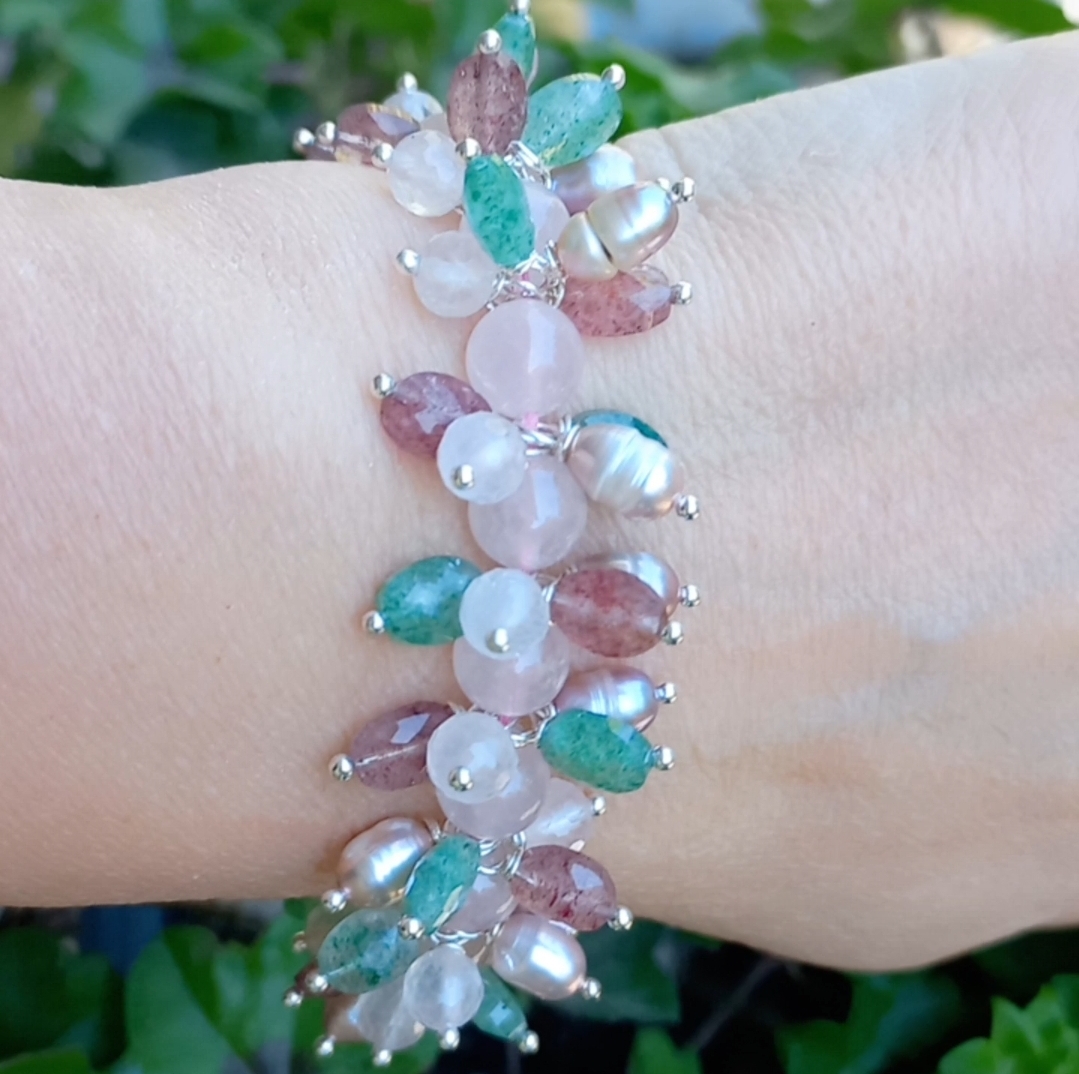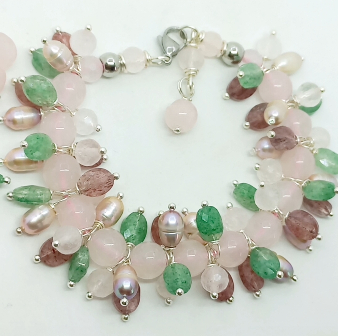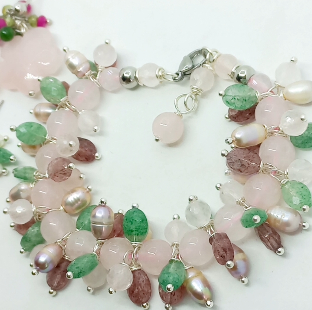 Pembe ve yeşil Kuvars doğal İnci çelik aparatlı el yapımı bileklik