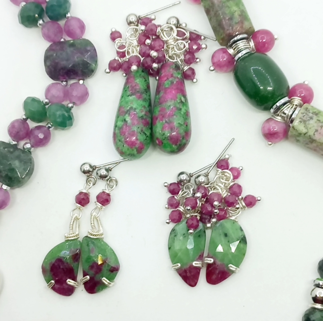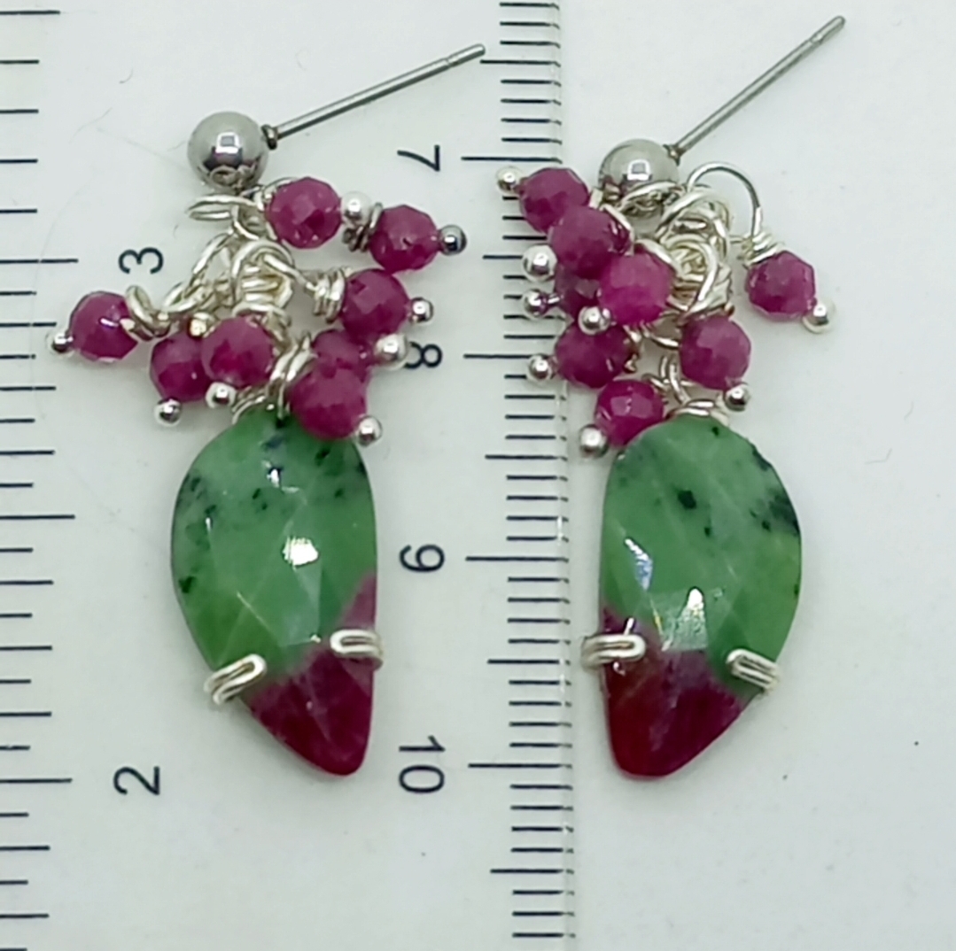 Rubyzoisit küpe taşlar; faset kesim üç milim ebatlı ham Yakut taşlar ile birlikte çalışılarak, çelik ve gümüş kaplama aparatlar ile tamamlanmış EL YAPIMI küpe
