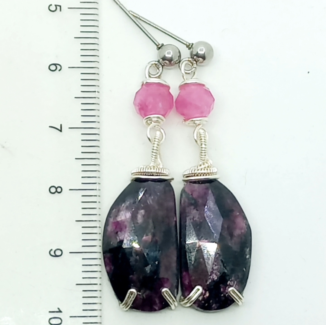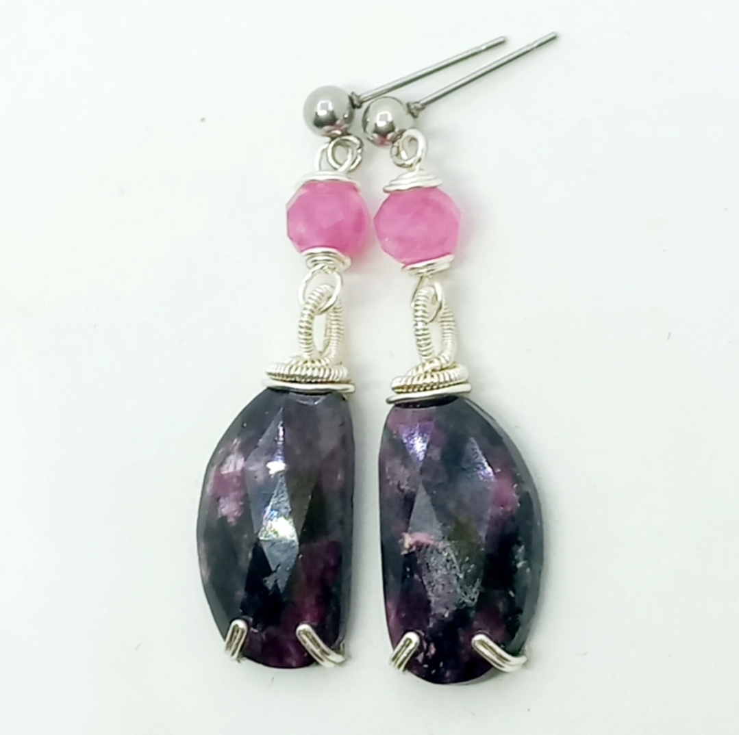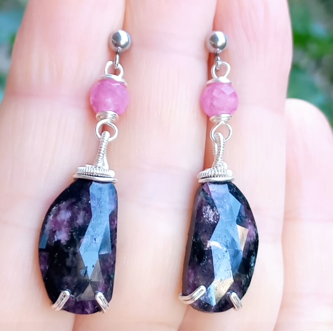 Faset kesimli Safir küpe taşlar; pembe renkli Kuvars, çelik aparat ve gümüş kaplama materyaller ile birlikte çalışılarak tasarlanmış EL YAPIMI küpe.