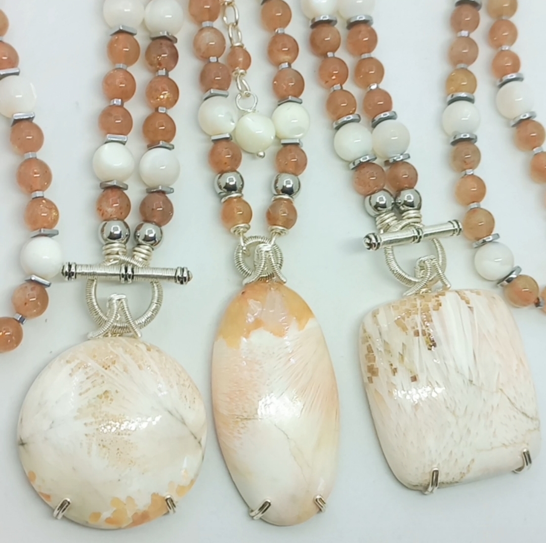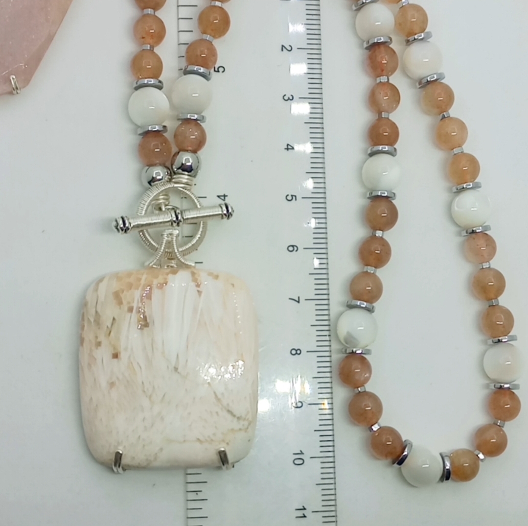 Scolocite kolye uç; altı milim ebatlı Güneş taşı, sekiz milim ebatlı Sedef ve hematit taşlar ile çalışılarak, el yapımı gümüş kaplama ” T ” kapama eklenip 54 cm uzunluğunda tasarlanmış EL YAPIMI kolye. Bir adet üretilmiştir, seçiminiz SİZE ÖZEL olacaktır.