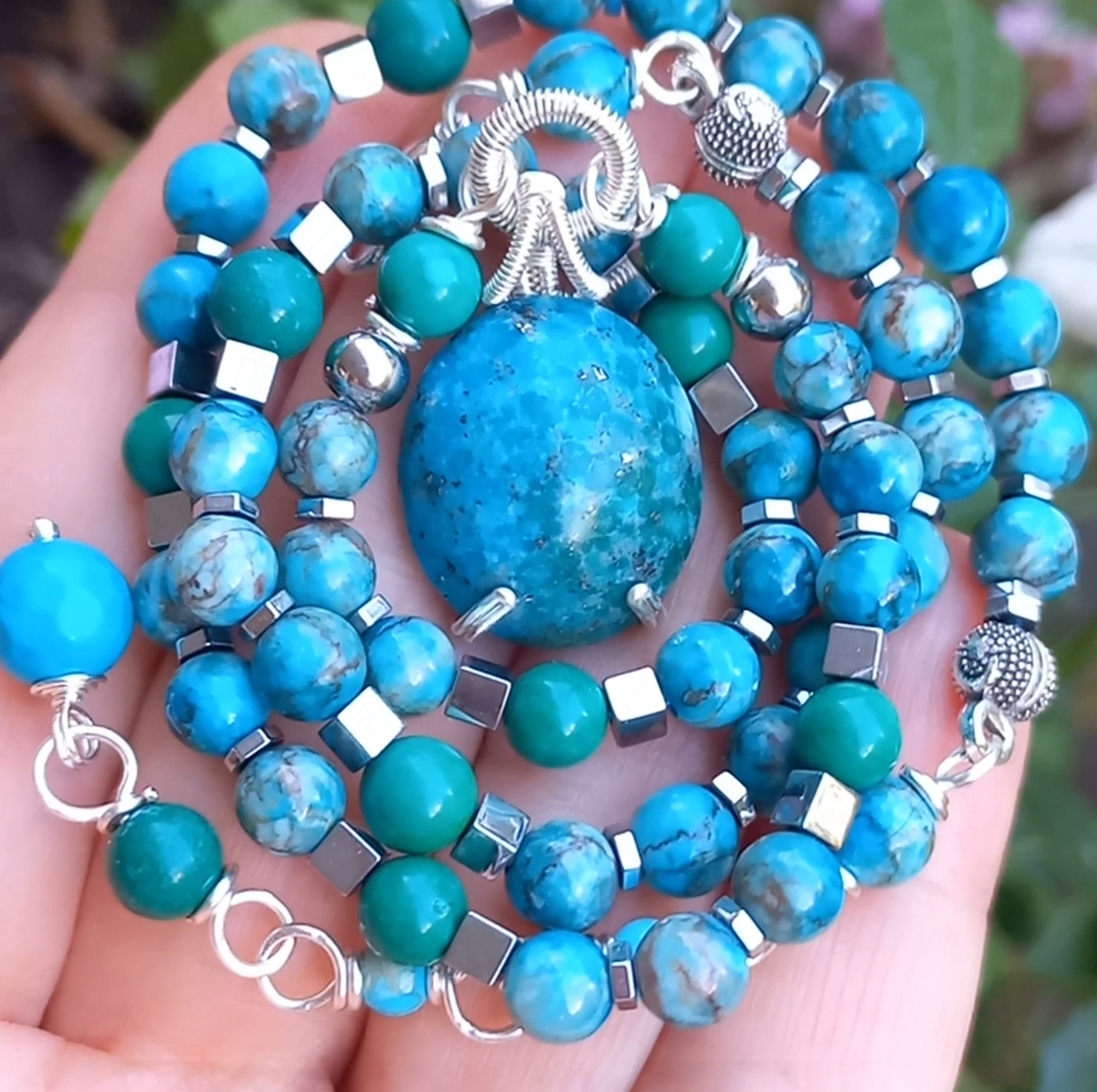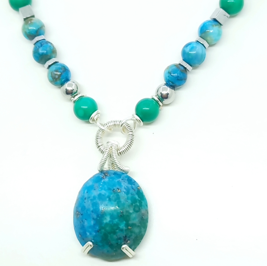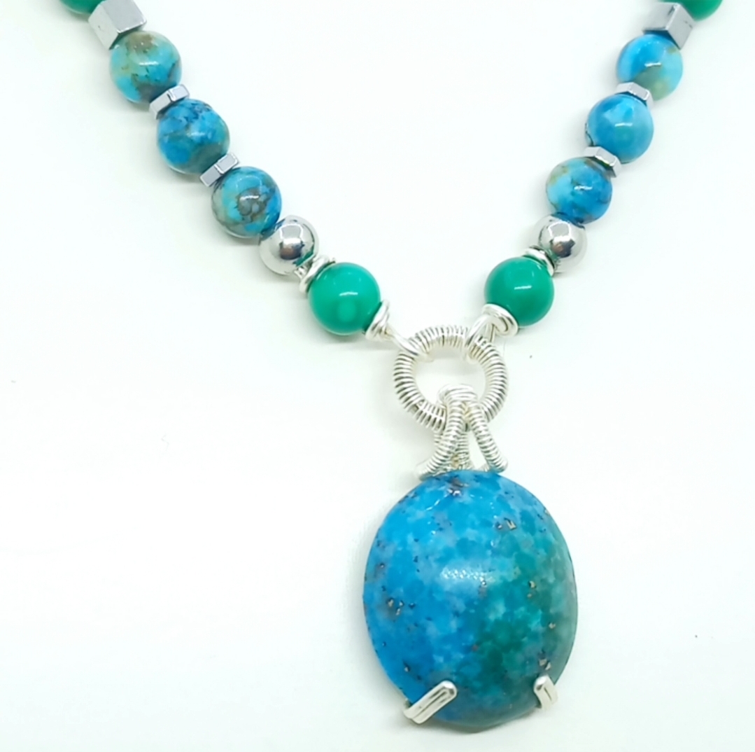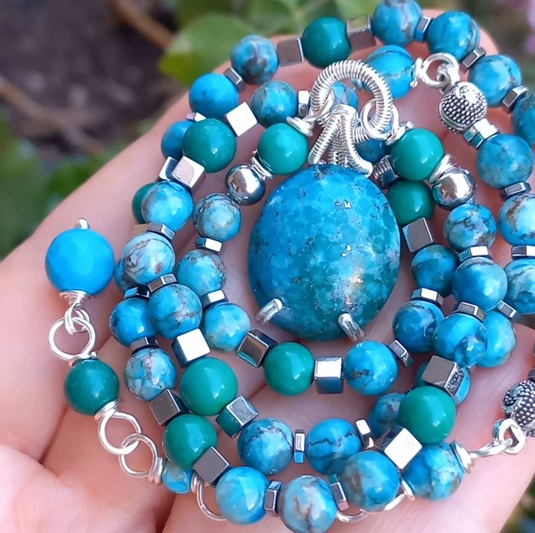 Turkuaz kolye uç; altı milim ebatlı Amerikan Jasper, sıkma Turkuaz ve Hematit taşlar beraber çalışılarak 50 cm uzunluğunda tasarlanıp, gümüş kaplama materyaller ile tamamlanmış EL YAPIMI kolye. Bir adet üretilmiştir, seçiminiz SİZE ÖZEL olacaktır.