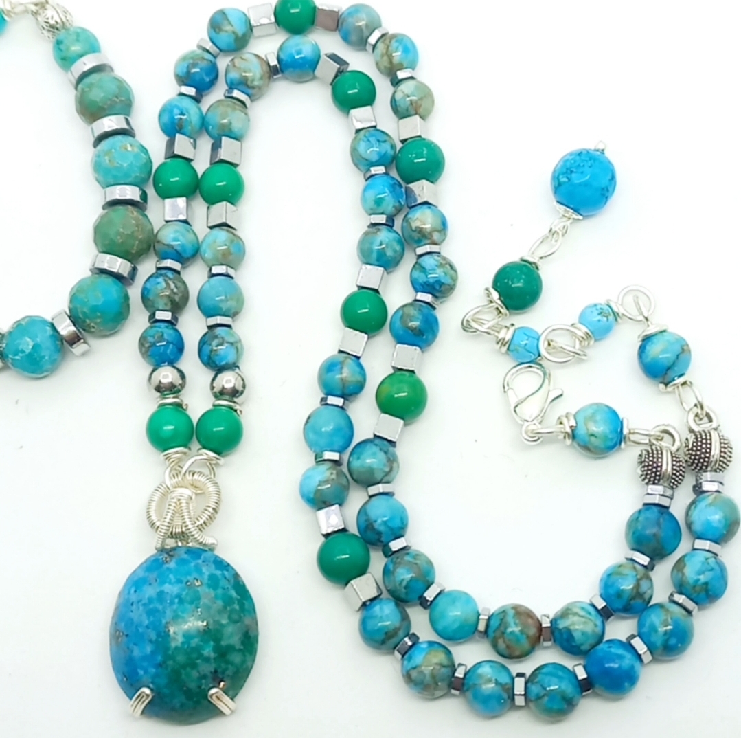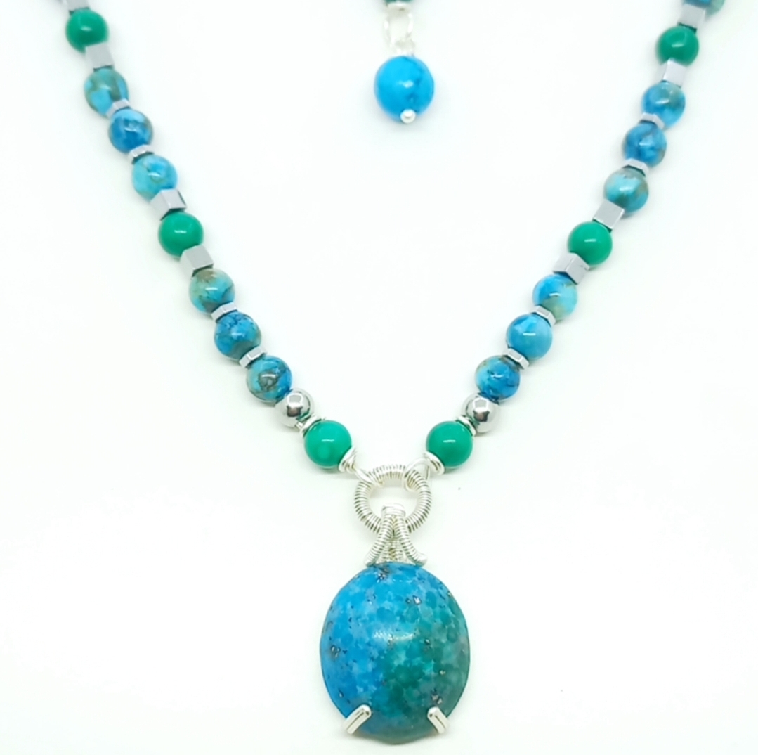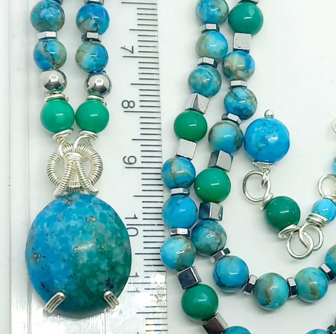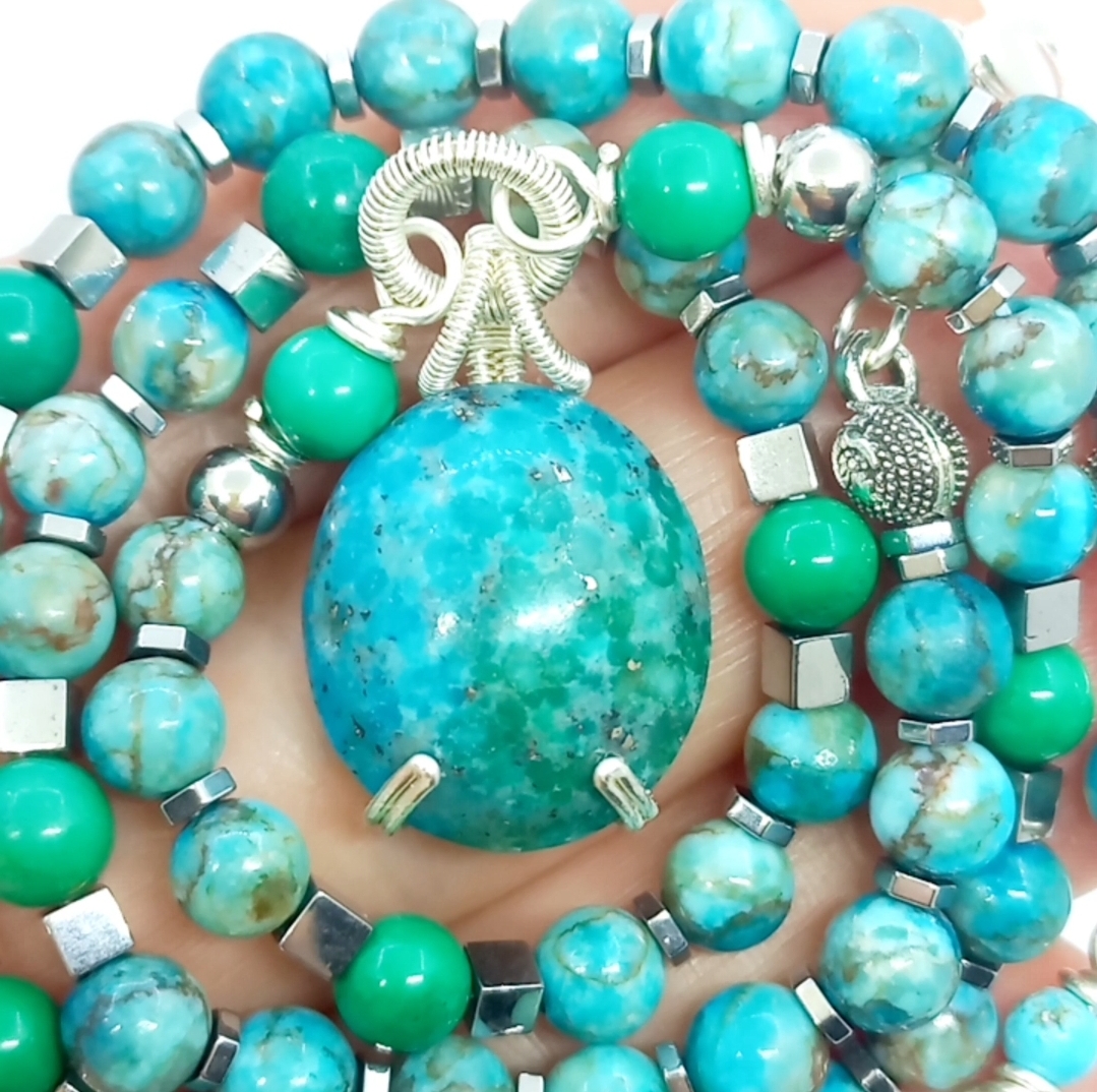 Turkuaz kolye uç; altı milim ebatlı Amerikan Jasper, sıkma Turkuaz ve Hematit taşlar beraber çalışılarak 50 cm uzunluğunda tasarlanıp, gümüş kaplama materyaller ile tamamlanmış EL YAPIMI kolye. Bir adet üretilmiştir, seçiminiz SİZE ÖZEL olacaktır.