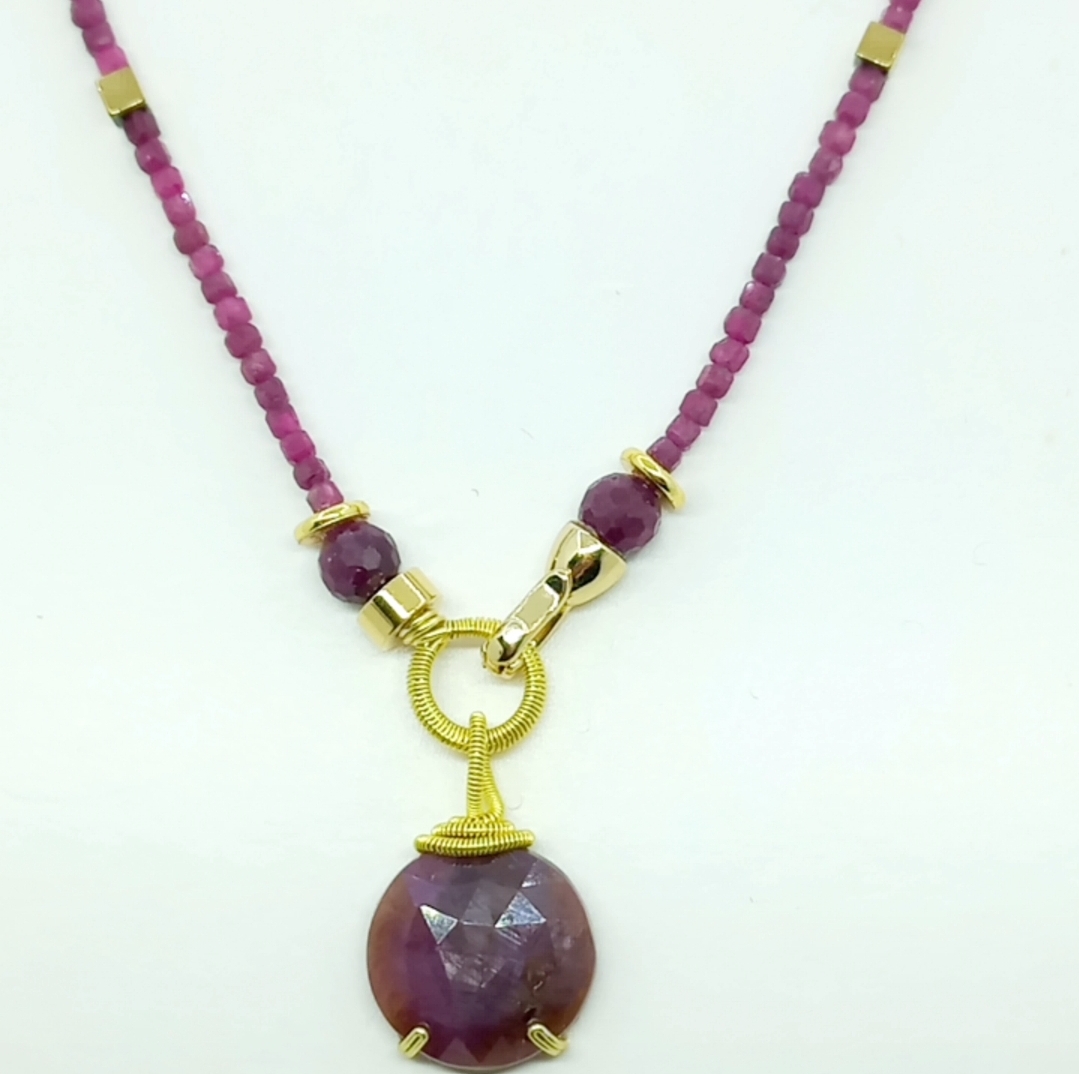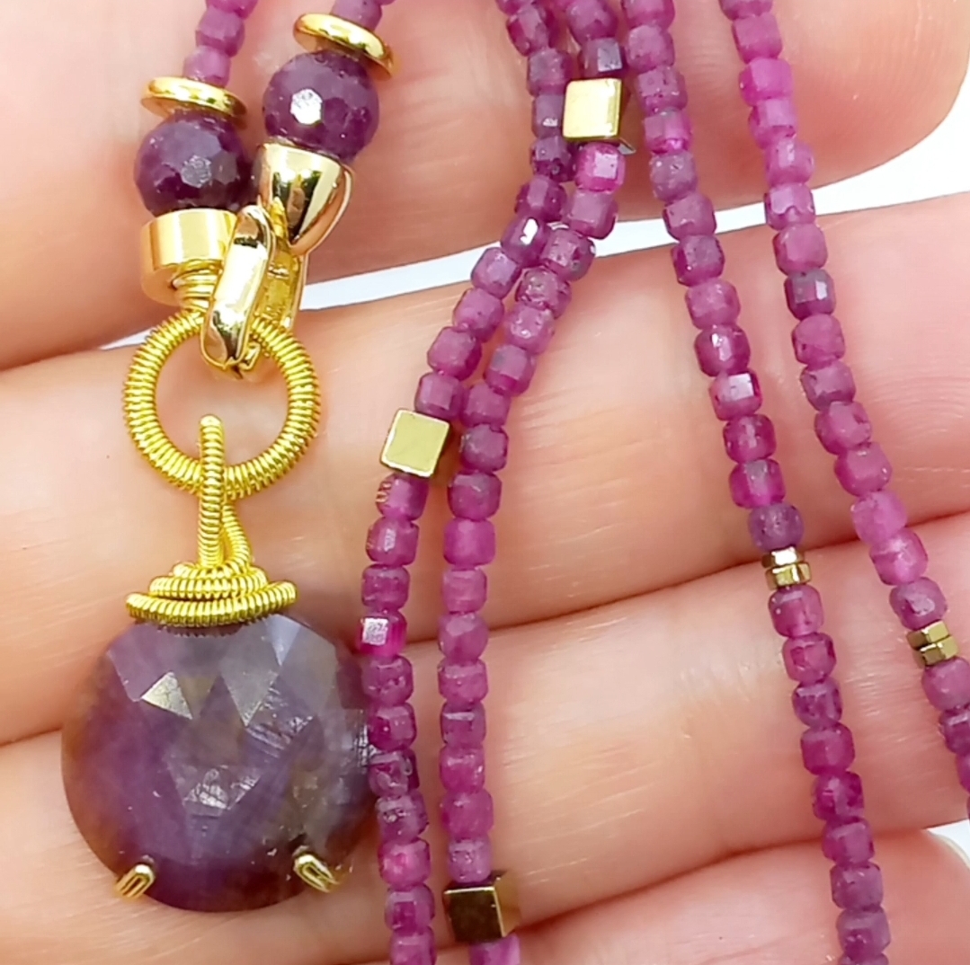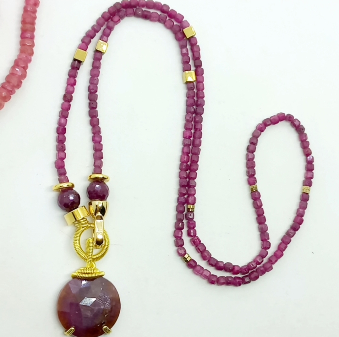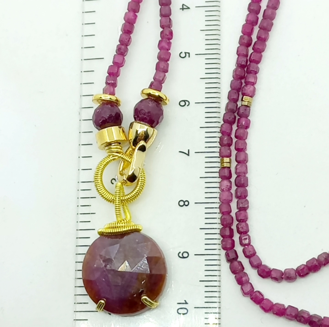 Faset kesimli Yakut kolye uç; iki milim ebatlı küp faset kesim Yakut kordon taşlar ve iki adet altı milim ebatlı faset kesim Yakut son taşlar ile birlikte çalışılarak, altın kaplama materyaller ile 45 cm uzunluğunda tasarlanmış EL YAPIMI kolye.
