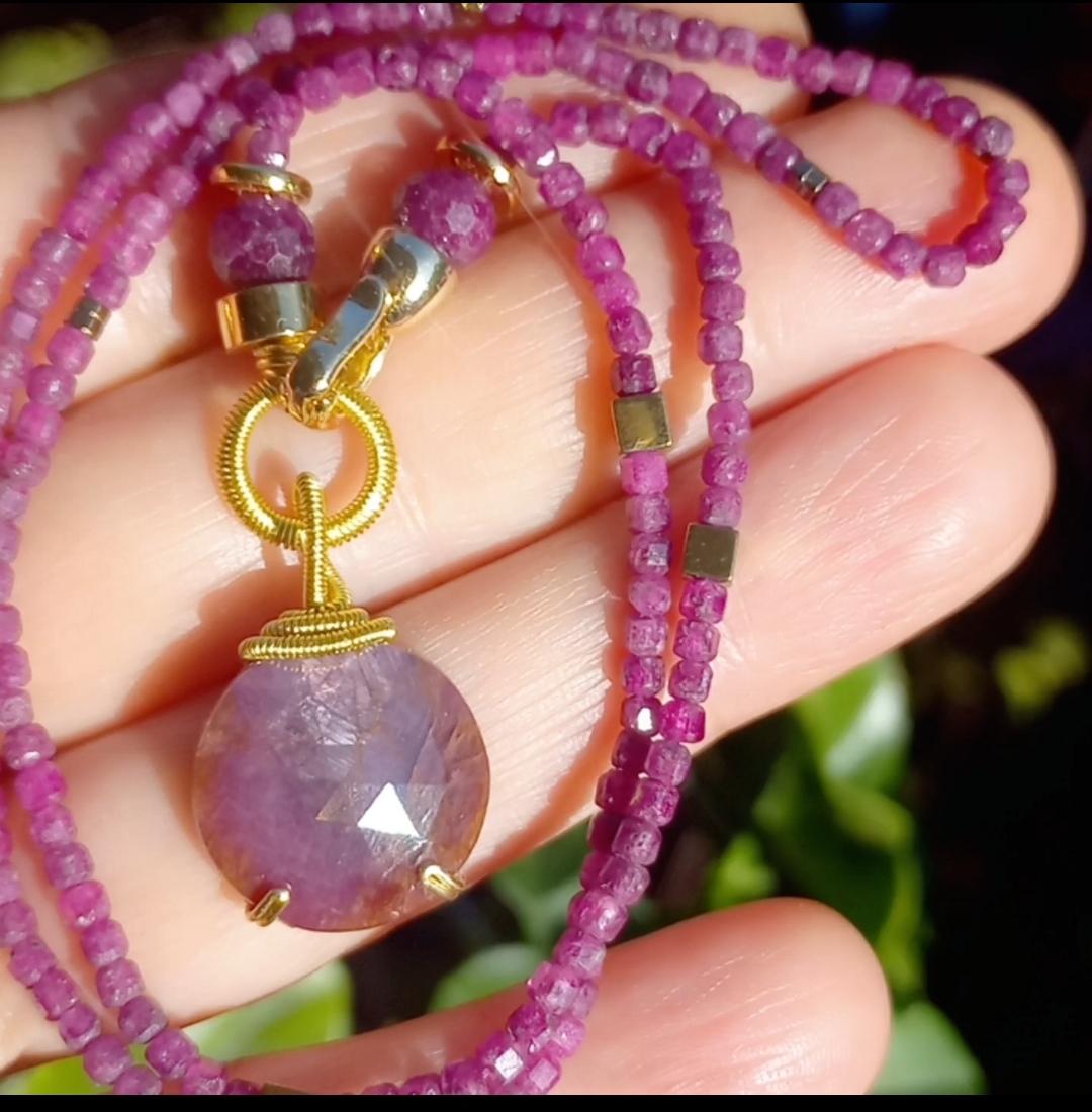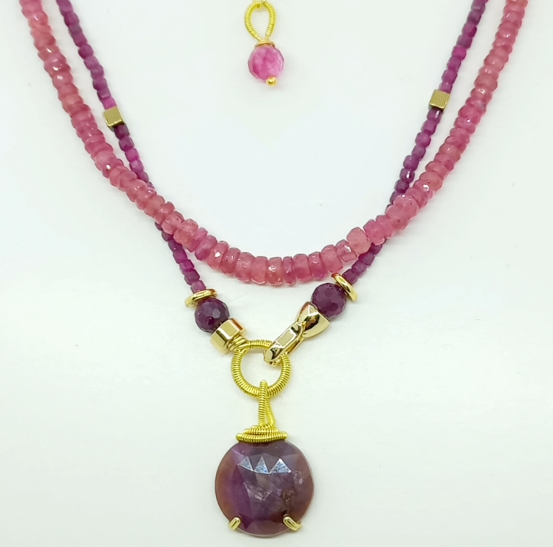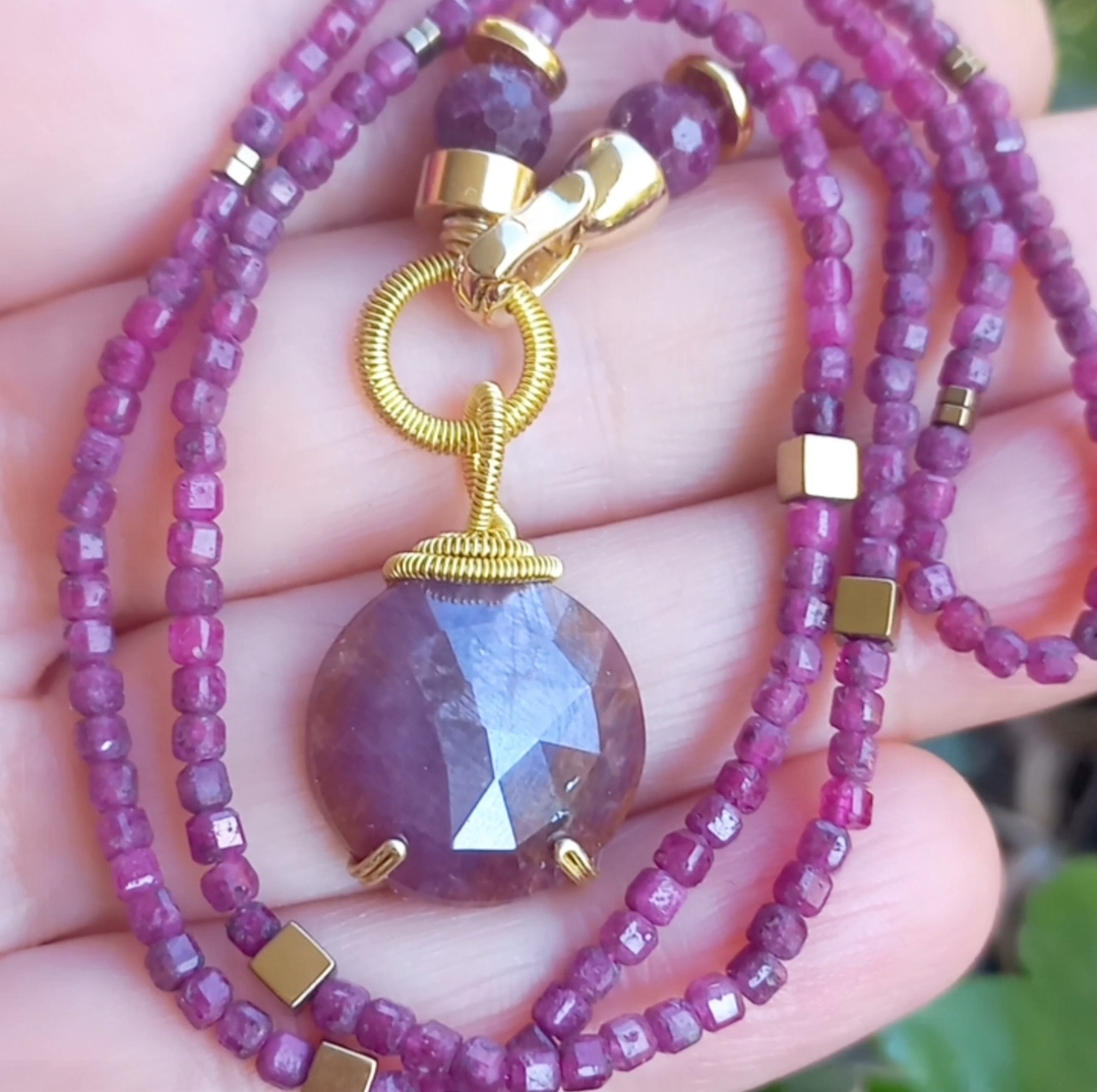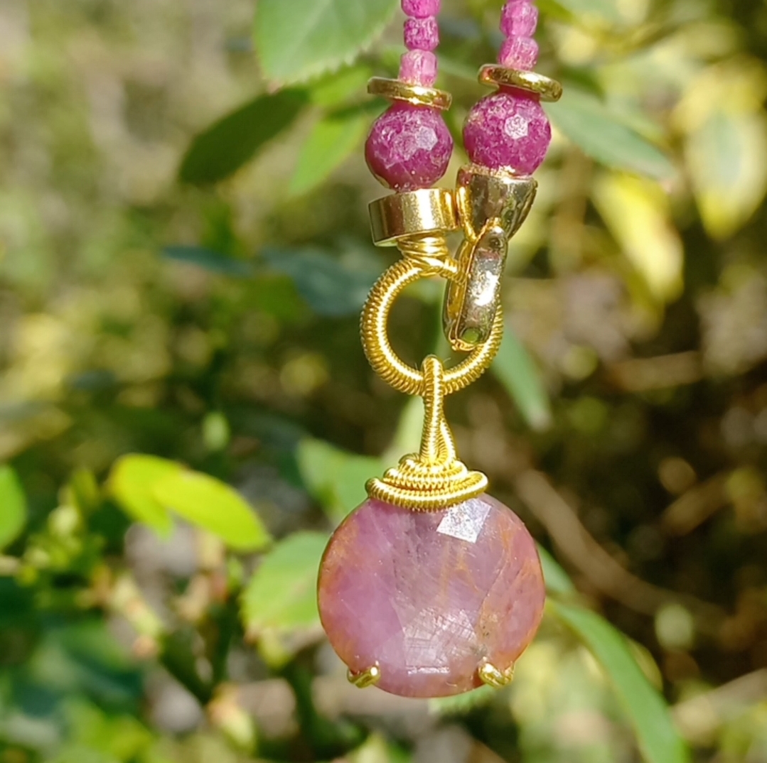 Faset kesimli Yakut kolye uç; iki milim ebatlı küp faset kesim Yakut kordon taşlar ve iki adet altı milim ebatlı faset kesim Yakut son taşlar ile birlikte çalışılarak, altın kaplama materyaller ile 45 cm uzunluğunda tasarlanmış EL YAPIMI kolye.