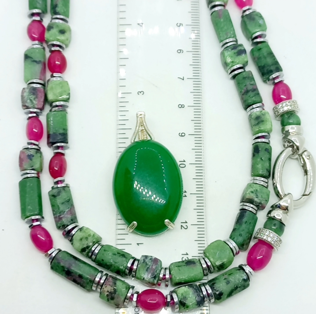 Portatif Yeşim kolye uç; bir cm ebatlı küp ve silindir Ruby Zoisit, Ceyd, iki adet Zirkonlu rondela taşlar birlikte çalışılarak, düğüm tekniğiyle dizilip gümüş kaplama materyaller ile 100 cm uzunluğunda tasarlanmış el yapımı kolye. İsteğe göre dolamalı çift sıra olarak ta kullanılabilir.
